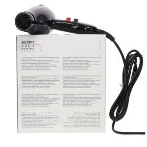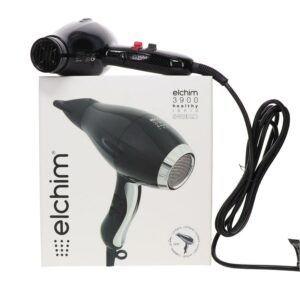 Elchim 3900 Healthy Ionic Dryer – Black/Silver. Powerful & effective. Dying time reduced by more than 30%. Quiet, light and balanced, its air flow hydrates and makes hair glossy thanks to ionic & ceramic system. (LOW EMF). 2 air speed and 3 temperatures.