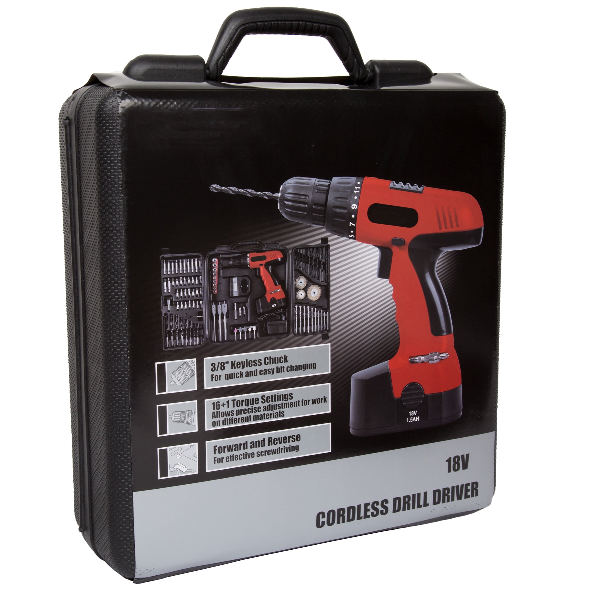 VERSATILE TOOL SET – The 89 pieces in this drill set include a wide variety of drivers, bits, and sockets, allowing you to choose the best bit for each task. ADJUSTABLE POWER – Choose between 16 torque settings to apply the right amount of power for any material, and run the electric screwdriver in either forward or reverse to easily assemble or disassemble your projects. CORDLESS DESIGN – This cordless drill works on a nickel-cadmium battery that provides up to 5 hours of power per charge, so you can tackle fixes indoor and out. DURABLE CARRYING CASE – A well-designed tool box includes a handle for easy transport and contains dedicated holding spaces for all 89 pieces of the set. This tool kit is a perfect addition to a collection of apartment essentials. PRODUCT DETAILS – Weight: 10 lbs. Drill Voltage: 18V. Battery: 1500 mAh Ni-Cd. Color: Black and Red.