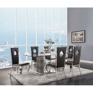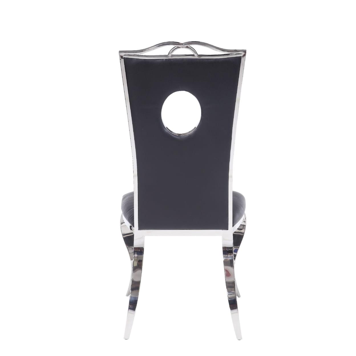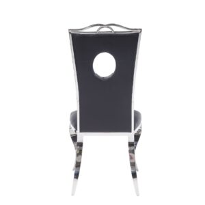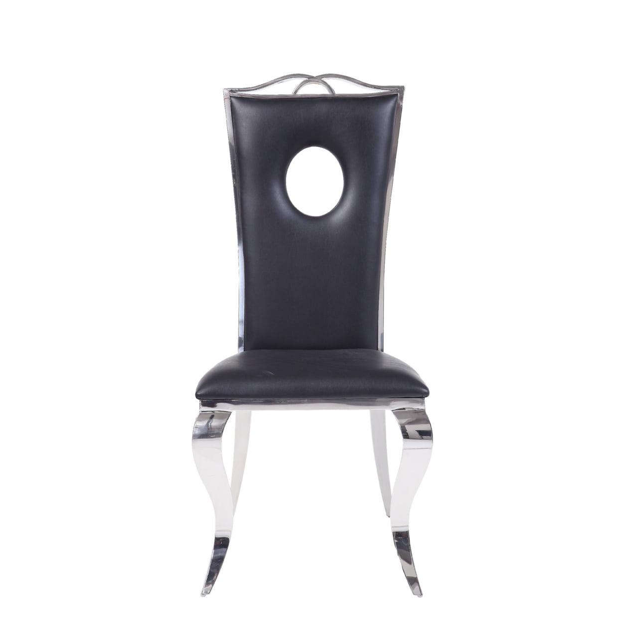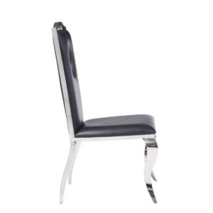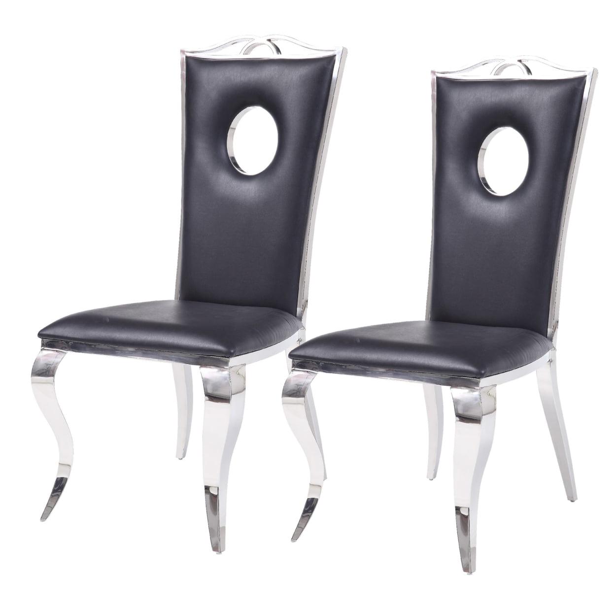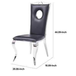 19 Inch Dining Side Chair, Faux Leather, Set of 2, Black, Silver- Saltoro Sherpi Add a touch of sophistication to your dining room ensemble with this two side chair set. Upholstered in an easy to clean black vegan leather, the chairs feature modern design with elegant crown and oval cutouts. A stylish silver finish and stainless steel cabriole style legs make this set irresistible.