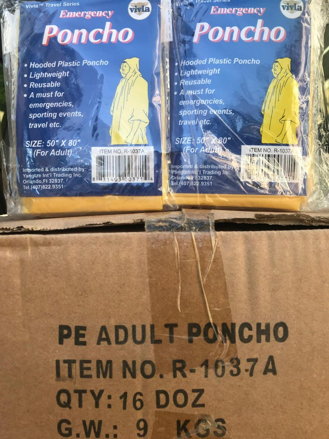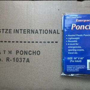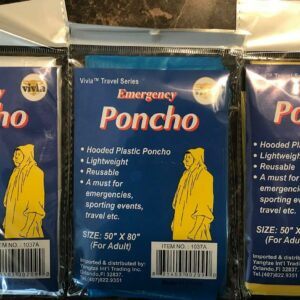 192 PCS POCKET-SIZE EMERGENCY ADULT RAIN PONCHO, SIZE 50″X80″, ONE SIZE FITS ALL. Color : clear, blue, yellow. Packing: individual bag, 12 pcs per dz plastic bag (4 pcs each color); 16 dzs per carton.