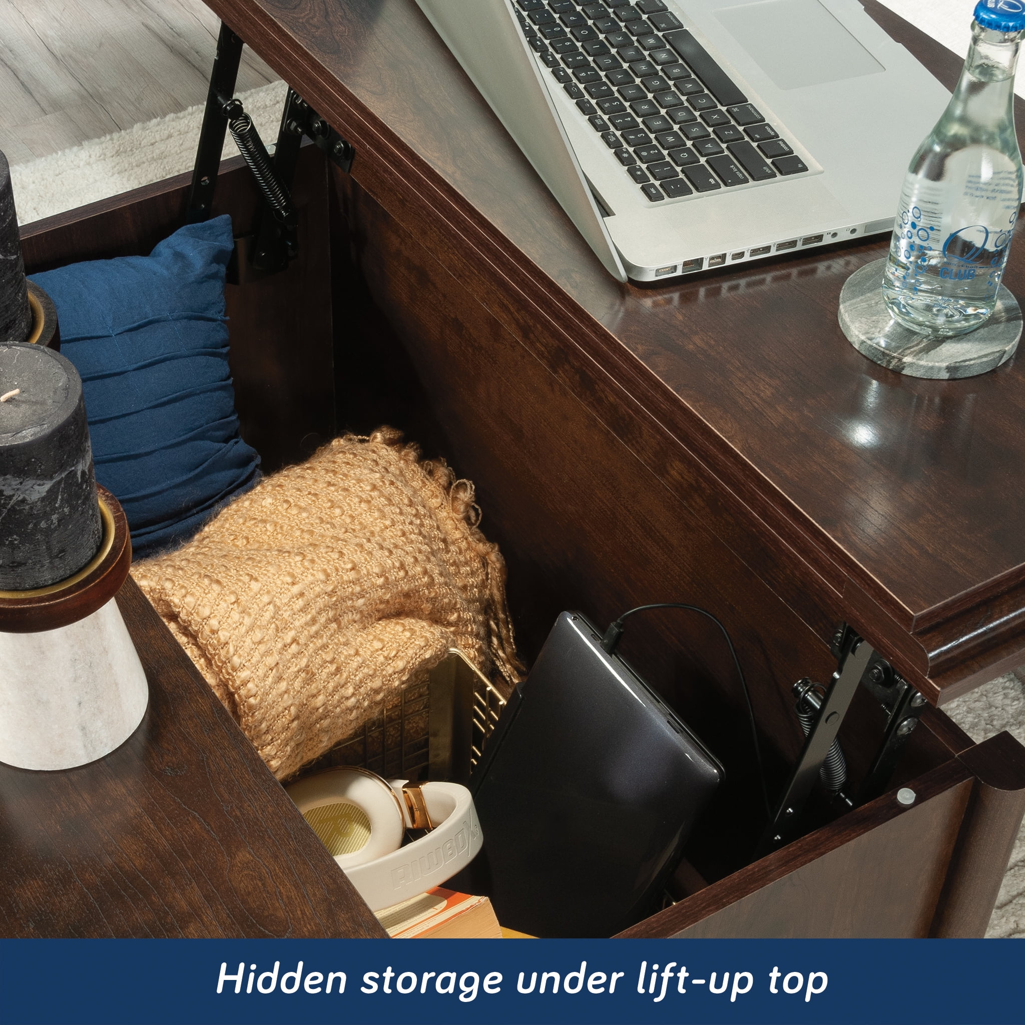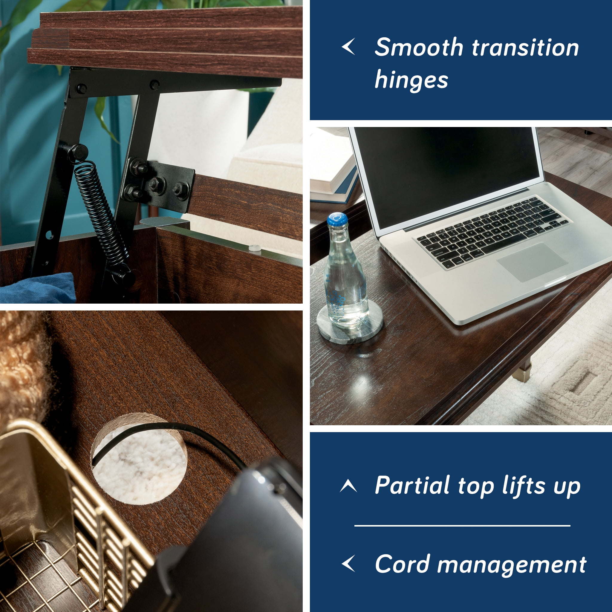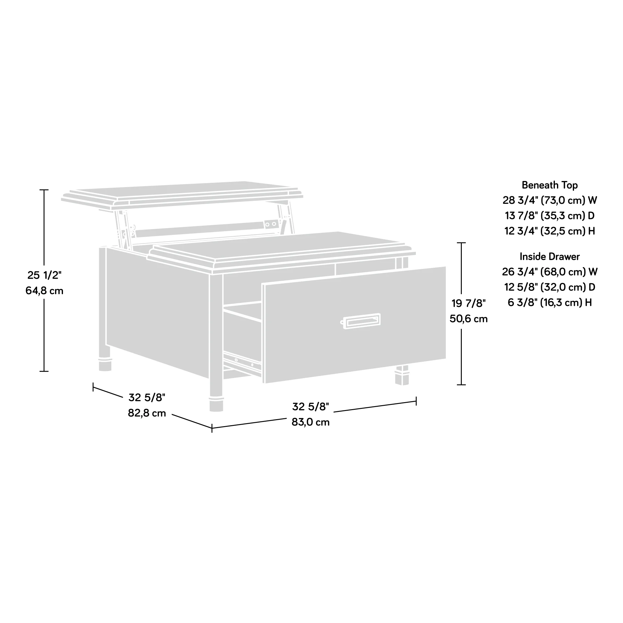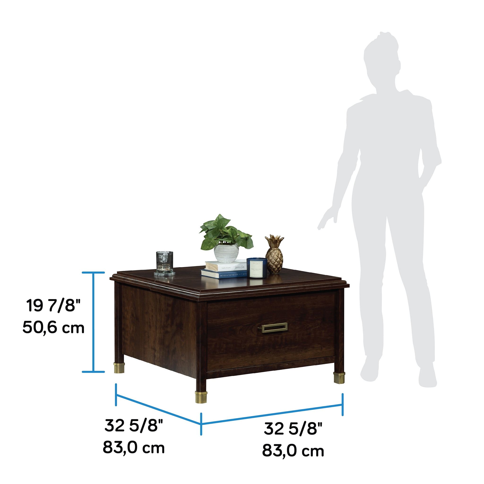 MULTI-FUNCTIONAL – This lift-top coffee table can be used for occasional, game time, dinner time, work time, and chill time VERSATILITY – Partial top lifts up and forward to create versatile work surface SPACIOUS STORAGE – Hidden storage beneath top and easy-glide drawer hold blankets, books, games, etc STYLISH DESIGN – Decorative metal leg caps add a touch of vintage style DIMENSIONS – 32 5/8”W x 32 5/8”D x 19 7/8”H