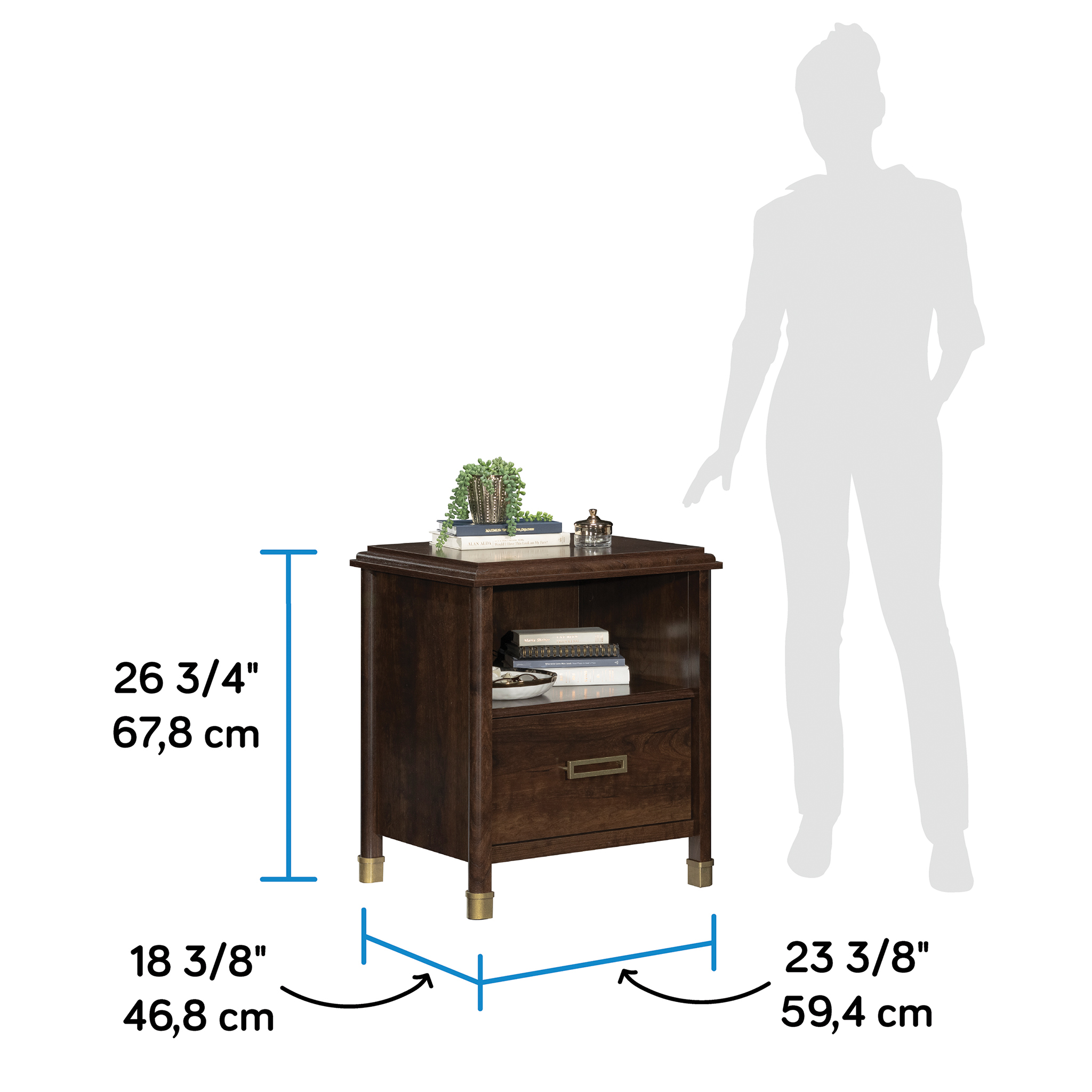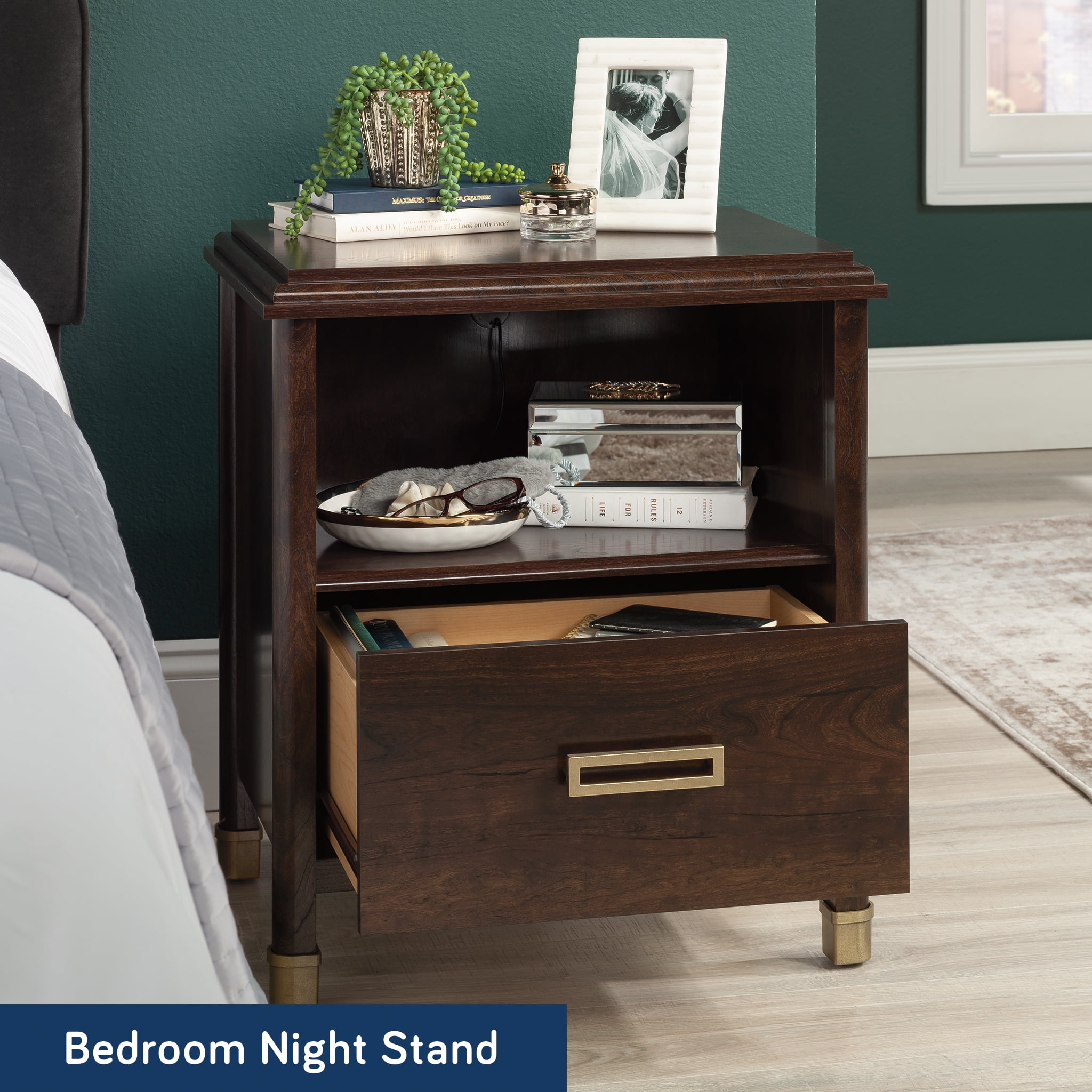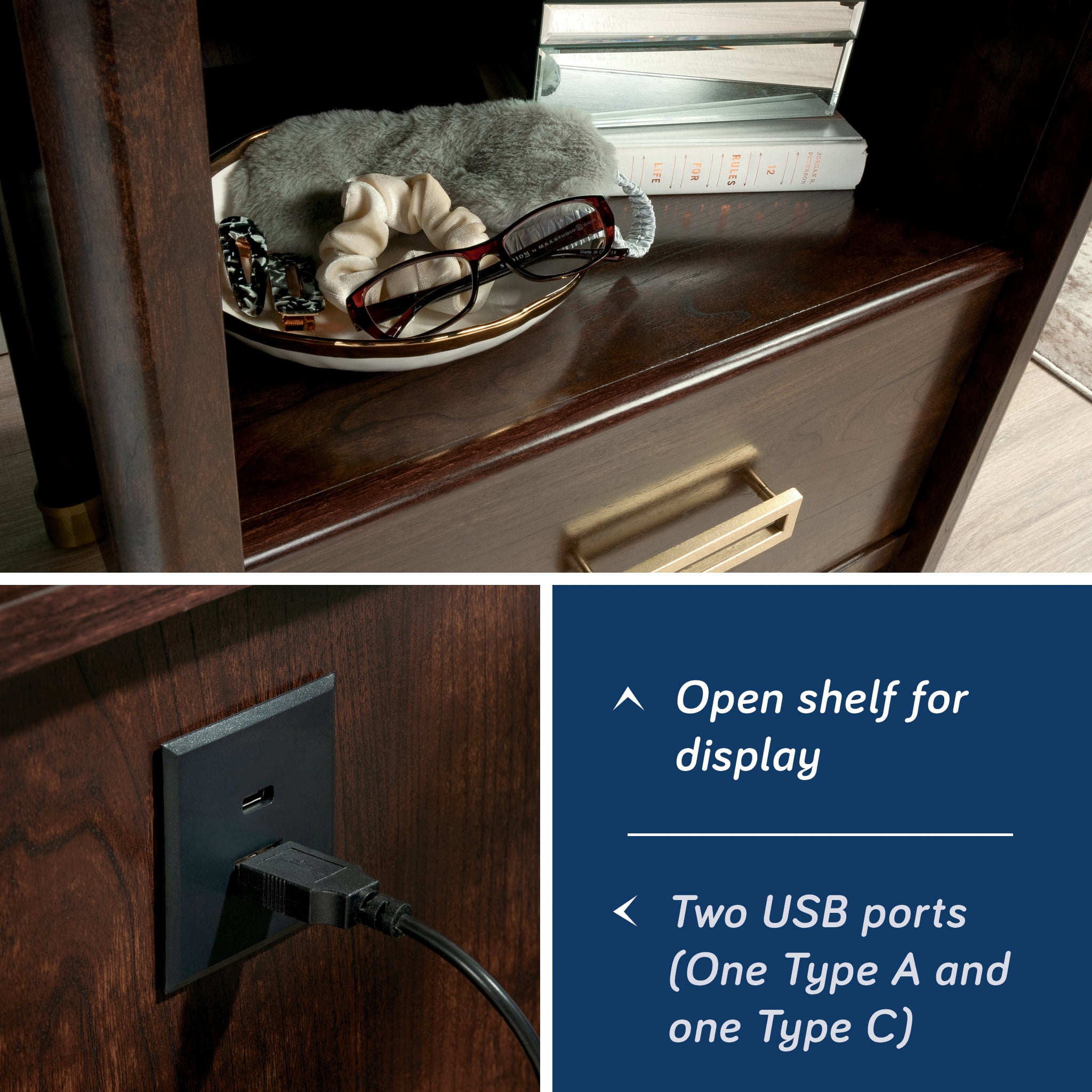 MULTI-ROOM STORAGE – This functional stand is great for the bedroom but can also be used in the living room as a side table SPACIOUS – With its open shelf and drawer with metal runners and safety stops, there is plenty of room for your books, glasses and more CHARGING CAPABILITY– Two USB ports in back panel power phones, tablets and more (one type A and one type C) STYLISH DESIGN – Decorative metal leg caps add a touch of vintage style DIMENSIONS – 23 3/8”W x 18 3/8”D x 26 3/4”H