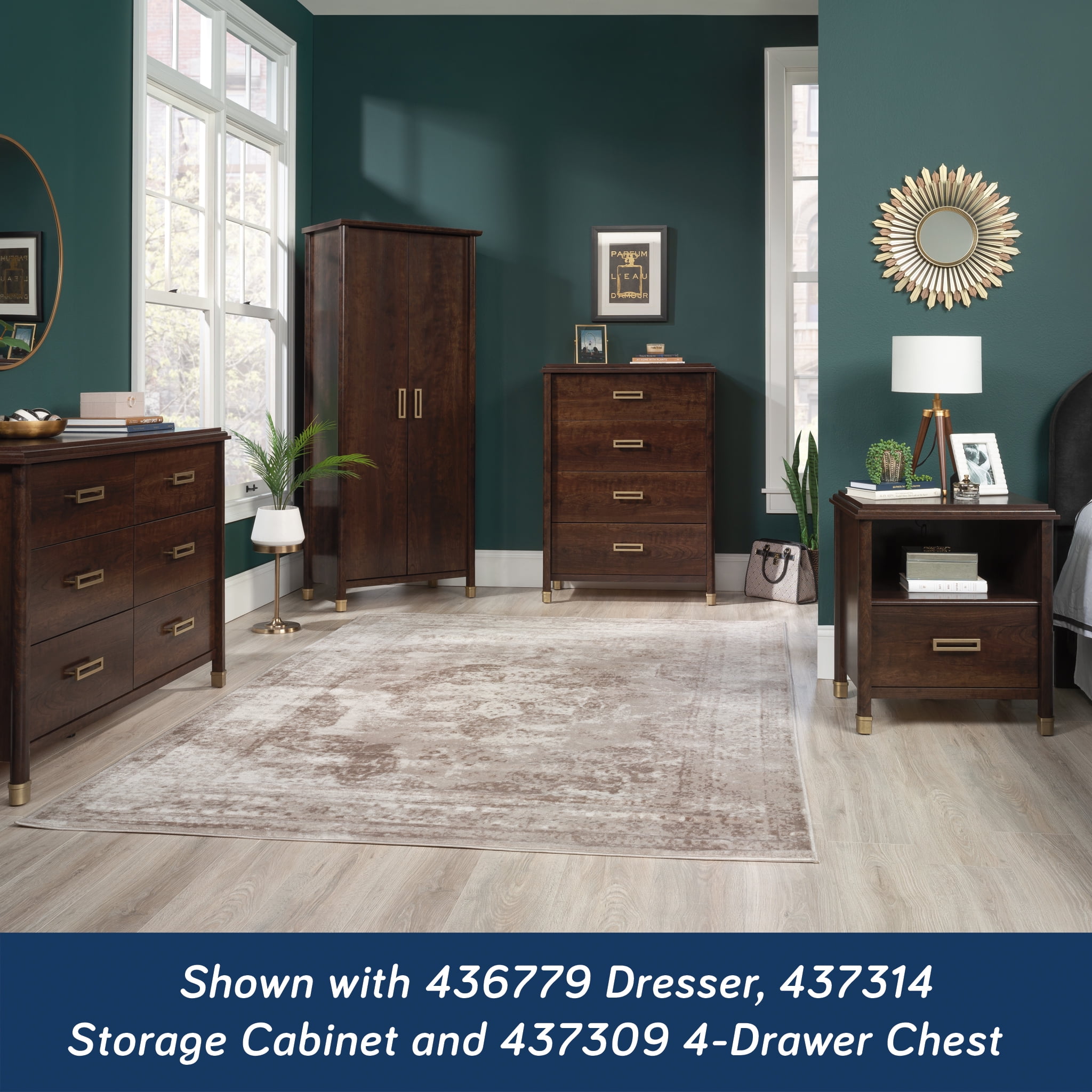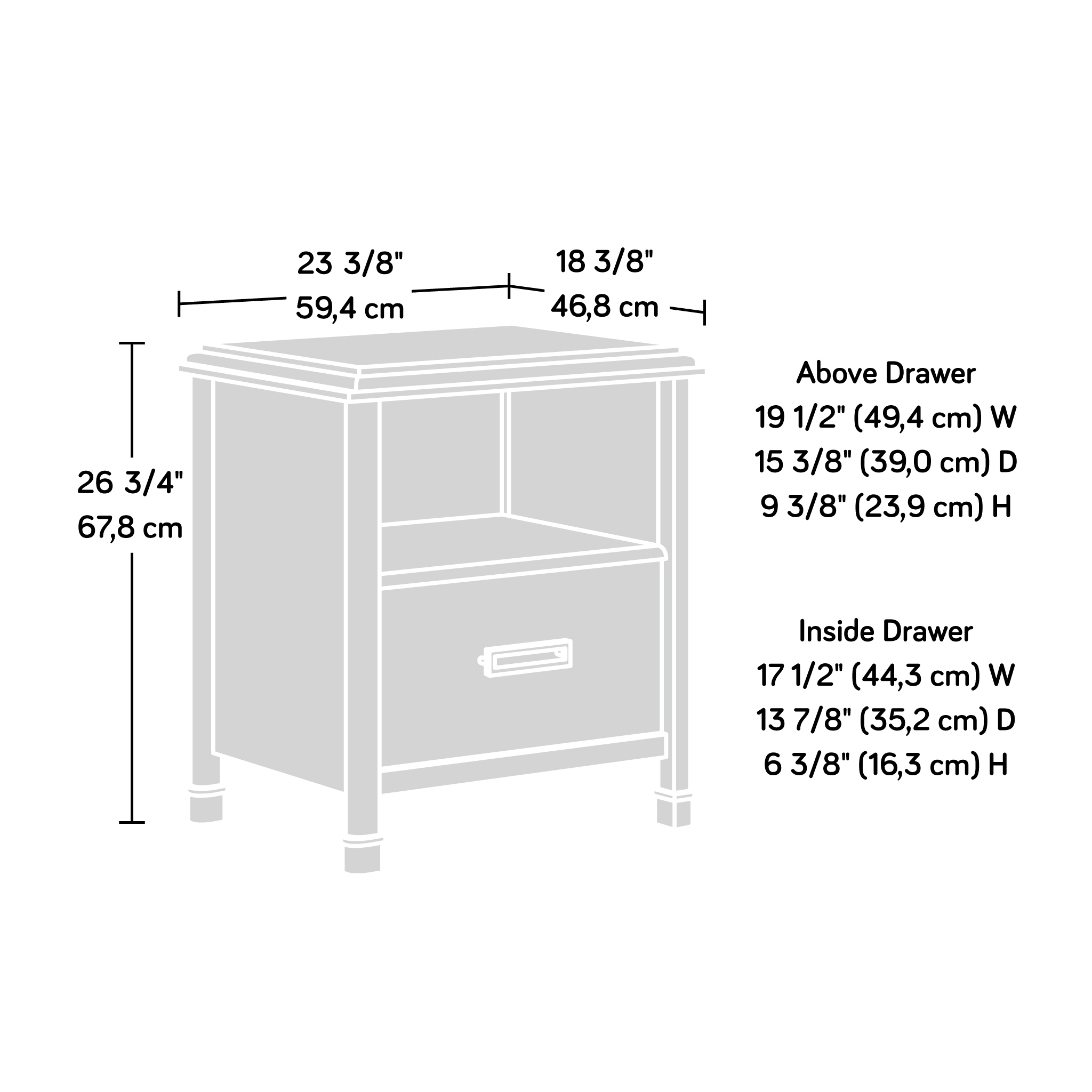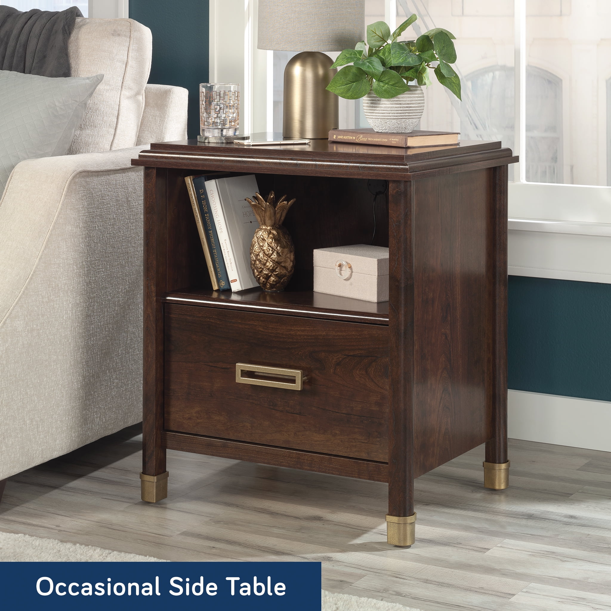 Commemorating the founding year of the Sauder furniture company, the 1934 collection by Sauder depicts the beauty and grace of a bygone era. A perfect blend of vintage and modern design, this Art Deco style 1-drawer nightstand features metal drawer runners and safety stops that provide smooth movement, while the open shelf provides additional bedtime storage. This modern nightstand comes equipped with two USB ports, one type A and one type C, in the back panel to charge phones and other devices. With vintage metal leg caps, this nightstand with open shelf is both stylish and stable. Finished on all sides, this versatile bedside table with drawer can be placed anywhere in the room. It’s quick and easy to assemble with the slide-on molding and T-lock drawer system. Whether you’re looking to add a touch of 1930s glamour, or you have an appreciation for a simplified Art Deco aesthetic, the blended look of a dark, Deco Cherry finish with bold, geometric hardware gives this single-drawer nightstand an elegant impression in any home.