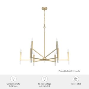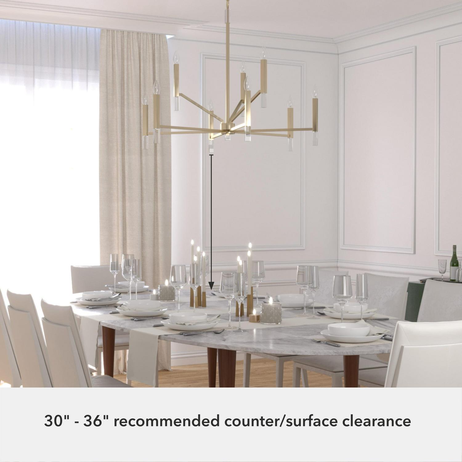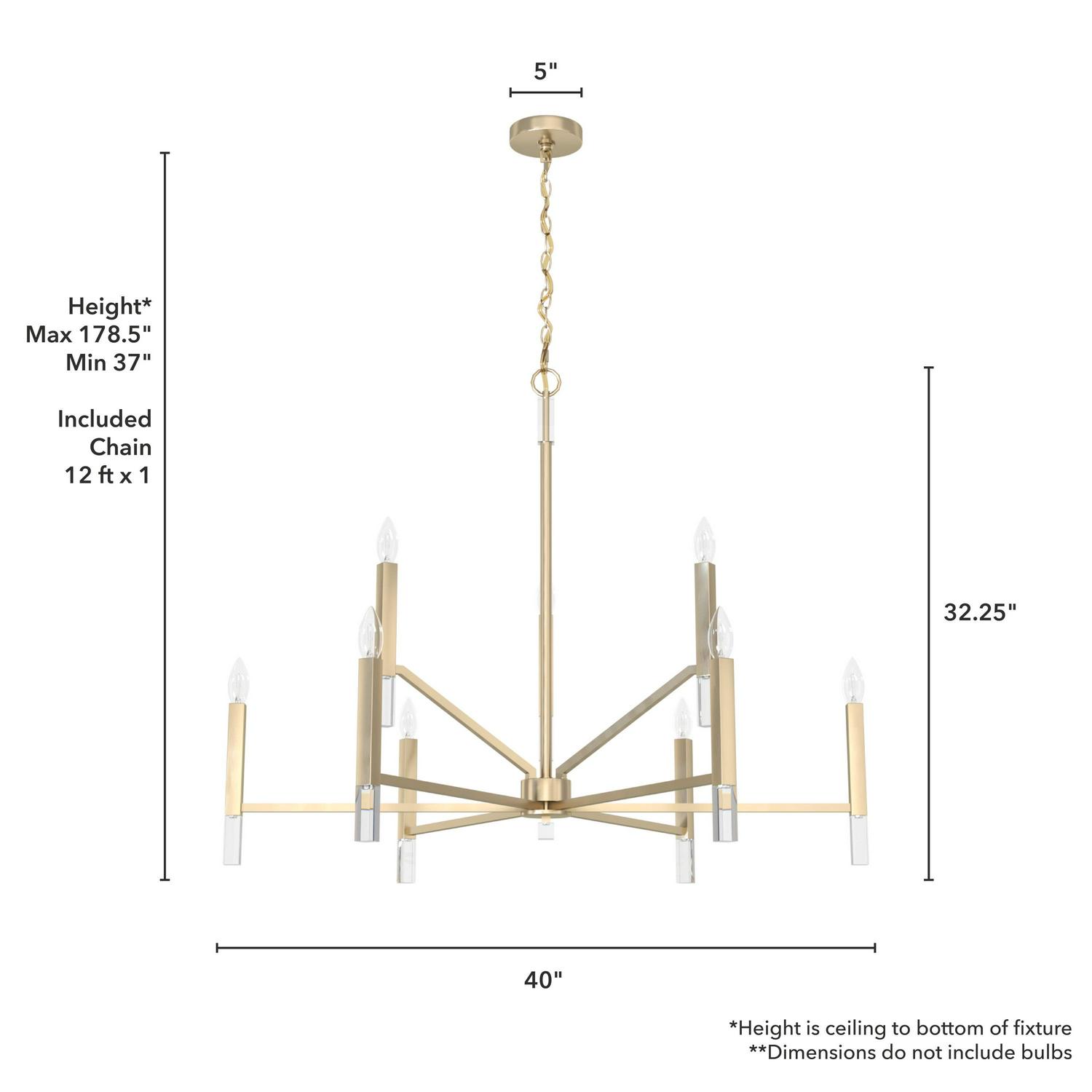 Hunter Fans-19521-Collection: Sunjai, Material: Crystal, Finish Color: Alturas Gold, Width: 40″, Height: 32.25″, Length: 40″, Lamping Type: Incandescent, Number Of Bulbs: 9, Wattage: 60 Watts, Dimmable: Yes, Desc: Uplift your home s lighting aesthetic with the Sunjai 2 tier chandelier, featuring nine individual lights that evoke the classic glow of a candelabra, with a modern edge. The Sunjai s casual geometry is offset by elegant shimmering adornments at the base of each light and the fixture s overarching clean, modern design, adding a touch of glam to. Brighten up gatherings with the Sunjai 2 tier chandelier. Rated for indoor use only Requires 9 E12 bulbs. Bulbs not included. MADE FOR INDOORS: For use in indoor spaces like kitchens, bedrooms, living rooms, dining rooms, and entryways. BULB RECOMMENDATION: Maximum 60 W per light bulb or equivalent LED bulb. Bulbs not included. PICTURED HERE: Match our image using B10 Candle light bulbs. CUSTOMIZABLE HANGING OPTIONS: With the minimum required chain, the hanging length is 37 inches. When using all of the included chain, the maximum hanging length is 178.5 inches. WARRANTY: One-year limited warranty backed by the trusted experts at Hunter.,-Sunjai – 9 Light 2-Tier Chandelier In Formal Style-32.25 Inches Tall and 40 Inches Wide-Alturas Gold Finish -Traditional Installation