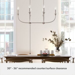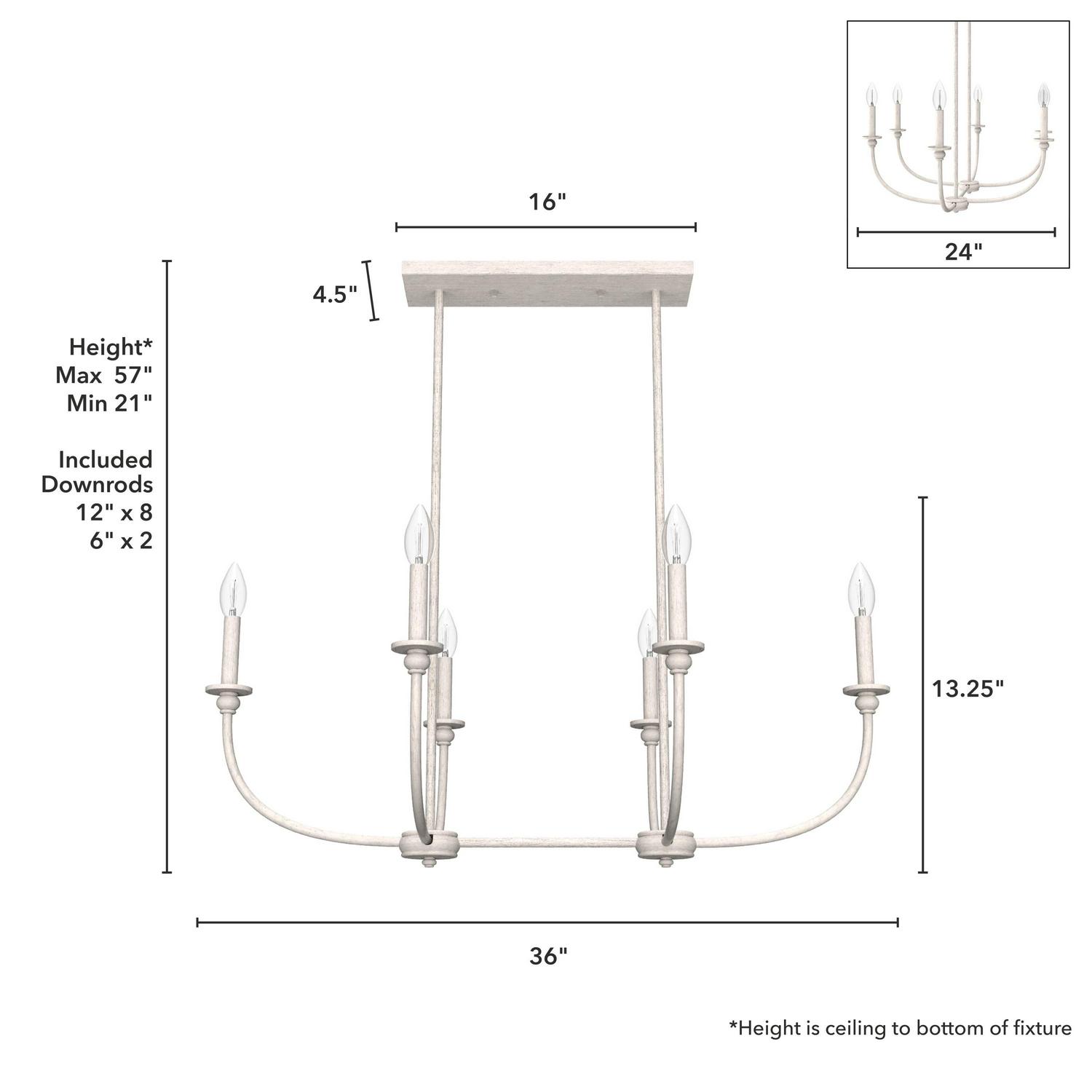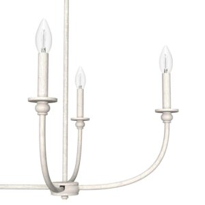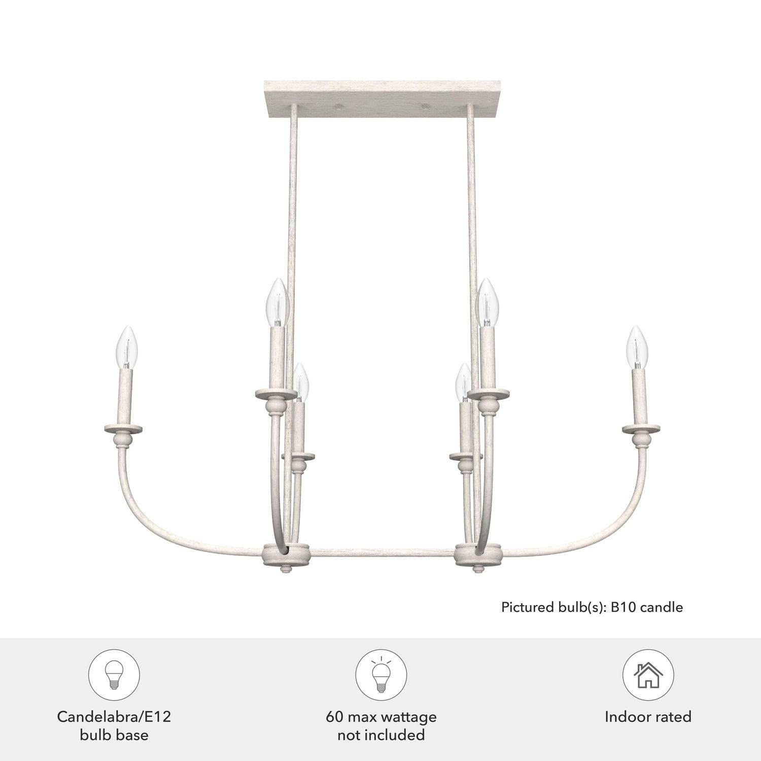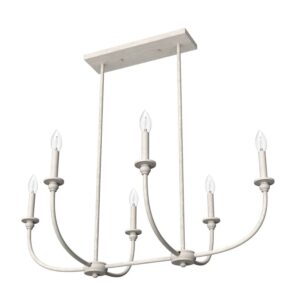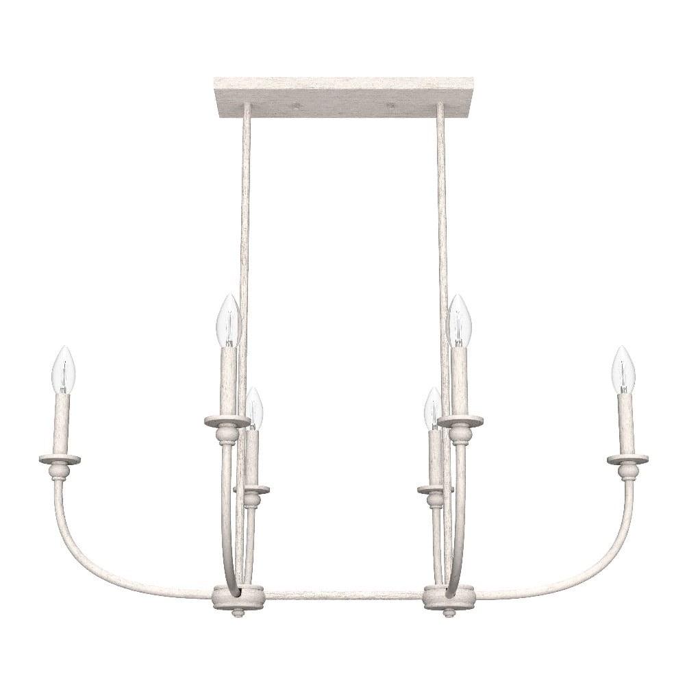 Hunter Fans-19645-Collection: Southcrest, Material: Metal, Finish Color: Distressed White, Width: 36″, Height: 13.25″, Length: 24″, Lamping Type: Incandescent, Number Of Bulbs: 6, Wattage: 60 Watts, Dimmable: Yes, Desc: Take your kitchen aesthetic to the next level with a light fixture that makes you want to cook. As stylish as it is durable, the Southcrest 6 light linear chandelier beautifully blends the clean lines of modern design with the old-world elegance of cottage style. Install the Southcrest over your kitchen island or dining table to infuse even more warmth into your cooking and conversation. Rated for indoor use only Requires 6 E12 bulbs. Bulbs not included. MADE FOR INDOORS: For use in indoor spaces like kitchens, bedrooms, living rooms, dining rooms, and entryways. BULB RECOMMENDATION: Maximum 60 W per light bulb or equivalent LED bulb. Bulbs not included. CUSTOMIZABLE HANGING OPTIONS: With the minimum required downrod, the hanging length is 21 inches. When using all of the included downrod, the maximum hanging length is 57 inches.,-Southcrest – 6 Light Linear Chandelier In Casual Style-13.25 Inches Tall and 36 Inches Wide-Distressed White Finish