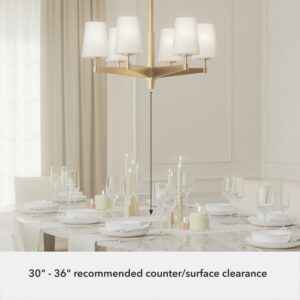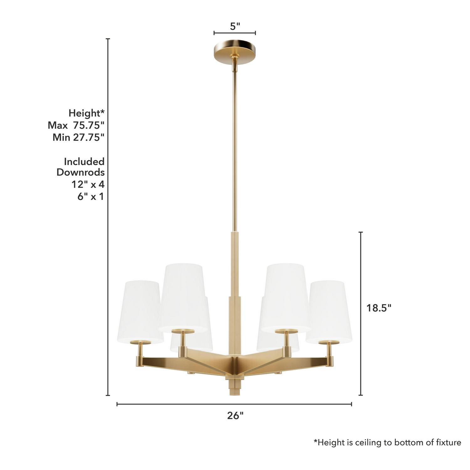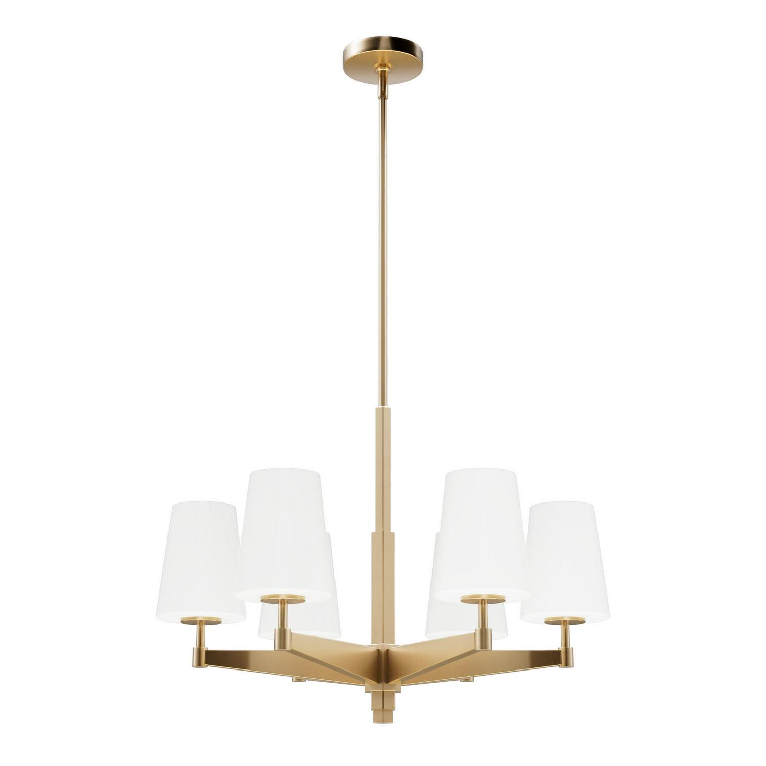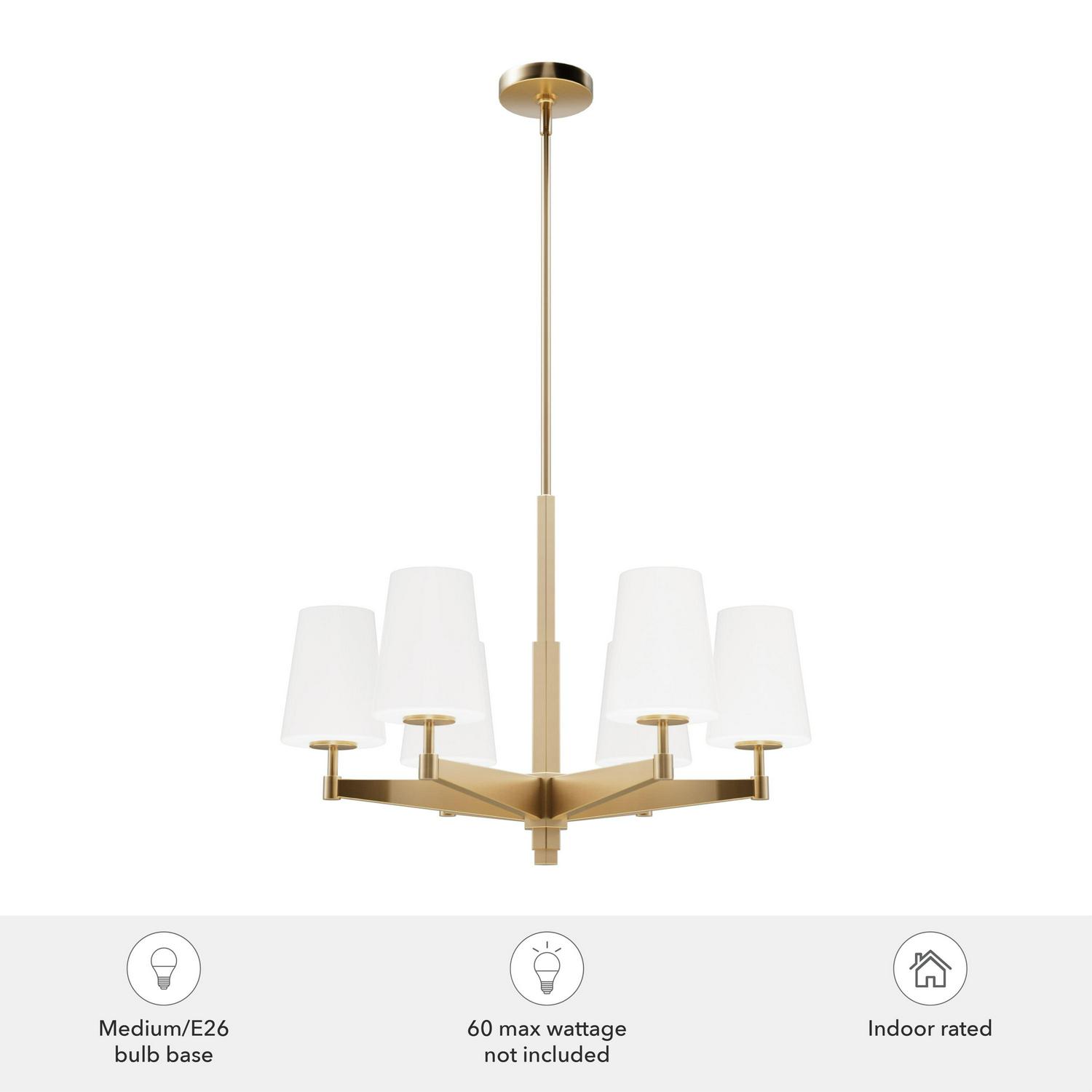 Hunter Fans-19876-Collection: Nolita, Material: Aluminum, Finish Color: Alturas Gold, Width: 26″, Height: 18.5″, Length: 26″, Lamping Type: Incandescent, Number Of Bulbs: 6, Wattage: 60 Watts, Dimmable: Yes, Desc: Your space exudes glamour and impeccable design, and your lighting needs to match; Enter the Nolita 6 light chandelier. This gleaming metal chandelier with glass shades will elevate your living space. The warm glow of the lights will enhance the ambiance, and the design is lovely to look at. MADE FOR INDOORS: For use in indoor spaces like kitchens, bedrooms, living rooms, dining rooms, and entryways. BULB RECOMMENDATION: Maximum 60 W per light bulb or equivalent LED bulb. Bulbs not included. CUSTOMIZABLE HANGING OPTIONS: With the minimum required downrod, the hanging length is 27.75 inches. When using all of the included downrod, the maximum hanging length is 75.75 inches.,-Nolita – 6 Light Chandelier In Modern Style-18.5 Inches Tall and 26 Inches Wide-Alturas Gold Finish