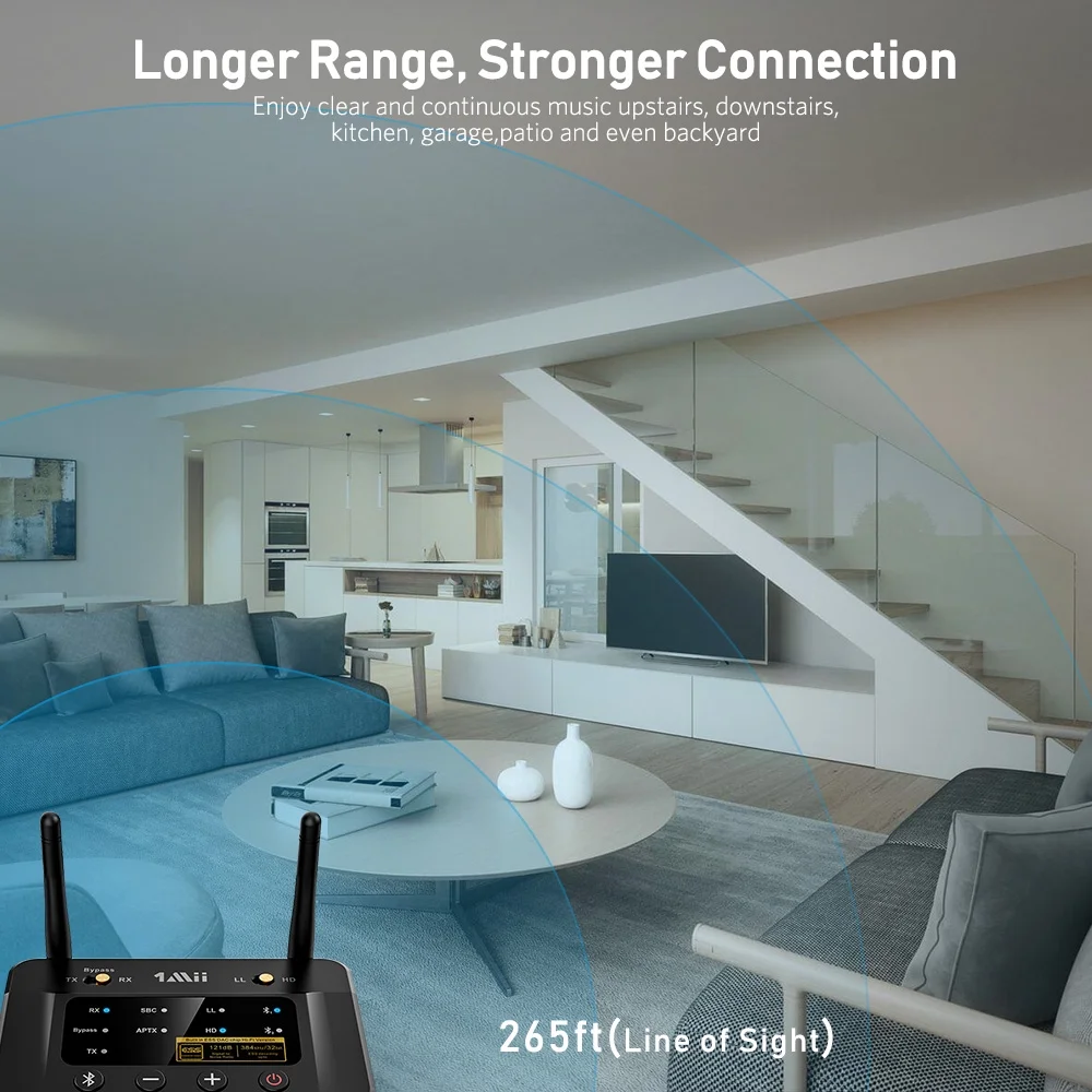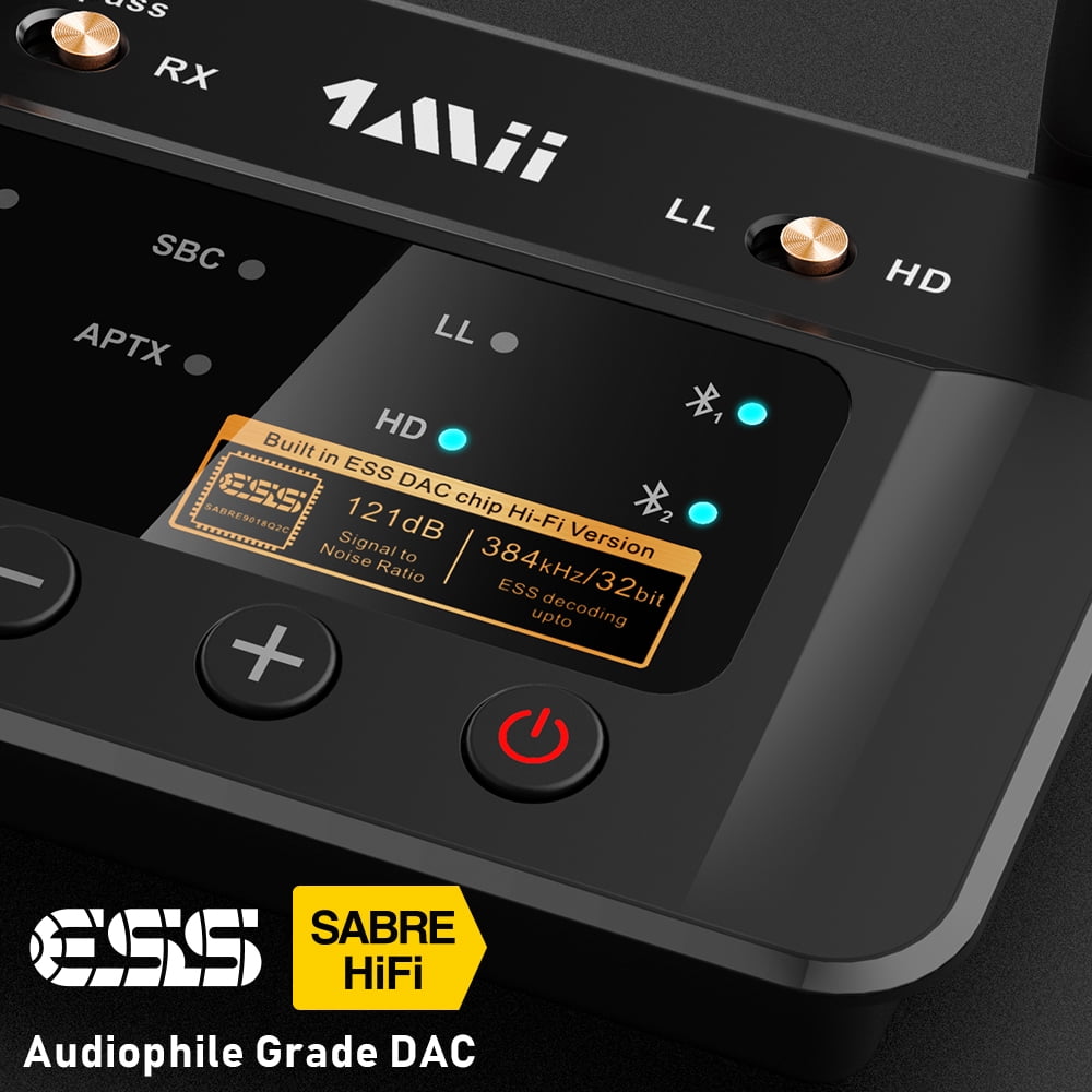 Immerse yourself in the world of entertainment with high-definition audio A wide range of up to 265 feet line-of-sight outside and up to 110 feet indoors Supports both optical and analog inputs and outputs, dual-link pairing, and Bypass mode APtX Low Latency technology allows you to watch your shows in perfect synchronization Dual-link feature of the transmitter allows the audio stream to 2 headphones or speakers Built-in ESS DAC that’s noted as the gold standard by audiophiles Qualcomm CSR8675 Bluetooth audio chip delivers an incredible audio performance Audio Output: AUX, RCA, Optical Transmission Mode: TX/RX Audio Codec: aptX HD, aptX LL, aptX and AAC Dual Link: Support aptX LL Range: up to 265 feet in an open-air area and up to 110 feet indoors Color: Black Dimensions (L x W x H): 5.43 x 3.9 x 2.2 inches Weight: 0.75 pounds