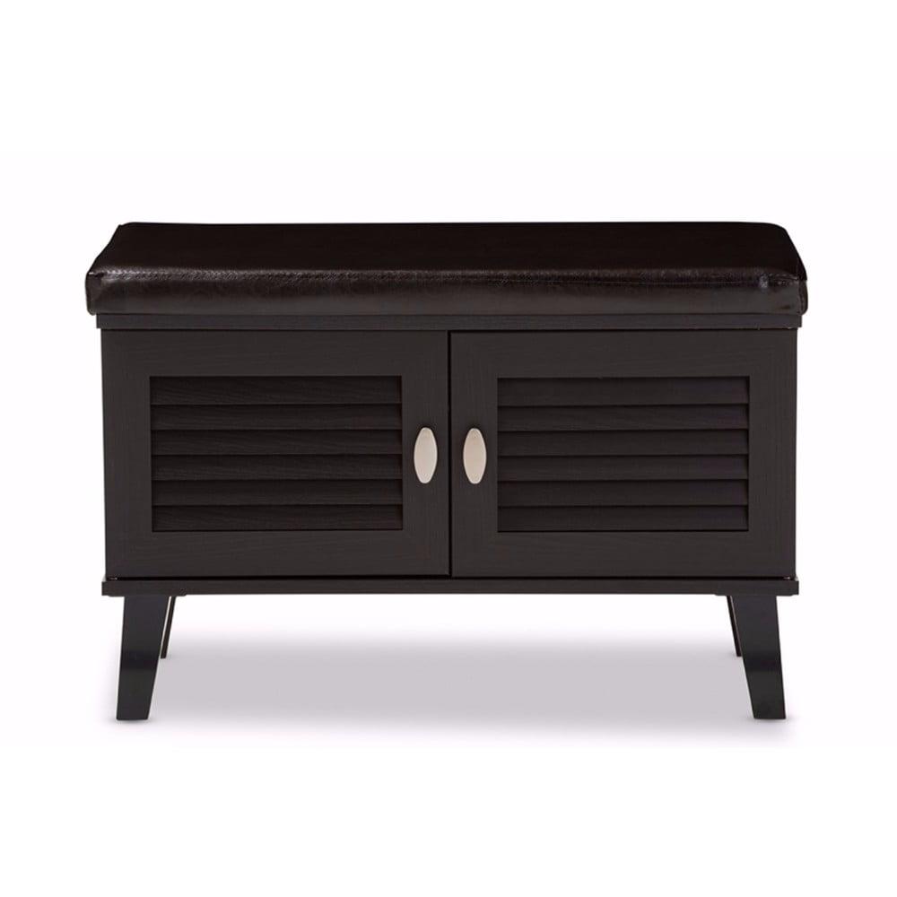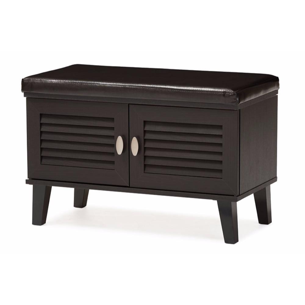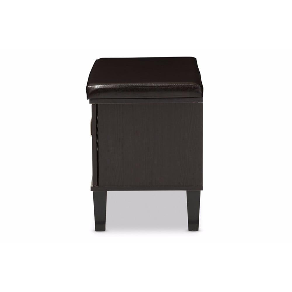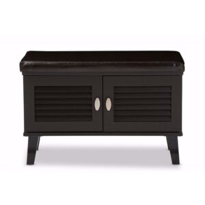 2-door Dark Brown Wood Entryway Storage Cushioned Bench Shoe Rack Cabinet Organizer The clean lines on this robust shoe storage cabinet mean that itll effortlessly blend into any entryway and really help clear your space of those messy piles of shoes that everyone always trips over. Constructed of engineered wood in dark espresso PU veneer, the two doors reveal four cubbies that could at least fit four pairs of adults shoe and couple extra pairs of flip-flops or children shoes. To add practicality, the top of the bench is upholstered in dark brown faux leather as a cushion seat for seating while you put on your shoes. Sheffield shoe storage cabinet bench is ventilated through the louvered doors to stop those smelly shoe odors that can often build-up inside. For a modern look, silver hardware is added to ease every days use. Made in Malaysia, the Sheffield requires assembly.