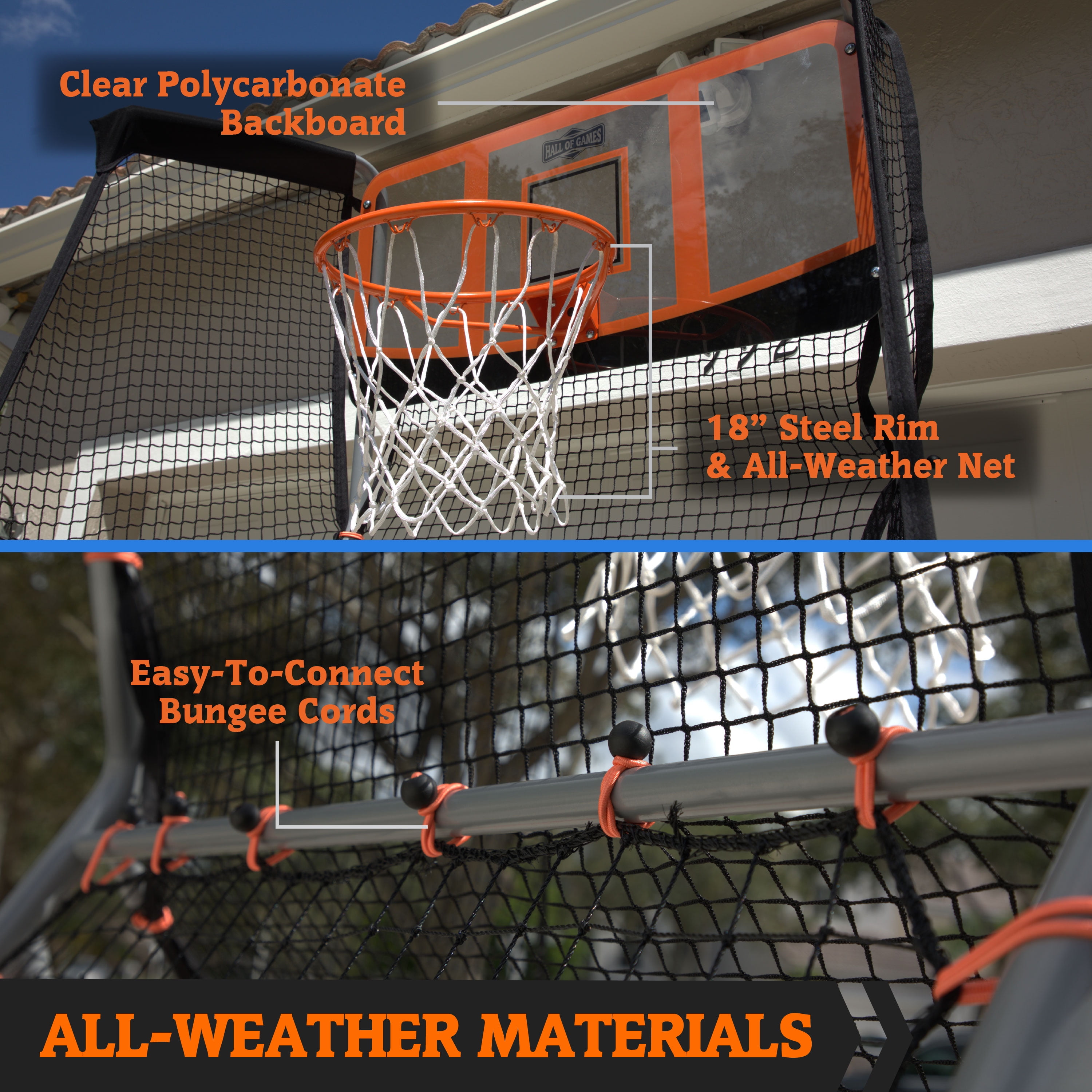 Hall of Games Outdoor Combo 2-in-1 Basketball and Baseball Training Game is 62″ L x 64″ W x 100″ H in size and perfect for shooting hoops on one side and practicing baseball fielding on the other side. The ball return net will take care of your rebounds so you can spend more time working on your basketball shots. You can use the included measuring rope, and crayon to improve your game by marking a throwing line. The all-weather baseball net will help you improve your throwing and fielding skills with reliable consistent rebounds from the tight heavy-duty net on the opposite side of the basketball game. The 38mm steel tube frame of this outdoor 2-in-1 game has pre-filled sand tubes, and corner protectors to help keep the nets and hoop of this game set on the ground and stable during active play outside. The 18” diameter steel basketball rim is supported by the steel frame and clear polycarbonate backboard of this 2-in-1 game set, and the all-weather netting with thick easy-to-connect bungee cords can withstand training season after season so you can play and improve your basketball and baseball game outdoors and around your home.