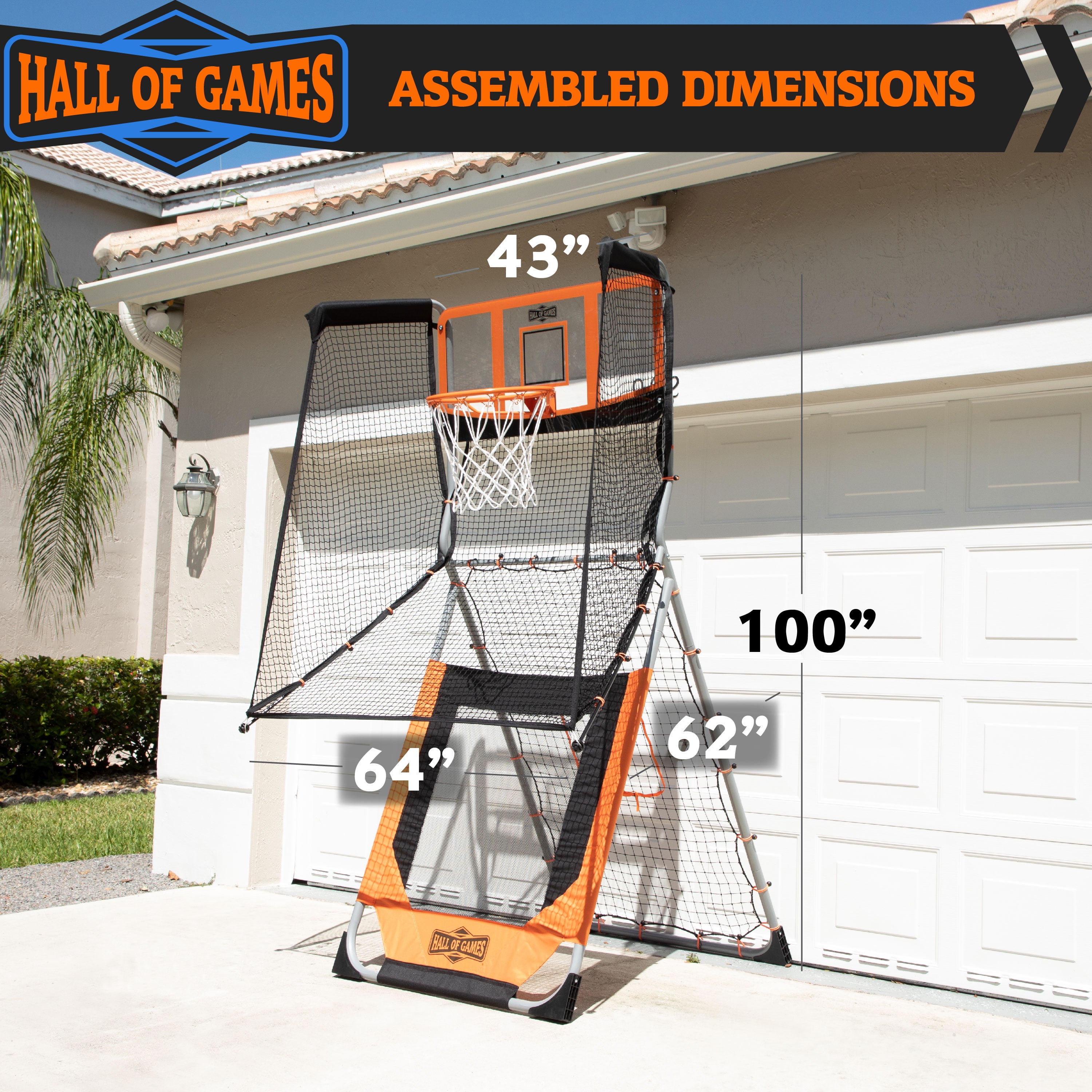 Assembled size 62″ L x 64″ W x 100″ H Target Toss Games: Basketball and Baseball BASKETBALL & BASEBALL TRAINING FUN: Play outdoors with this 2-in-1 game, shoot hoops on one side, and practice baseball fielding on the other side BASKETBALL RETURN SYSTEM: The ball return net will rebound for you so you can spend more time working on your basketball shots, use the included measuring rope and crayon to mark a throwing line for more fun as you improve your game BASEBALL: The all-weather baseball net will help you improve your throwing and fielding skills with reliable, consistent rebounds from the tight heavy-duty net on the opposite side of the basketball game Great outdoor basketball game and baseball game for teens