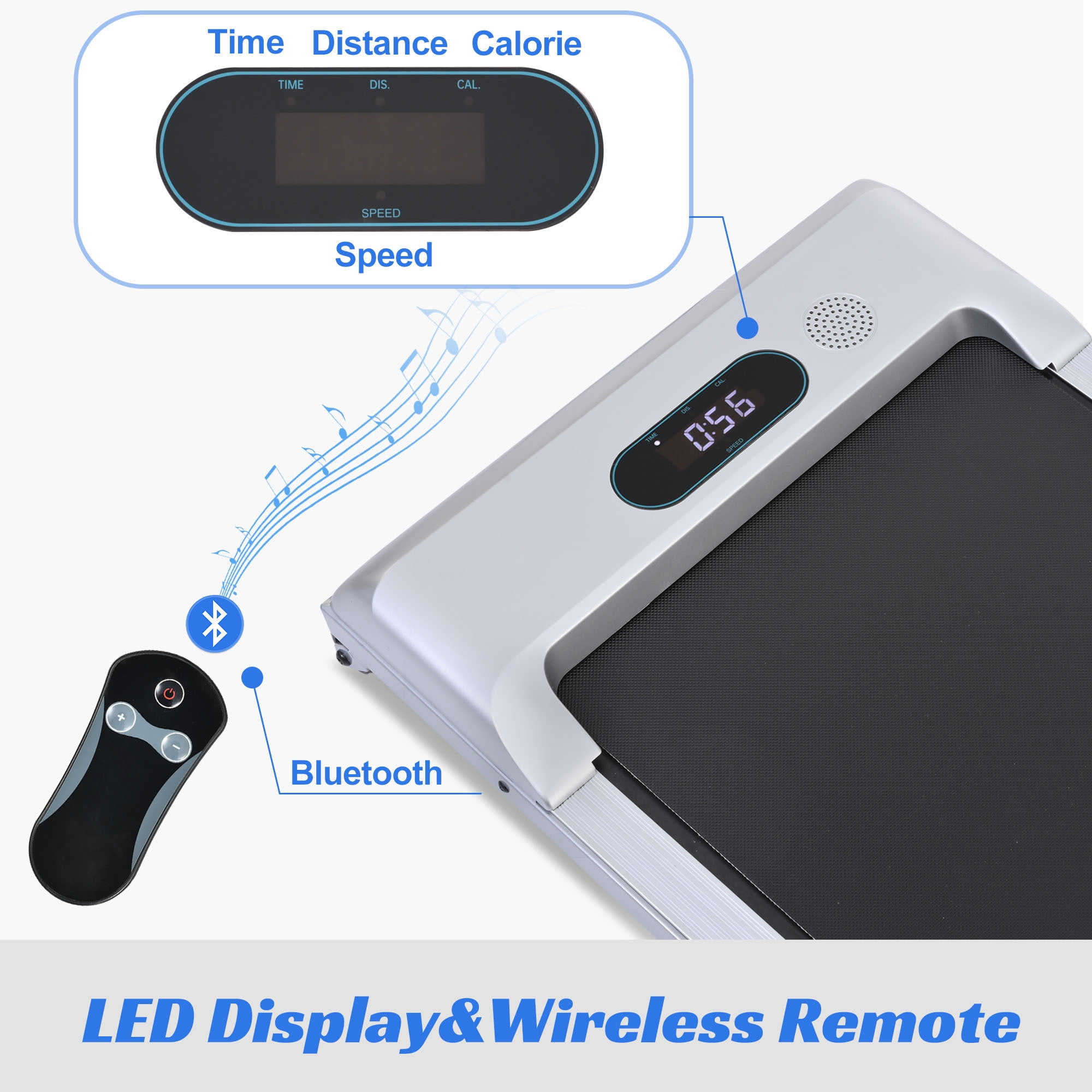 【2 in 1 Under Desk Treadmill】The independent remote control can efficiently control and adjust the running speed and improve the running safety. Available in 0.5 to 4 MPH Speed levels, this walking treadmill allow you to select different speed base on your physical condition and exercise based. Maximum weight: 260lbs. 【Quiet and Powerful Motor】With a 2.5 HP powerful quiet Motor,the electric treadmill is perfect for running, jogging, and walking in the comfort of your home. With a durable steel frame and multi-layer shield design, the under desk treadmill’s shock-absorbing and noise-reducing, making your running quieter, safer and more comfortable. 【Bluetooth Connection and LED Display】 The LED display clearly shows time, calories, step, speed and distance, monitoring your progress in real time and keeping your movement data at a glance. Connect the treadmill to your phone through Bluetooth, so you can play music while you are exercising. 【Non-assembly Design & Space Save Design】 This 2 in 1 treadmill arrives fully assembled and can be used directly after unboxing. Foldable design and transportation wheels allow for easy mobility and portable foldable treadmill for storage, fold it up and walk away in one easy step, perfect for home , apartment, office use. 【More Freely】39.37″x 14.96″ Widened Running Belt Making running or walking on this treadmill more freely. 5 layers non-slip running belt and Silica gel column support will greatly absorb shock to provide cushioning for knee, muscle and joints.