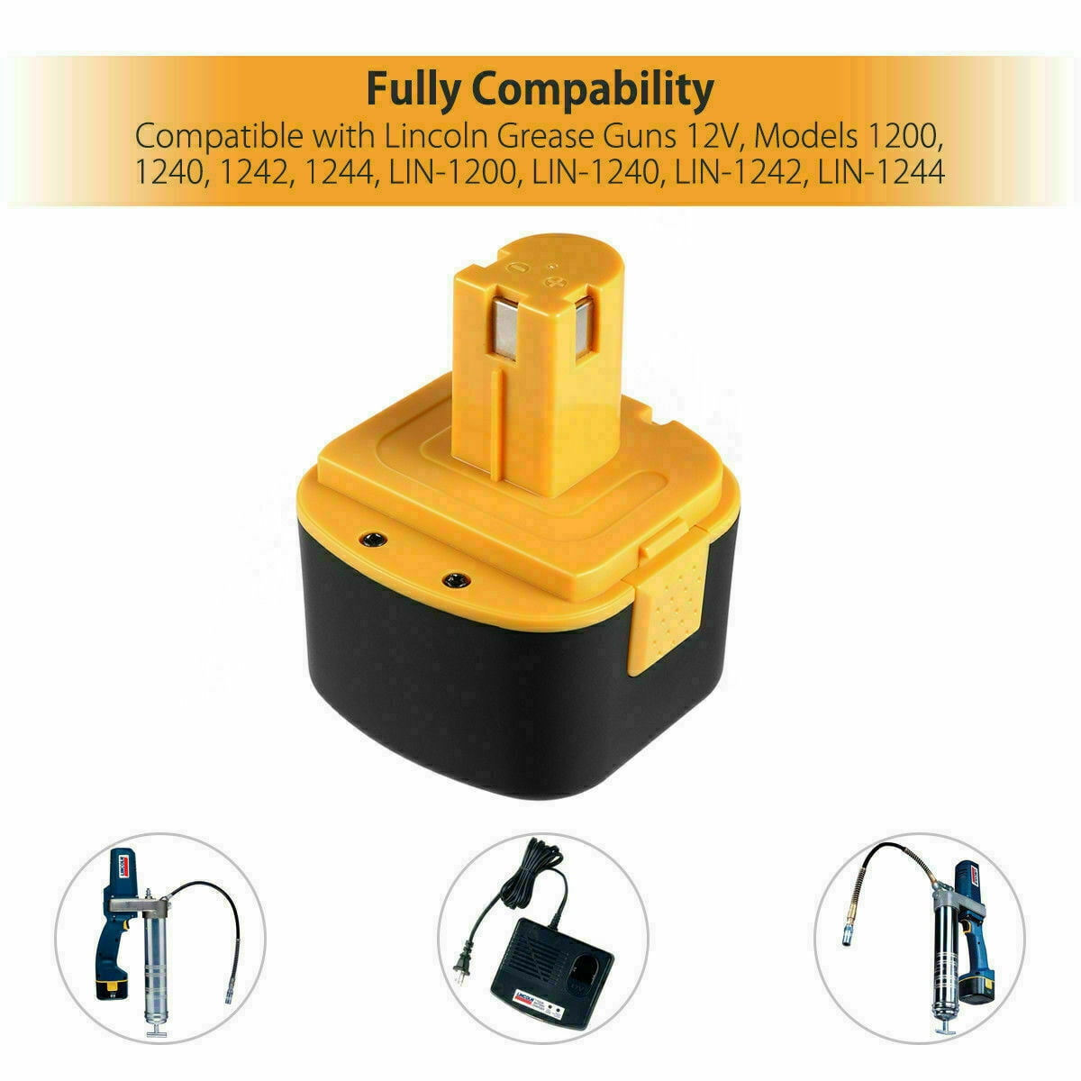 Product Features Brand New | Ni-MH | 12Volt | 3000mAh | Black. Brand New High Quality Rechargeable replacement battery. Compatible with Lincoln Grease Guns 12V, Models 1200, 1240, 1242, 1244, LIN-1200, LIN-1240, LIN-1242, LIN-1244. Batteries are made with the highest quality materials Package Include:2*3.0Ah Replacement Battery. Product Specification Battery Capacity: 3000mAh Battery Voltage: 12V Battery Type: Ni-MH Condition: Brand New Replacement Weight: 2.2lb Compatible With Replace OEM P/N: 1201, LIN-1201, 218-787 Compatible Models: Lincoln Grease Guns 12V, Models 1200, 1240, 1242, 1244, LIN-1200, LIN-1240, LIN-1242, LIN-1244 Package Include 2 x 3.0Ah 12V NI-MH battery for Lincoln 12 Volt Grease Gun 1201 1200 1240 1242 1244