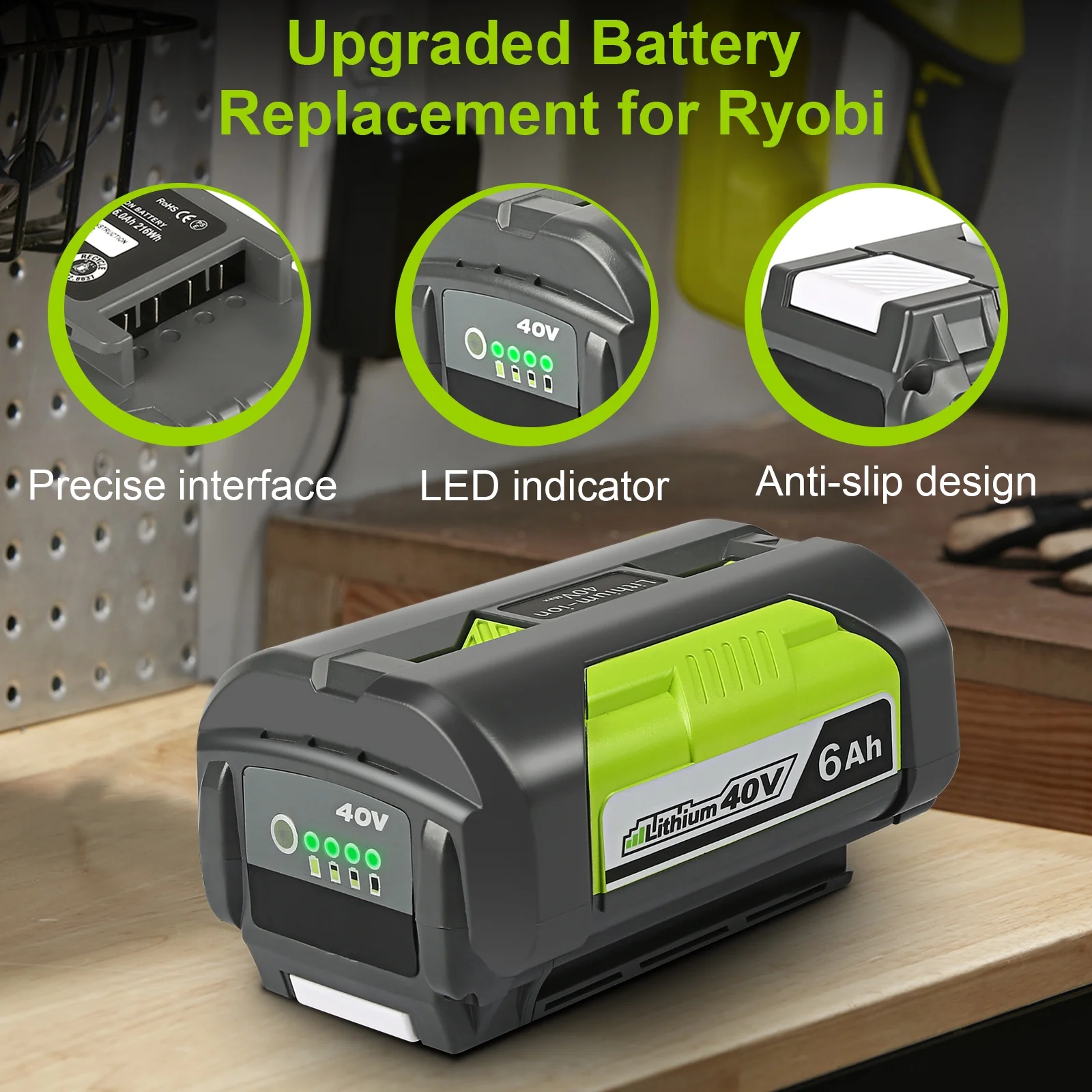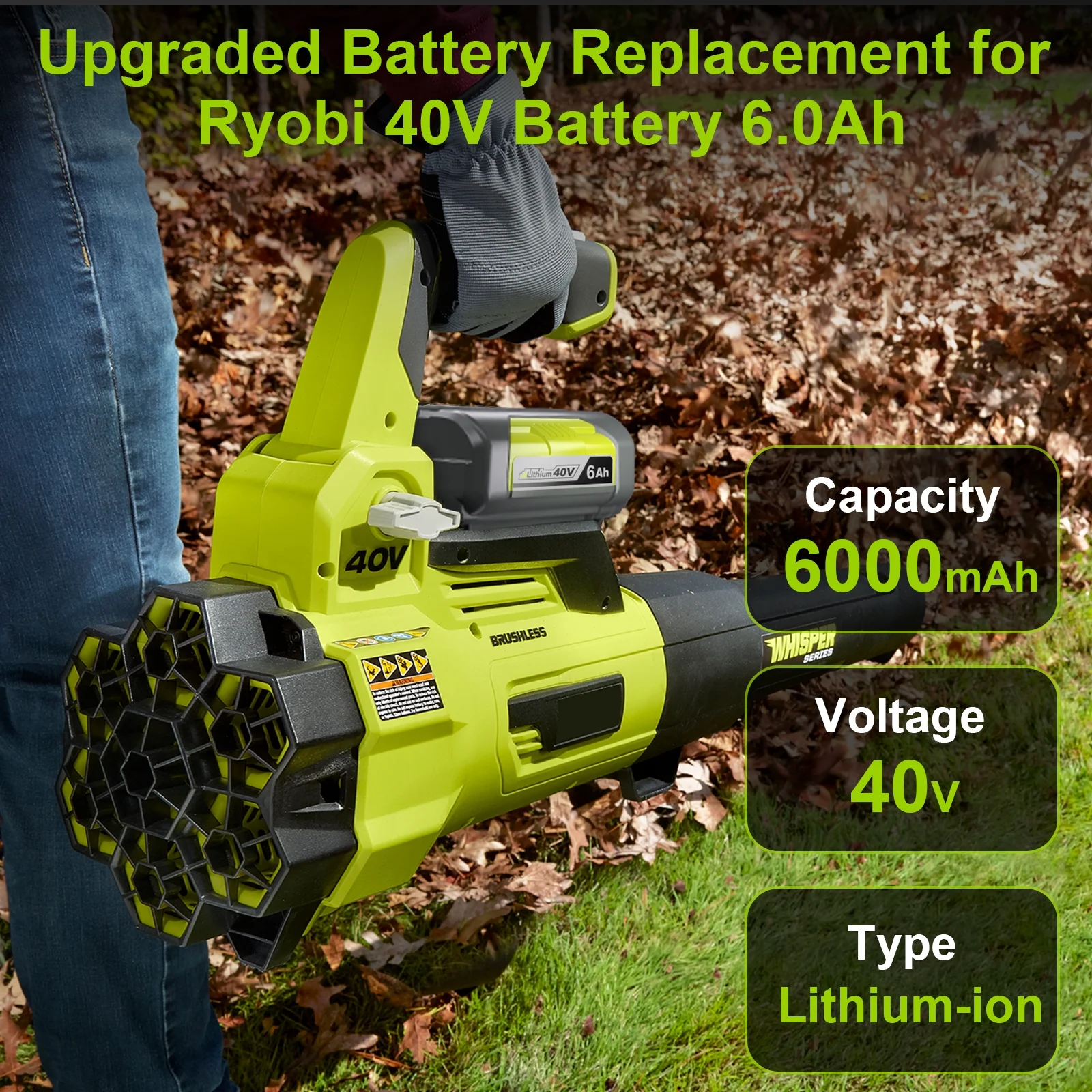 Libatter 40V 6.0Ah Battery Replacement for Ryobi 40V Battery Compatible with Ryobi 40 Volt Lithium Battery Tools OP4040 OP4060 OP4050 OP4015 OP4026 OP40201 OP40261 OP4030 OP40301 OP4050A OP40601 . PRODUCT SPECIFICATIONS: Battery Voltage: 40V Capacity: 6000mAh Color: Black&Green Wattage: 160Wh Reusability: Rechargeable Battery Weight?2 Pounds Item Dimensions: 7.09 x 3.15 x 2.36 inches ITEM FEATURES: ?. 40v Ryobi battery built-in Protection against overcharging, over discharge, over current.The ryobi batteries own short circuit protection and steady voltage circuit. ?. This Ryobi replacement battery is designed for ryobi 40V tools and ryobi 40v battery charger, the ryobi 40v tools’ battery is a kind of lithium-ion rechargeable battery, you can carry it anywhere anytime, convenient to use. And it’s has no memory effect. Can be charged or discharged as needed without loss of capacity. NOTE: Please store ryobi 40 volt battery in a dry, clean, cool, away from heat and metal objects. After use, the ryobi 40v lithium battery is recommended that the battery be cooled and then recharged. When the battery is not used for a long time, it is recommended to charge the battery once a month This product comes with a 1 year warranty, so if you have any questions, please feel free to contact me.