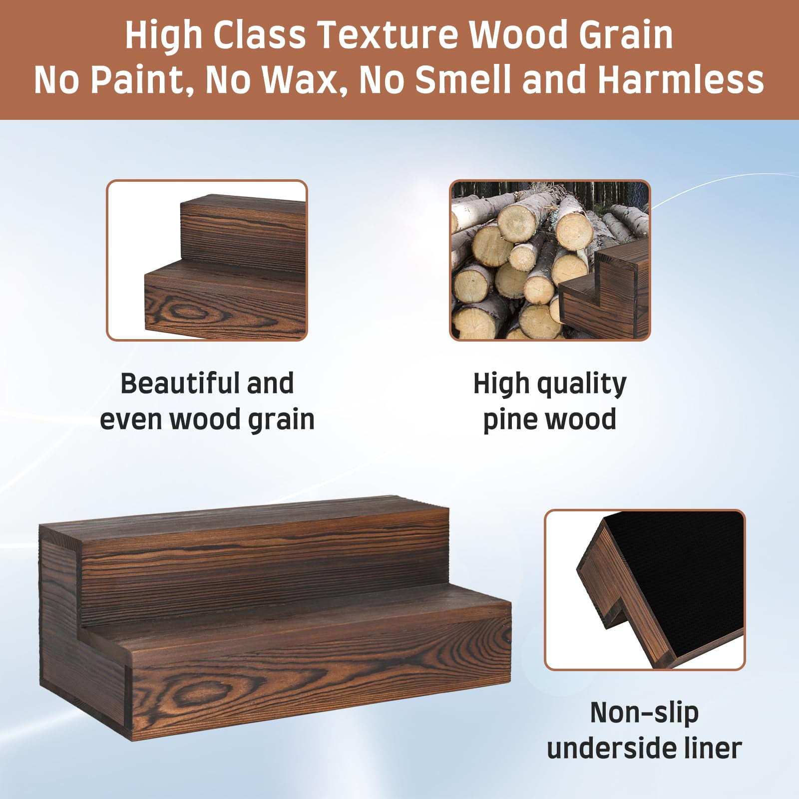 2-Tier Liquor Bottle Display Shelf: These home bar wine cabinet liquor bottle shelves are great for displaying your collection of liquor, spirits, whisky, reds, wines, champagnes, glasses, wine glasses, etc. The unique gorgeous 2-storey stepped design, vintage exquisite wood grain match vintage packaging and shape of wine bottles, as well as the long history of collection, highlight the expensive value of your liquor collection, worth owning. 2-Pack Liquor Bottle Display Shelf : These bar shelves for liquor bottles are great way to save storage space on the bar and cabinets and increase the utilization of wine cabinet space lengthwise. 2 packs can be placed side by side, can also be placed at intervals, adding to the fun of the layout of the wine cabinet shelves. Wooden Bar Bottle Display Stand: These bar shelves for liquor bottles are made of 100% high quality pine wood with advanced wood grain, beautiful and even grain, first-class texture, no paint, no wax, no paint, tasteless and harmless, using advanced carbonization process, the surface is polished so feels very smooth, and there are non-slip pads at the bottom to prevent scratching, environmental protection and beautiful. Versatile Liquor Bottle Shelf: These bar bottle display holder is also great for displaying your crafts, collectibles, perfumes, even baked goods, etc. It can also be used to hold kitchen supplies. Suitable for home bar, kitchen, pubs, bakery, shop, office, exhibition hall, bar and other places. Size and Capacity: The overall measured length of this liquor bottle display shelf is 40.5cm/16 inches, the height is 15.8cm/6.22 inches, and the width is 20cm/7.87 inches. Each tier of shelf is 10cm/4 inches deep. One bar liquor bottle shelf holds 10-12 bottles (depending on the size of your liquor bottle). The wood liquor bottle bar shelf is made by hand sanding natural pine wood. The wood grain of each wine rack is personalized, making each product unique.