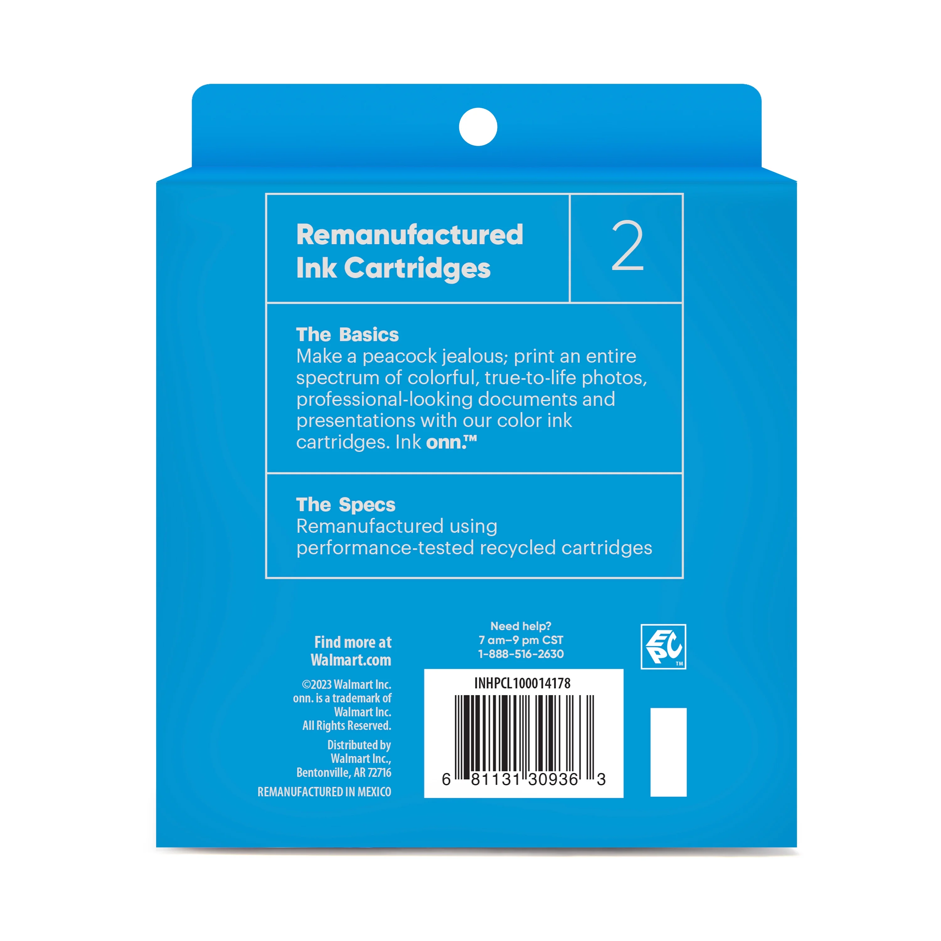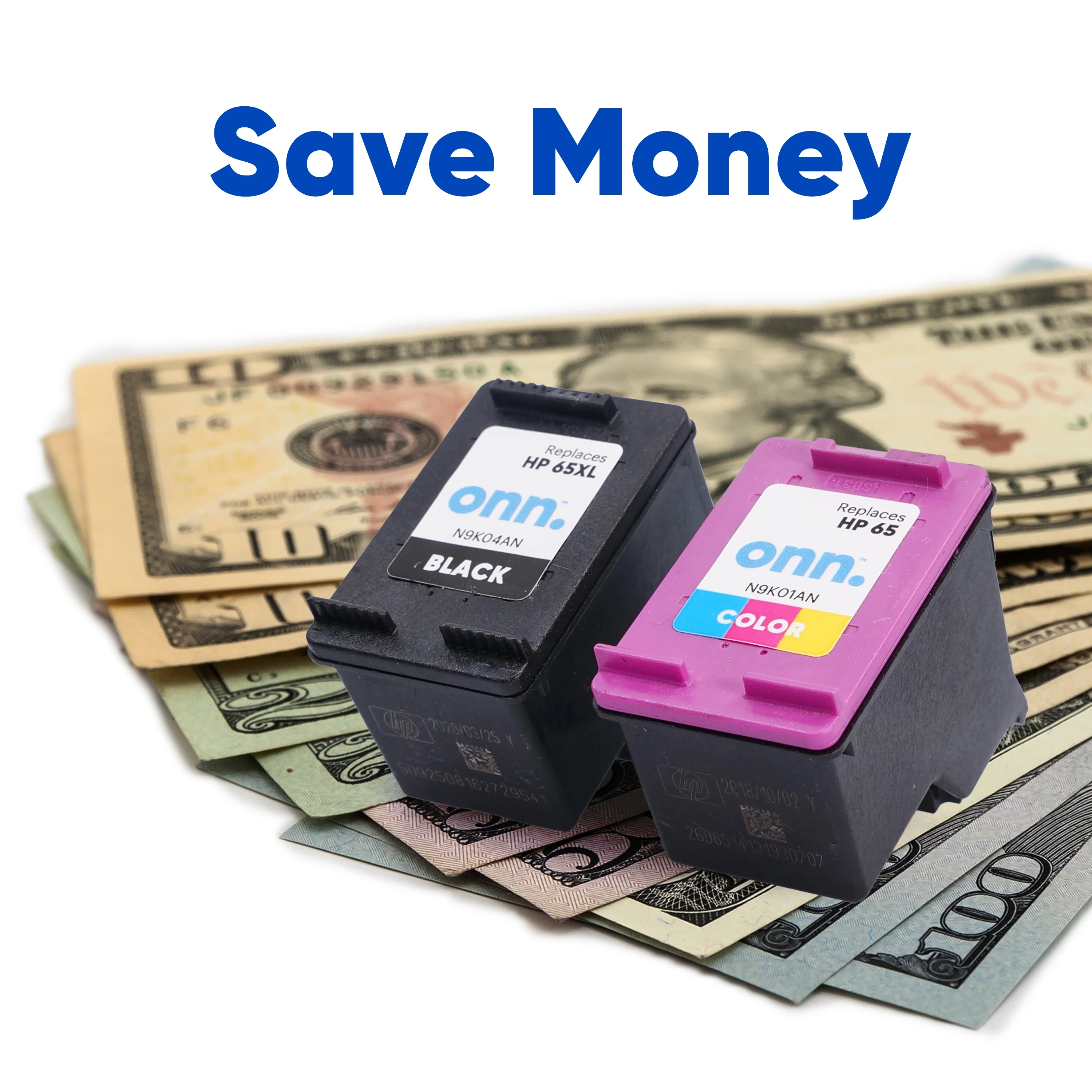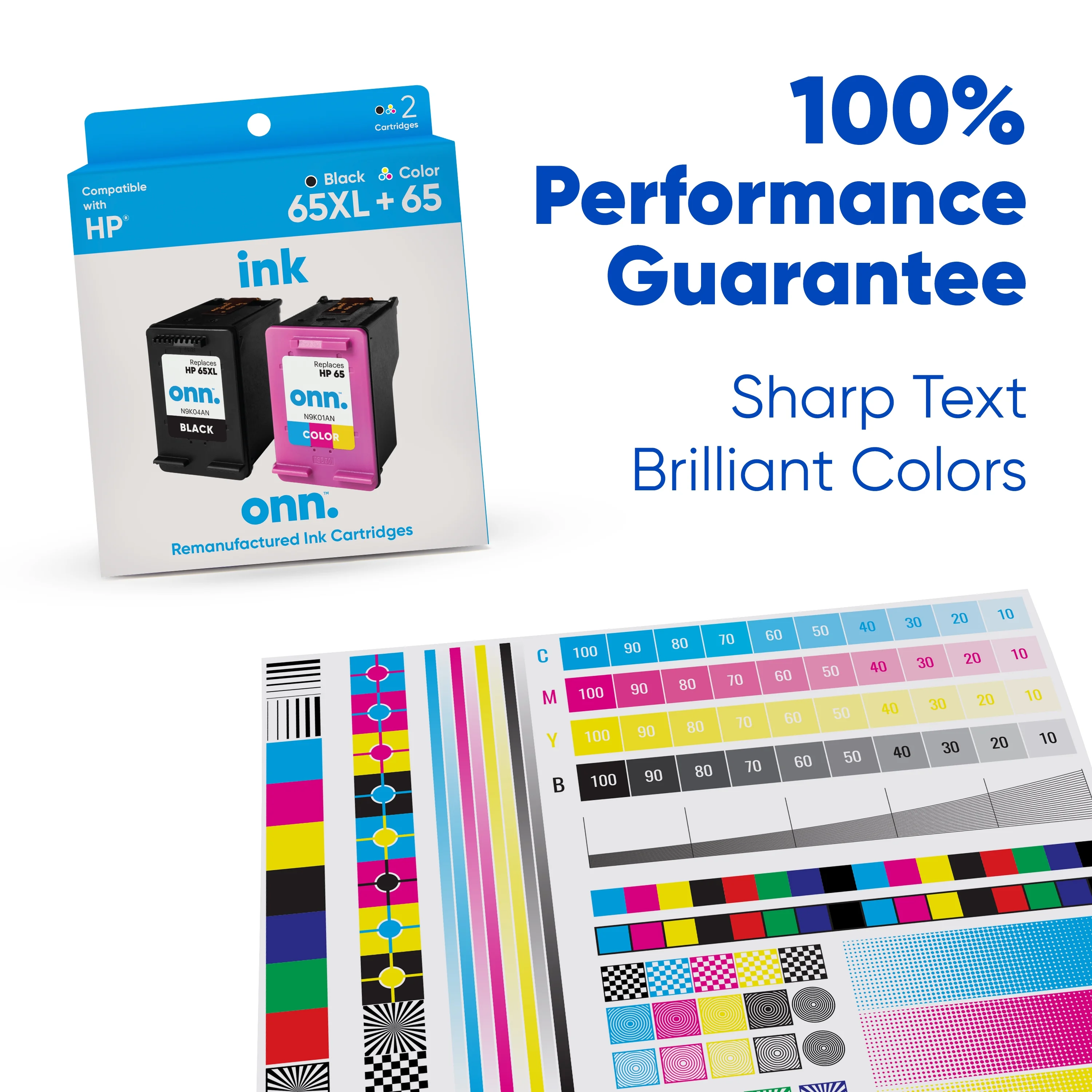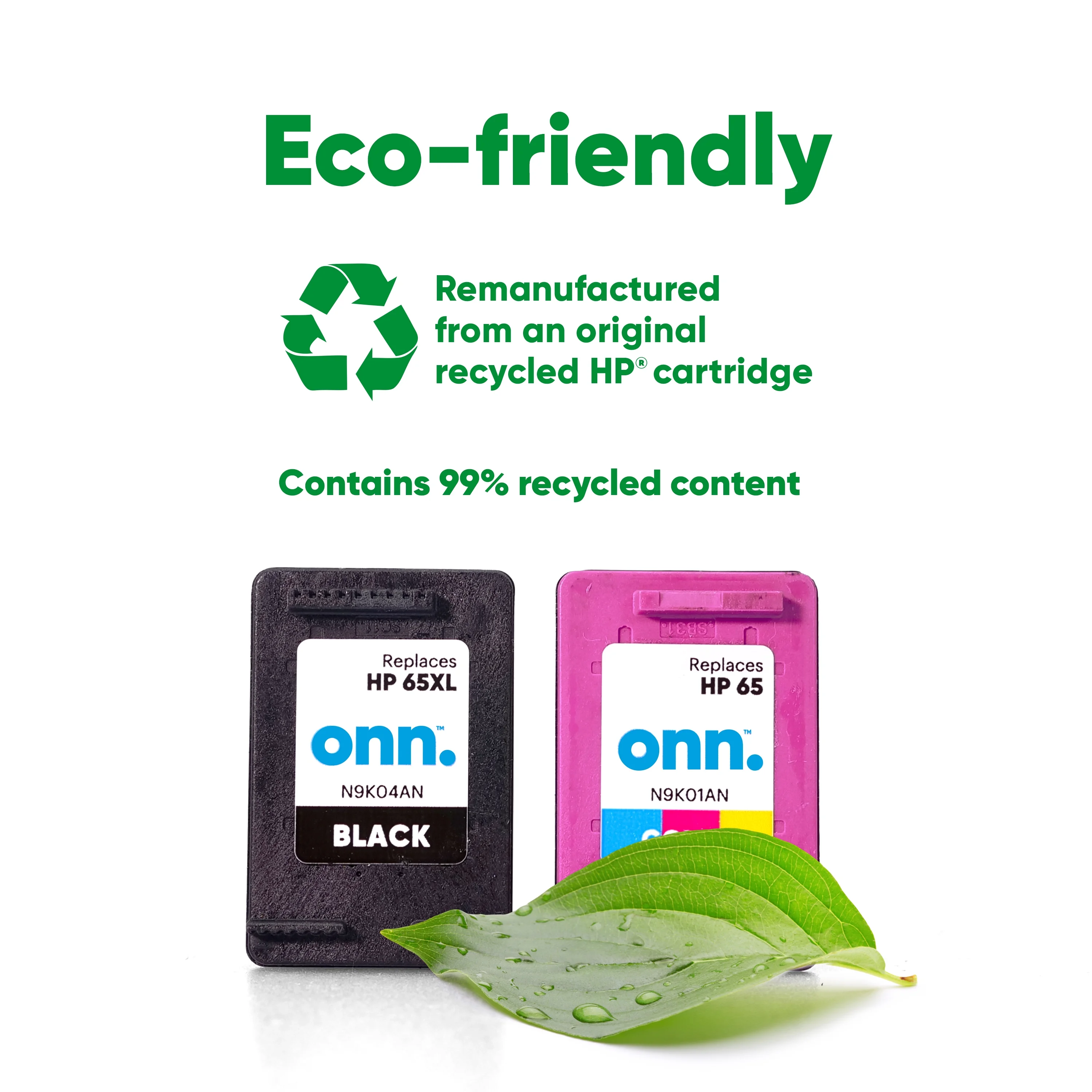 onn. HP 65XL Black and 65 Tri-Color Remanufactured Ink, 2 Cartridges: Compatible with HP printers One 65XL black cartridge and one 65 color cartridge Remanufactured using performance-tested recycled cartridges Ideal for home and office use Print colorful photos and professional-looking documents