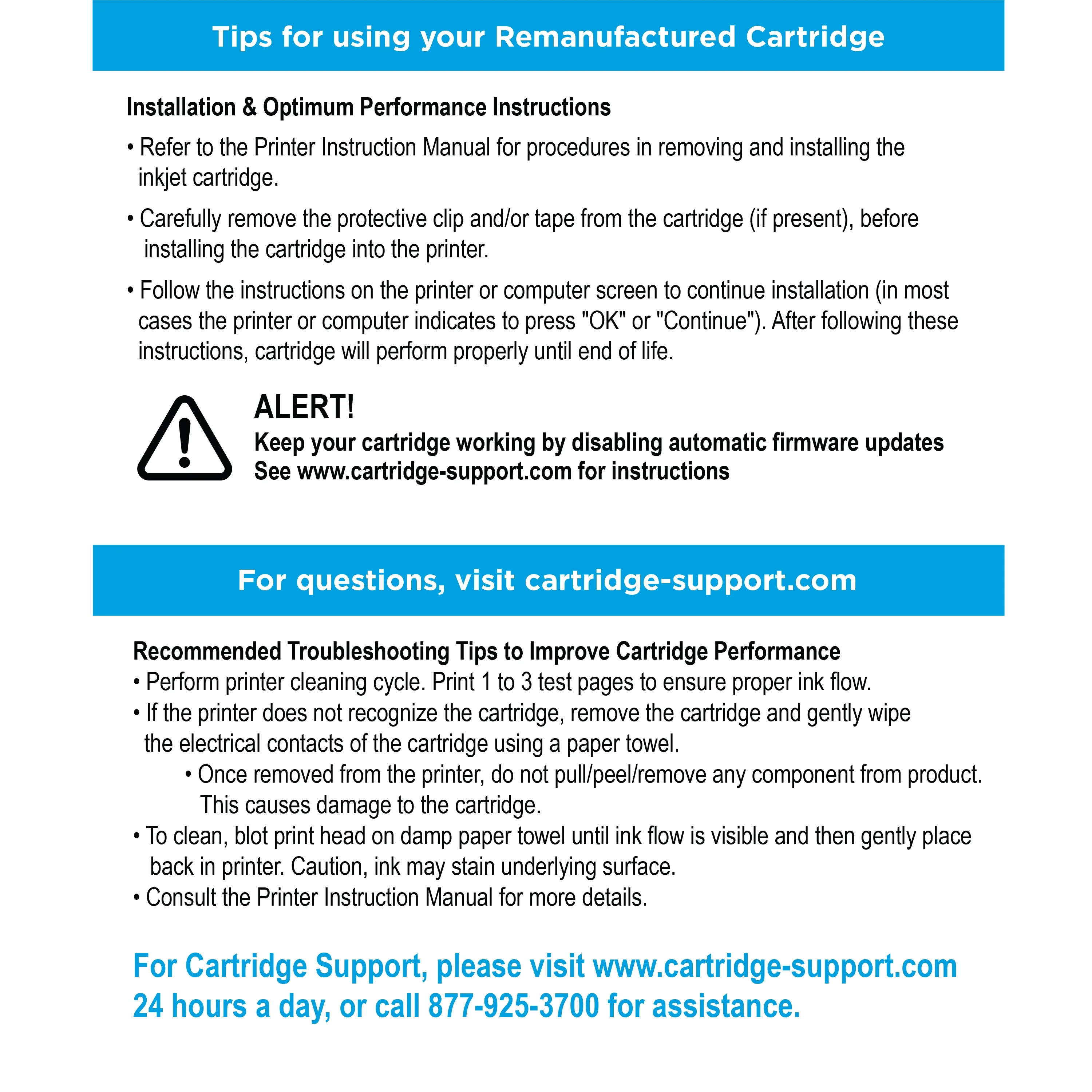 ONN™ brand Ink Cartridges provide high quality and great savings and are an ENVIRONMENTALLY FRIENDLY replacement alternative as it is a once-used genuine original that has been refurbished to perform like new. The use of this product will NOT void your printer warranty. Each cartridge processed has been specifically filled and then tested so it works like the original in your printer. These cartridges work with: HP AMP All-In-One 100, 105; DeskJet All-In-One 2620, 2621, 2622, 2624, 2625, 2630, 2632, 2633, 2635, 2652, 2655, 3720, 3721, 3722, 3730, 3732, 3733, 3735, 3750, 3752, 3755, 3758, 3760, 3762, 3764; ENVY All-In-One 5010, 5020, 5052, 5055. For support on your cartridge, call 877-925-3700; or go online to .