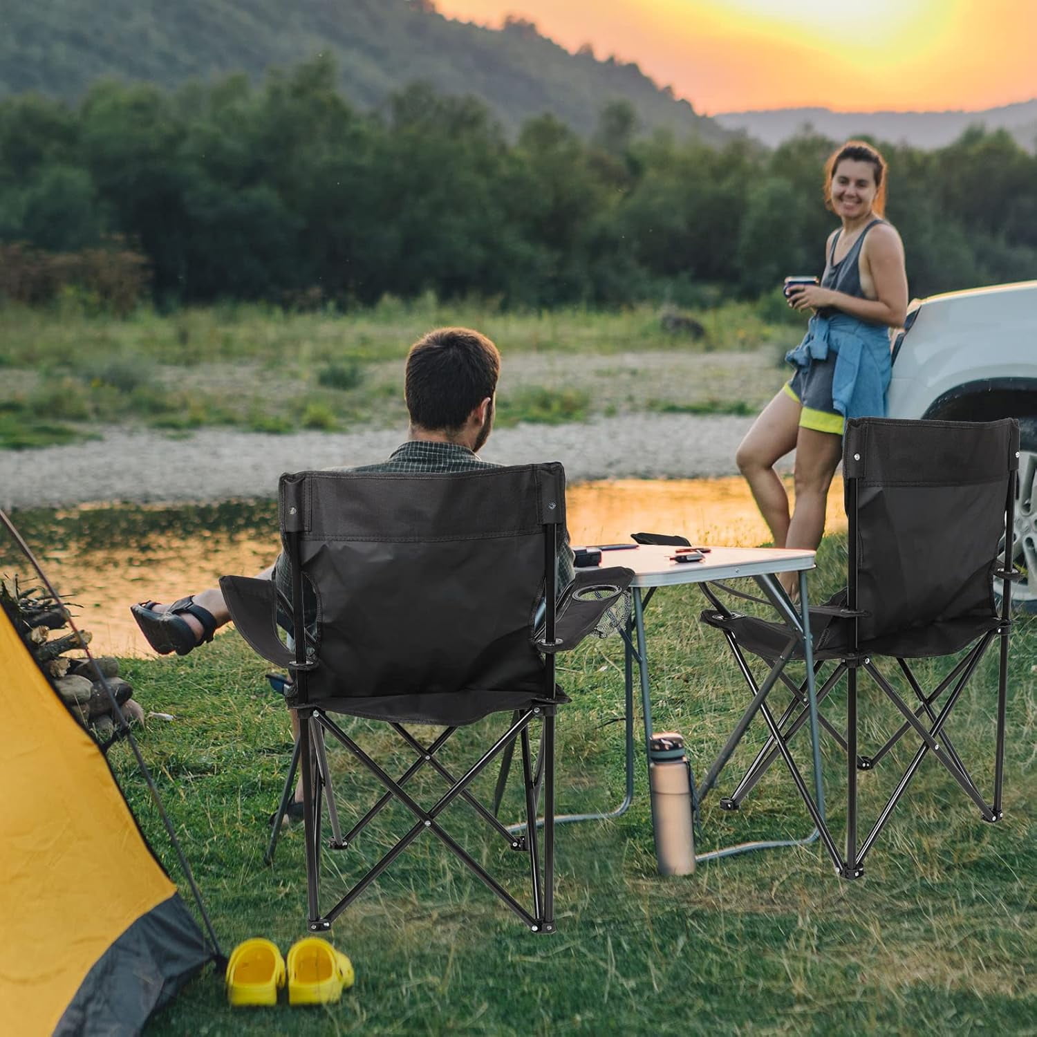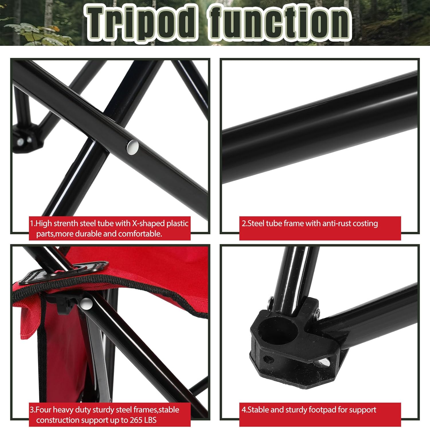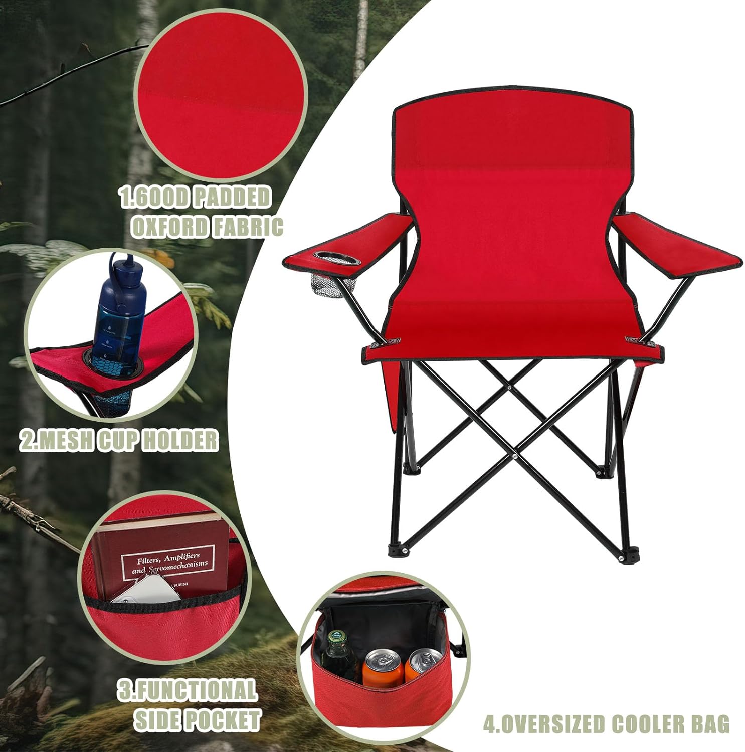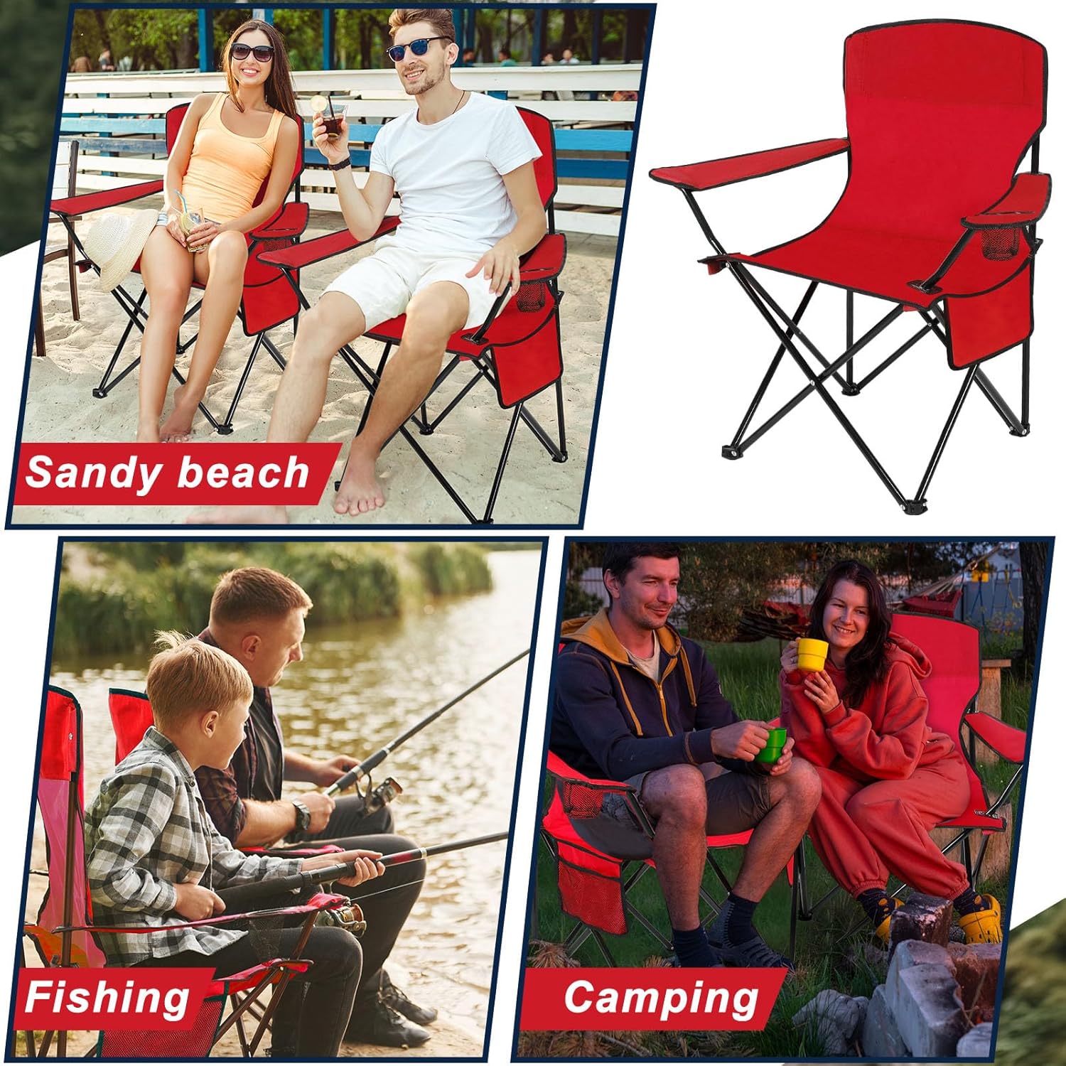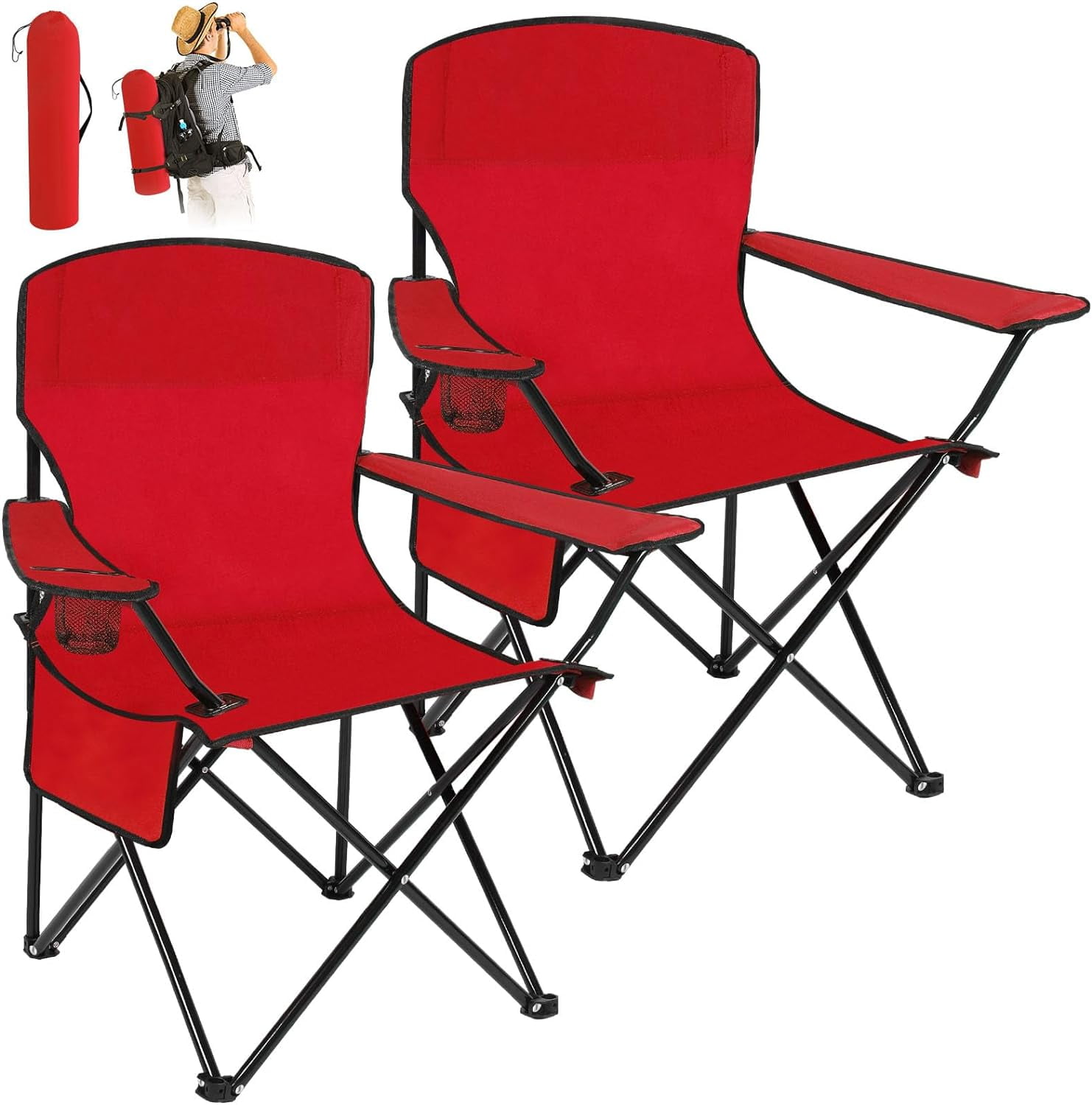 What You Get: you will get 2 pieces of folding chairs in red color, sufficient quantity can meet your outdoor use and replacement needs; You can treat as presents for your partners or neighbors, experience the charm of camping chairs together, help enhance your relationships Quality Material: these portable camping chairs are made of quality oxford fabric material, soft and comfortable, good in air permeability; The collapsible chairs use thickened steel pipe, stable structure, which make it support up to 265 lbs, so you can sit on it without worrying about the chair collapsing Cup Holder and Pocket: each lightweight lawn chairs are equipped with cup holder on the side, beautiful and practical; Can put your favorite drink on the mesh cup holder, then enjoy the beautiful view while having drinks, get a comfortable experience; Side storage bag holds cell phone, magazines, notebook, map and other personal items, bring you a good sense of convenience Portable Design: these outdoor folding chairs adopt a foldable design, which can be folded in flat shape, easy to transport and storage; Each chair come with a portable carrying bag, can put the red folding chairs in it, then carry anywhere like, take a break anytime and anywhere want Multiple Occasions: these folding chairs for outside are lightweight and portable, which are a good helper for outdoor camping; You can bring beach chairs to outdoor activities, such as camping, hiking, boating, hunting, fishing, sporting events and traveling; They can also be applied at home, garden, patio, office, porch or other indoor activities, will help increase the happiness in your life