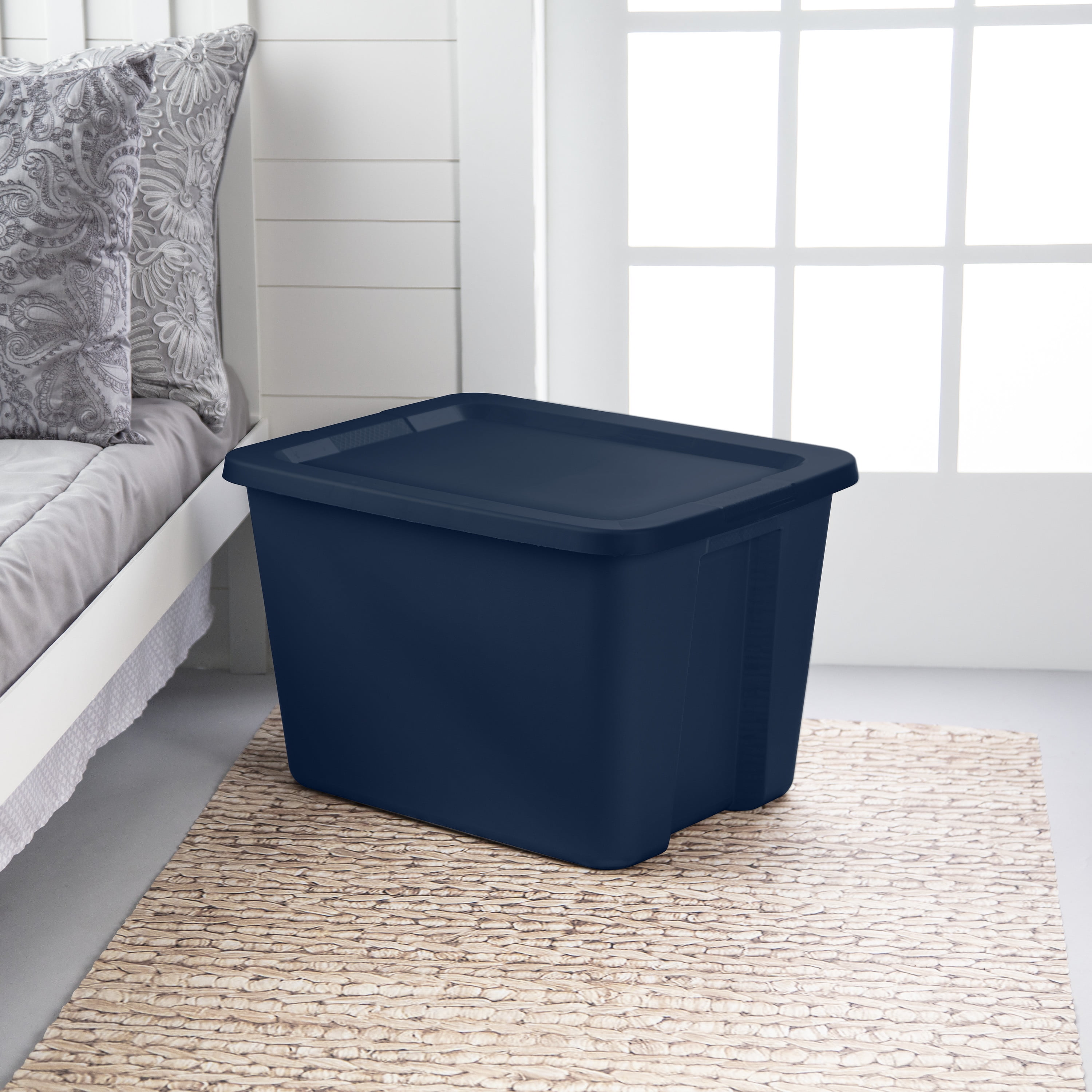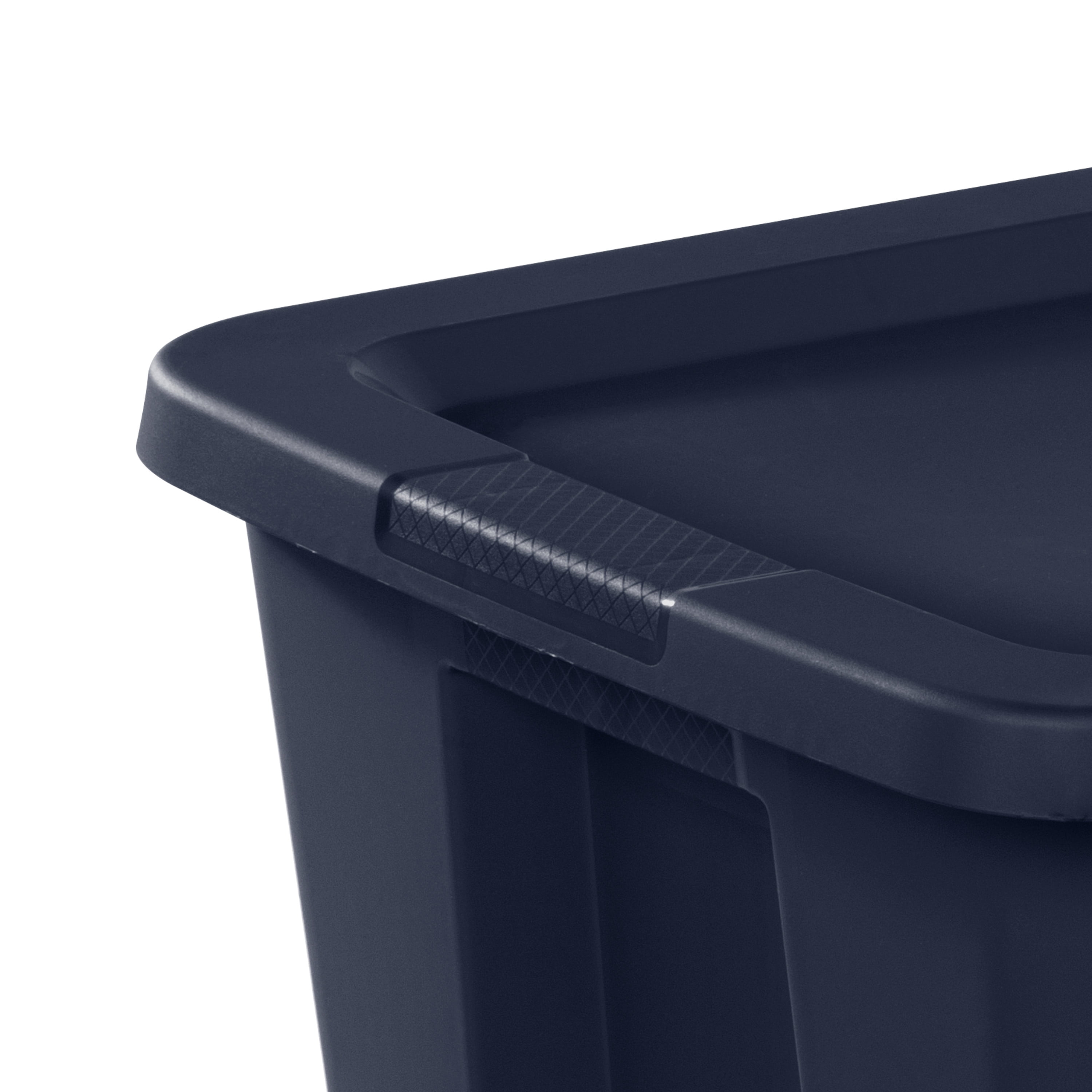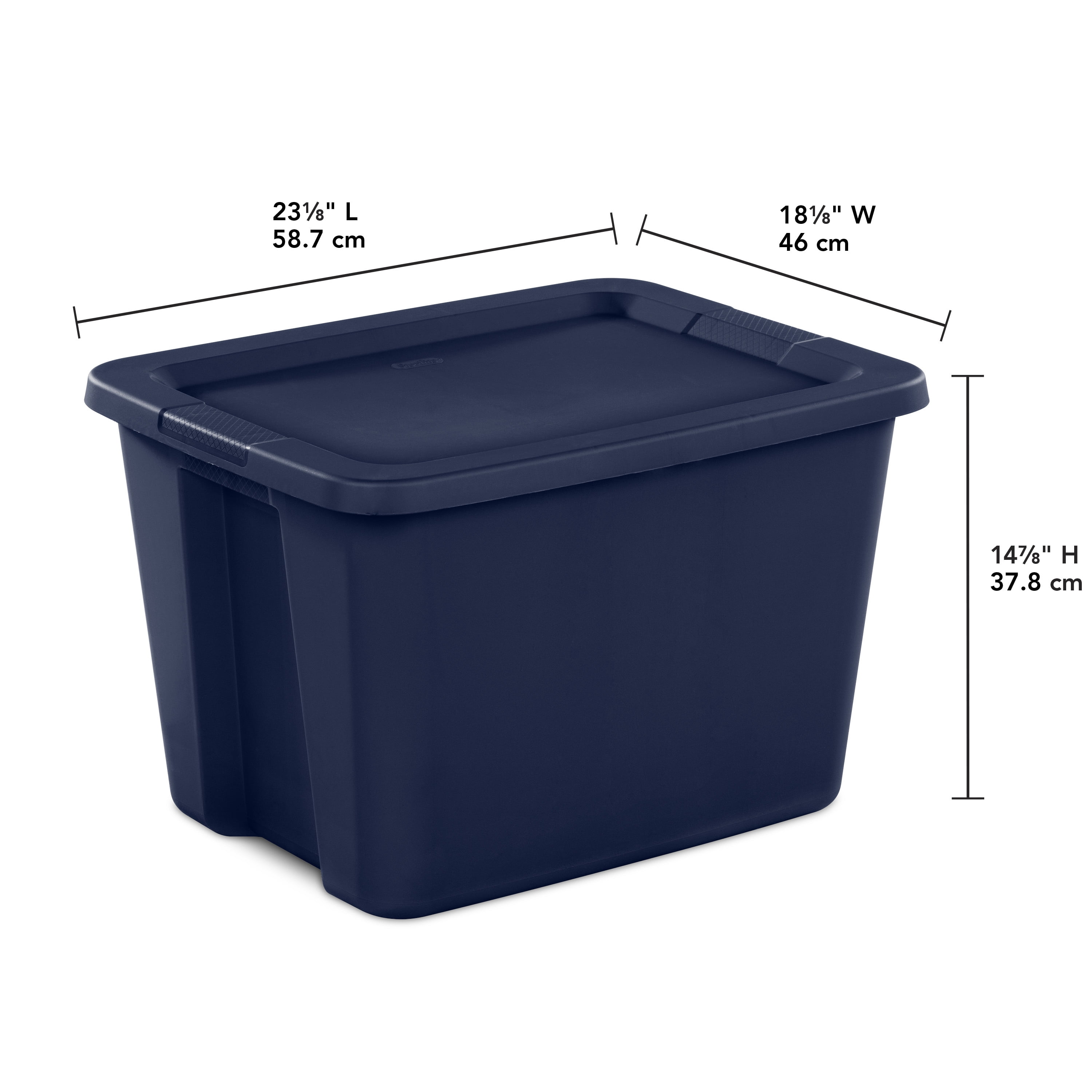 Sterilite Adult Plastic 18 Gal. Tote Box Blue Cove: Outside Dimensions: 23 1/8″ x 18 1/8″ x 14 7/8″ This popular size 18 Gallon Tote is ideal for a variety of basic household needs Single unit option Opaque base allows contents to be stored and concealed out of sight – Blue Cove Interior Dimensions at bottom: 16 3/4″ x 13 3/4″ x 14 3/8″ This popular size tote is ideal for a variety of lightweight household storage needs, such as clothing, toys, and linens Integrated handles with textured surface provides a sure grip for more comfortable carrying Lid snaps firmly to base to ensure contents stay contained and concealed Deep recessed lid allows for secure stacking to maximize vertical storage space BPA-free and phthalate-free