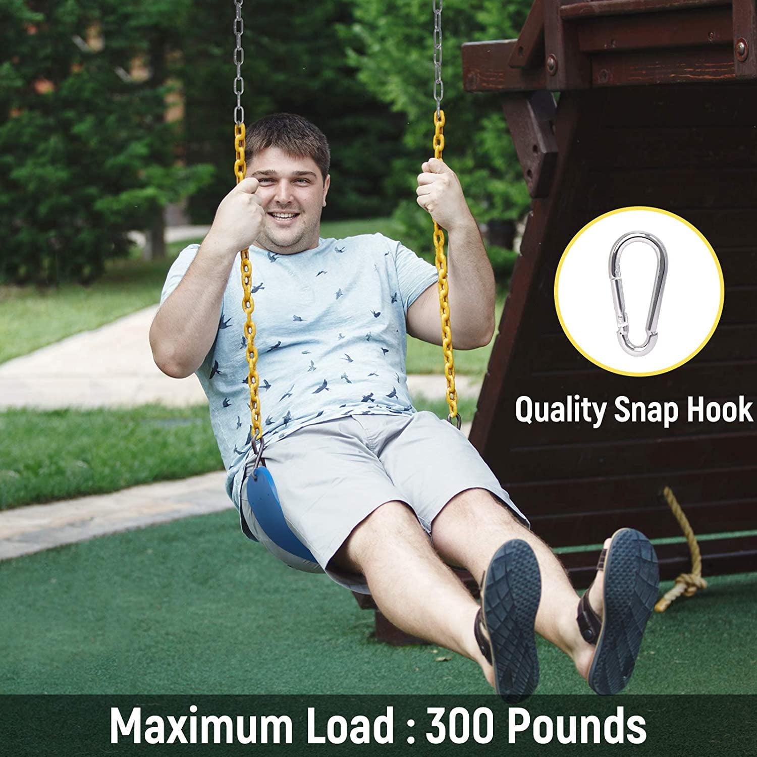 Thickened Swing Seat: Made of tough EVA elastic material, the swing has ultimate strength and flexibility, and soft and non-slip frosted texture brings an exceptional comfort to your sitting. Heavy-Duty Chain: Measured 66 inches, the zinc-plated chain offers strong support and resists rust and corrosion, and the plastic coating protects you from being pinched. Large Capacity: Features a maximum capacity of 300lbs, the swing set is universal for all ages, including kids and adults. (Children should play under parents’ supervision.) Easy to Use & Install: Use stainless snap hooks to connect the sturdy hanging straps and chains, fix them firmly on a wooden bar or a tree, and you can enjoy swinging. Great Fun Play: This 2-pack swing set accessories are the ideal pick whether you replace an existing swing set or set up a new one at your playground, backyard, patio, etc! (For residential use only)