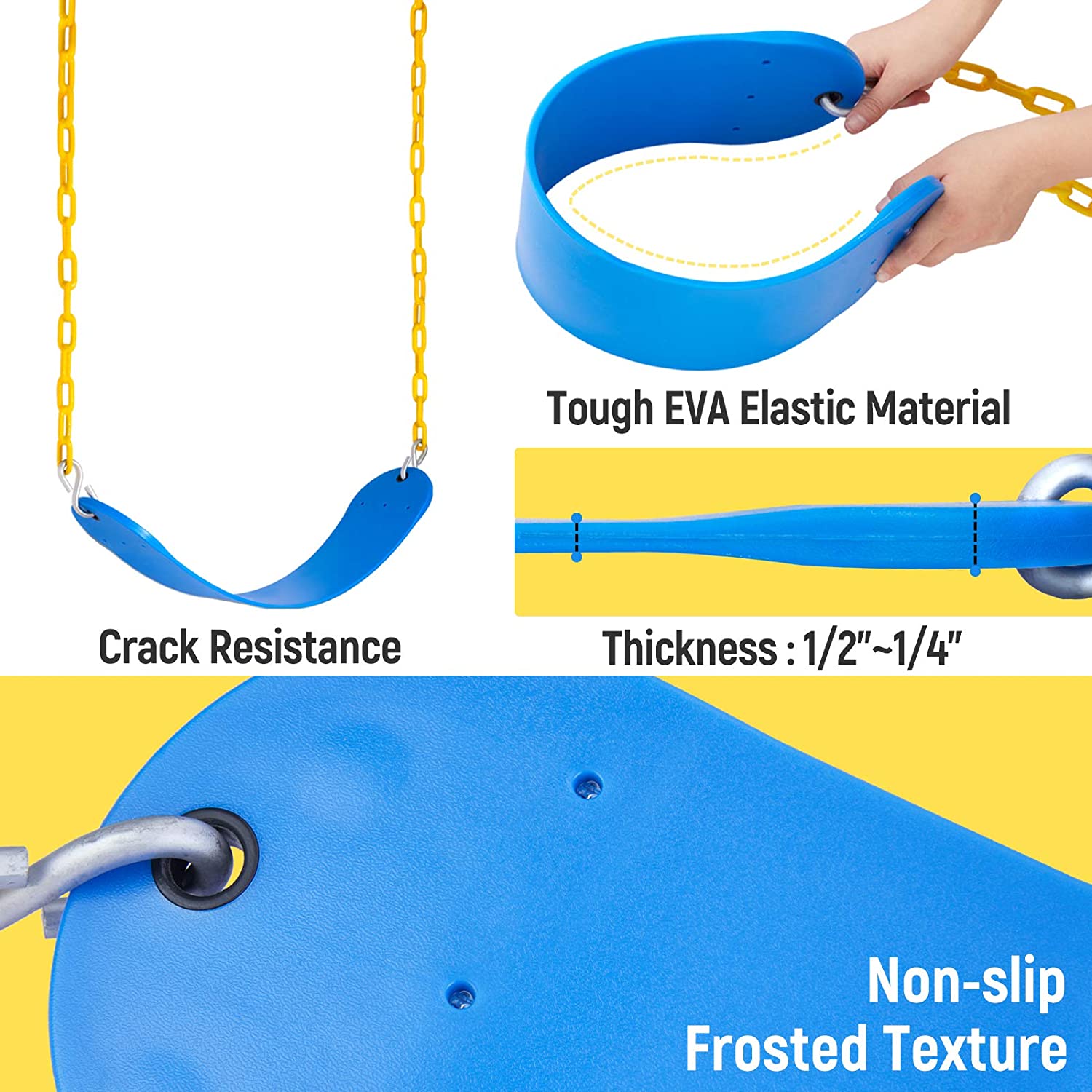 Specifications: Material: EVA Plastic, Galvanized Steel, Thermoplastic Coating Swing Seat: 26.5 x 5.5 Inches (L x W) Thickness: 1/2-1/4 Inch Hanging Strap Length: 20 Inches Chain Length: 66 Inches Package Included: 4 x Hanging Strap 4 x Chain 2 x Swing Seat 4 x Snap Hook 4 x S hook Key Features: