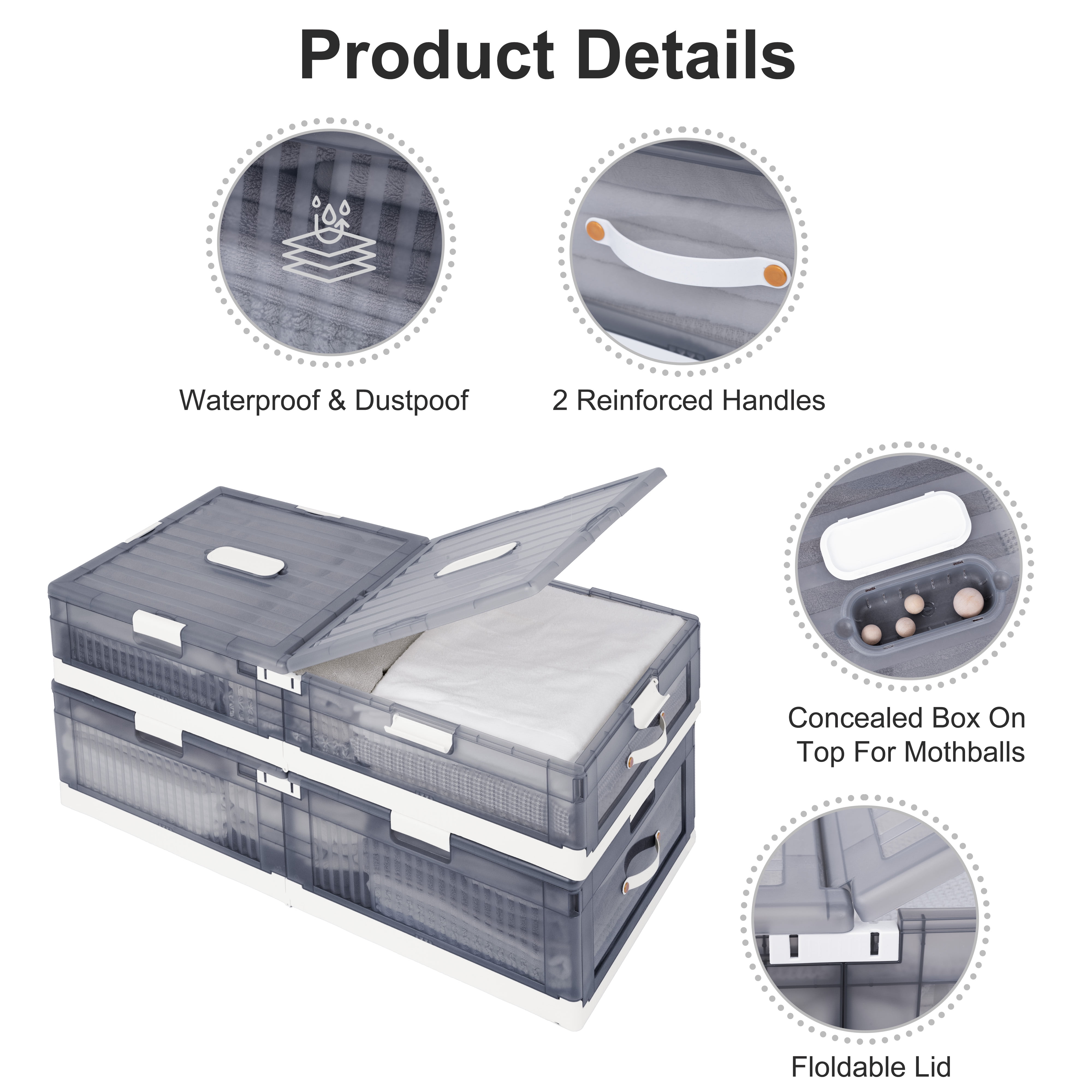 Sturdy reinforced plastic construction Dustproofbtransparent lid Collapses for compact storage Concealed compartment on the top for charcoal bag Wheels for easy maneuvering Boxes can be stacked together