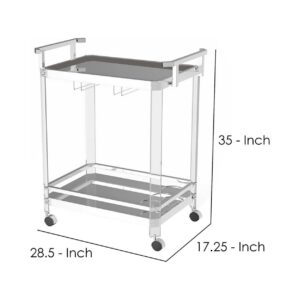 A serving cart is a delightful accoutrement for any home bar or indoor patio. This serving cart takes it to another level with an acrylic and metal frame finished in chrome. It features clear tempered glass shelves that’s simple yet modern. Bottom shelf features wine bottle holders while top shelf features a stemware rack underneath. With convenient wheels, take this serving cart wherever drinks are in demand.