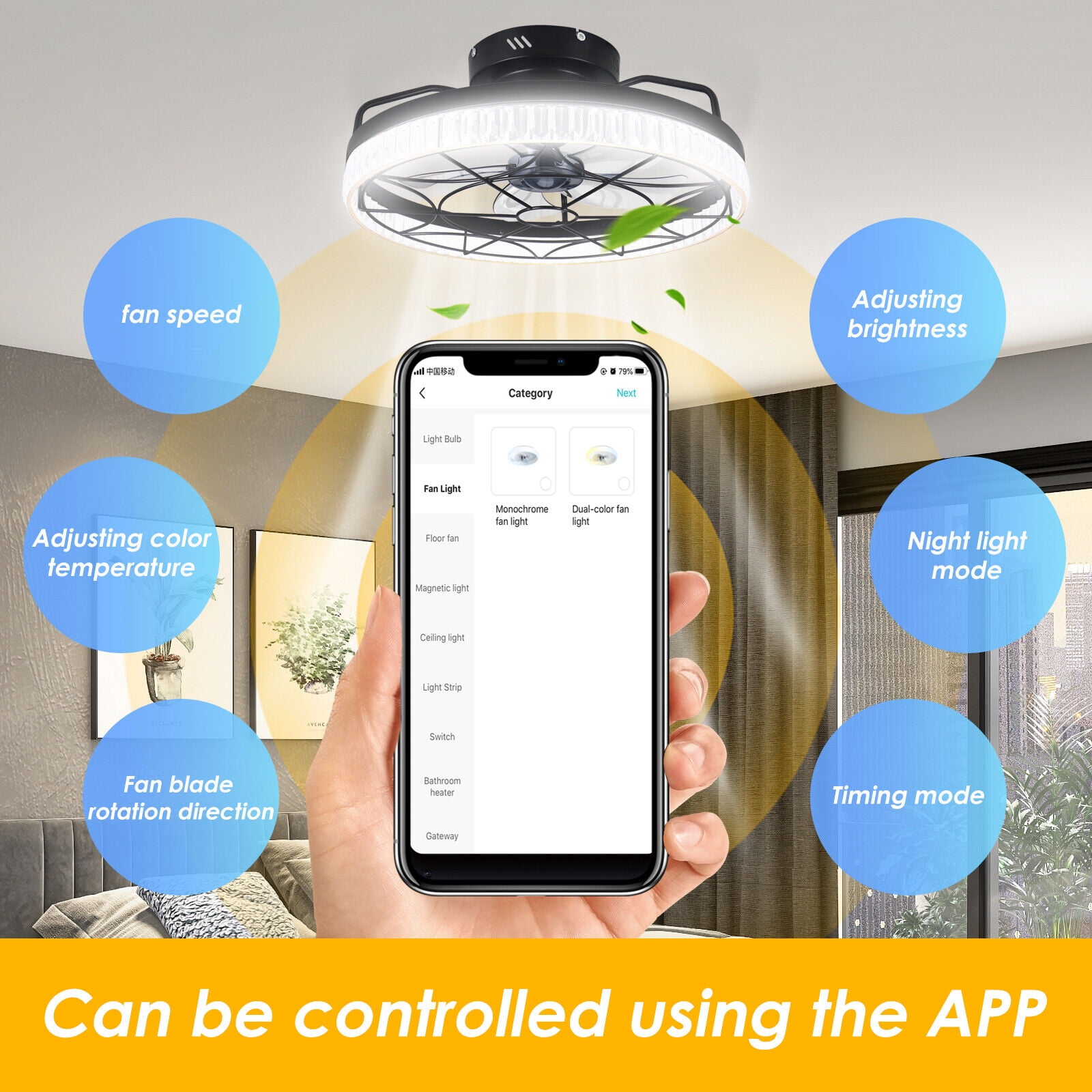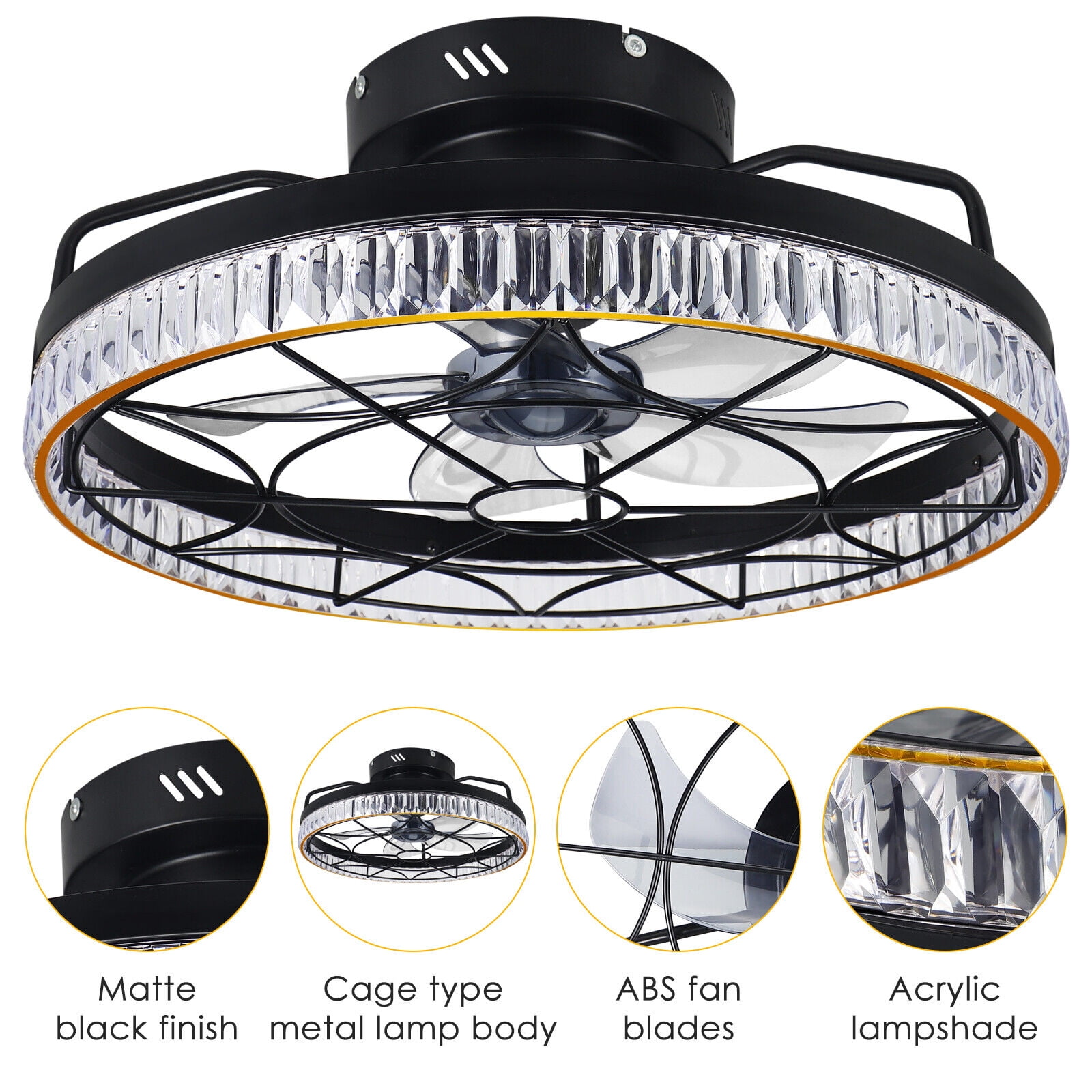 2-in-1 Low Profile Ceiling Fans with Lights: This is a modern industrial style decorative ceiling fan light, equipped with a metal cage enclosure, which not only has the beauty of a lamp but also the practicality of a fan, making it the first choice for indoor decoration. The lamp and fan of the ceiling fan light are individually controlled, which can provide you with lighting and allow you to enjoy the cool breeze. Excellent Acrylic LED Light: Acrylic has good transparency and a clear and delicate texture, which can perfectly reflect the light emitted by the LED lamp, thus ensuring the service life of the lampshade. In addition, it also has the effect of energy conservation, as it has the characteristic of high temperature resistance, which can effectively block the high temperature outside the lampshade, thereby reducing the electricity consumption of LED lights during use and saving energy. APP & Remote Control: The small ceiling fan with light can be freely adjusted through the remote control or APP for functions such as light brightness, color temperature, and wind speed. Technology transforms life, let this small ceiling fan with light create a beautiful living atmosphere with you! Professional Noise-cancelling Design: The flush mount ceiling fan light has 5 blades and produces no more than 40 decibels of sound when in operation, the equivalent of a person whispering. This quiet flush mount ceiling fan light is ideal for children’s rooms, attics, studies, bedrooms and rooms with low ceilings. Multi Functional Ceiling Fan Light: This small ceiling fan with light has complete functions, with 6 wind speeds, color temperature, and brightness can be freely adjusted. In addition to the night light mode, timing function, and natural wind mode, it is also equipped with a forward and reverse rotation function of the fan blades, which can bring you fresh air even in winter.