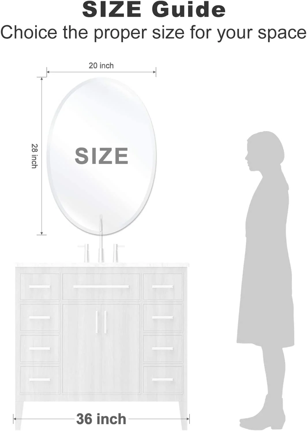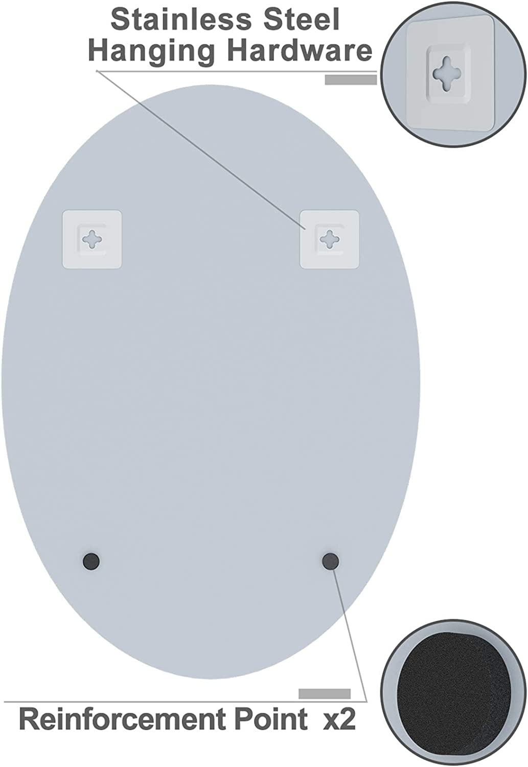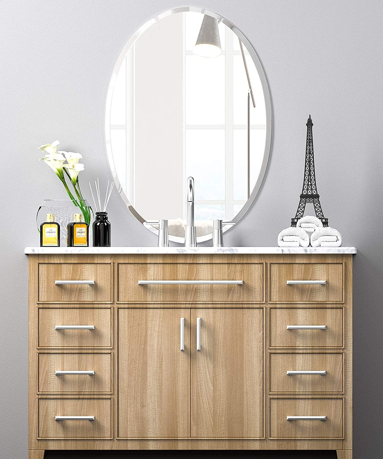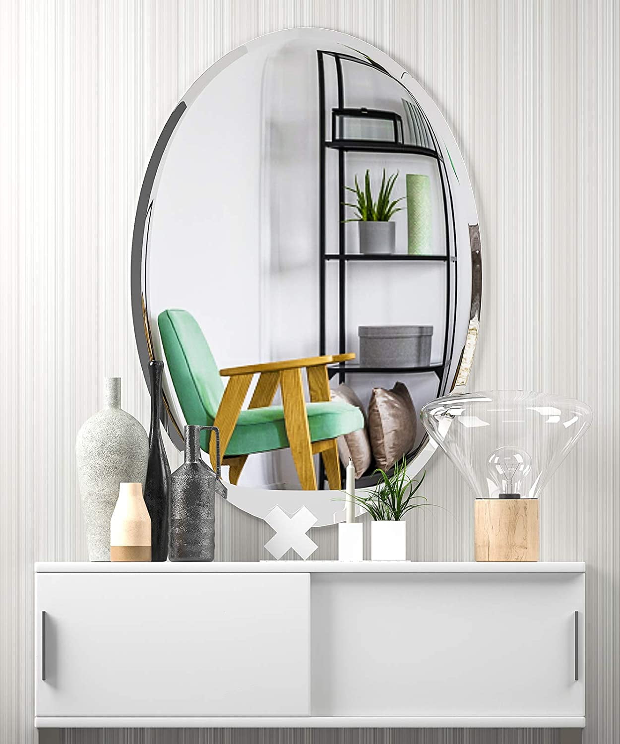 【Superior Durability】 Made with top-grade glass that is 1/4-inch thick and a pure silver backing, this mirror offers exceptional durability and a remarkably clear reflection. 【Generous Size】 Measuring 20 x 28 inches, this large beveled oval mirror is perfect for enhancing small spaces, making them appear larger and brighter. Great for bathrooms, entryways, living rooms, and more. 【Refined and Safe】 The smooth and shiny polished edges, along with 1-inch beveled corners, provide a refined premium look while ensuring safety by preventing sharp edges. 【Sleek Modern Design】 Create a polished finishing touch to any room with a contemporary and frameless design. The unique 1″ beveled edge adds a touch of elegance. 【Hassle-Free Installation】 With all mounting hardware and hangers included, this mirror can be easily and securely installed within minutes for your convenience.