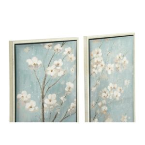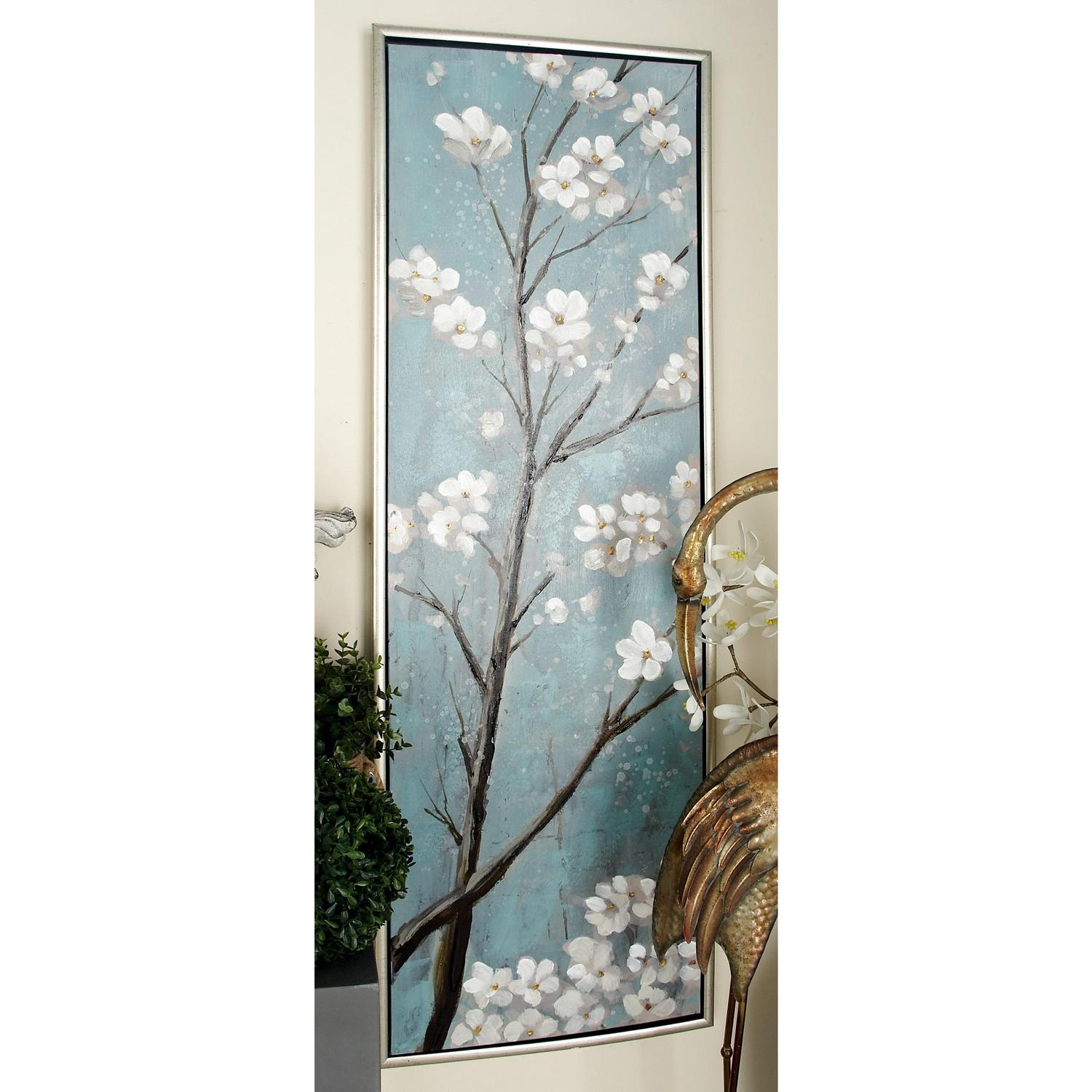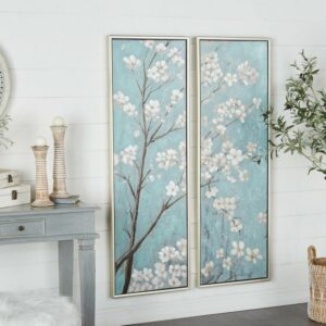 20″ x 59″ Cherry Blossom Floral Framed Wall Art with Silver Frame, by DecMode (2 Count) is a unique addition to your stylish home. This wall art exude natural beauty and sophistication in both color and composition. Showcase your personality and turn your walls into an art gallery with this impressive wall art. Bring a delicate touch to your neutral and pastel-toned wall with these traditional floral canvas art. This item ships in 1 carton. Can be hung vertically using the sawtooths on the back; nails and screws not included. Suitable for indoor use only. This item ships fully assembled in one piece. This teal colored canvas wall art comes as a set of 2. Traditional style.