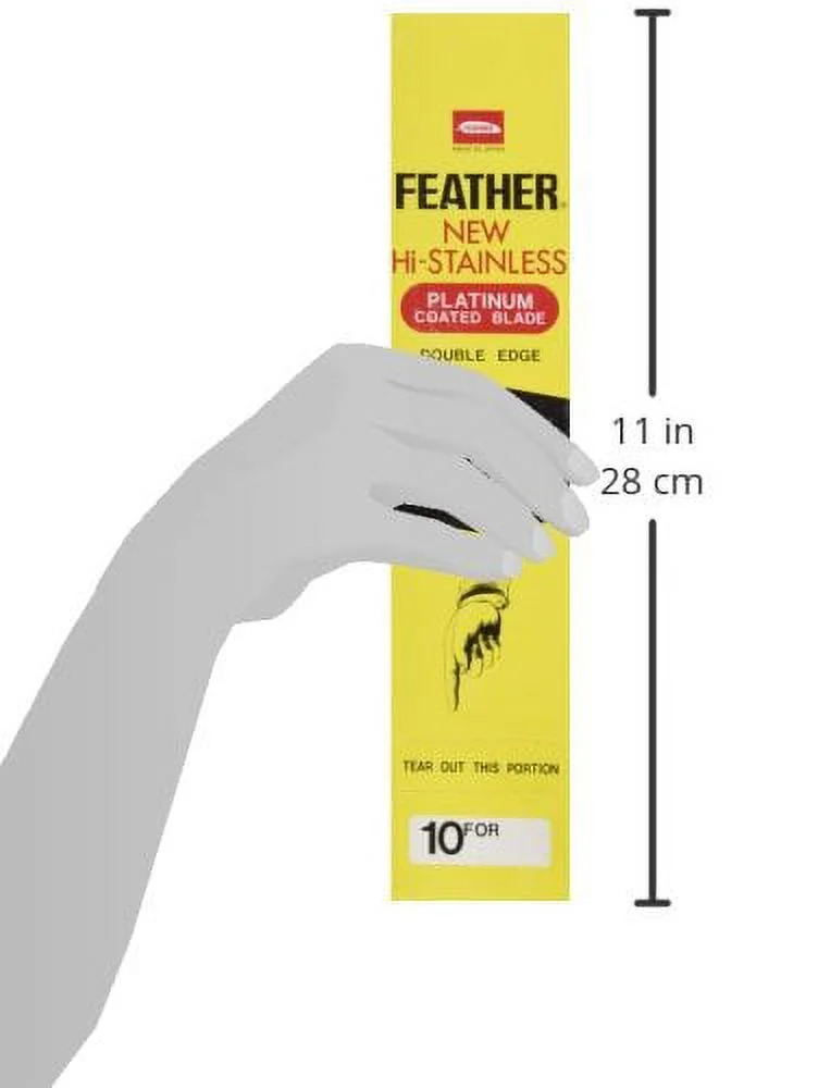 200 Feather Razor Blades NEW Hi-Stainless Double Edge. Sharp razor blades from Feather, made in Japan. Fit all traditional double edge safety razors. These sharp double edge blades are made from high class stainless steel, which has been surface treated with platinum for optimal comfort. A double edge razor blade lasts 3-5 times as long as the popular 3-blade systems. You can easily get 6-8 shaves with one blade! Feather Double Edge Razor Blades come in 10 blade tucks.