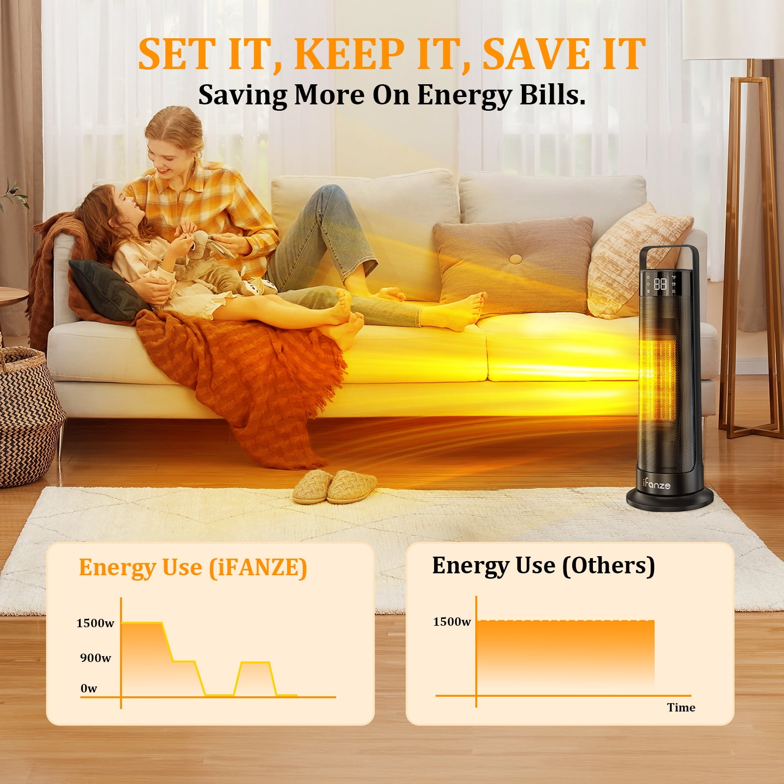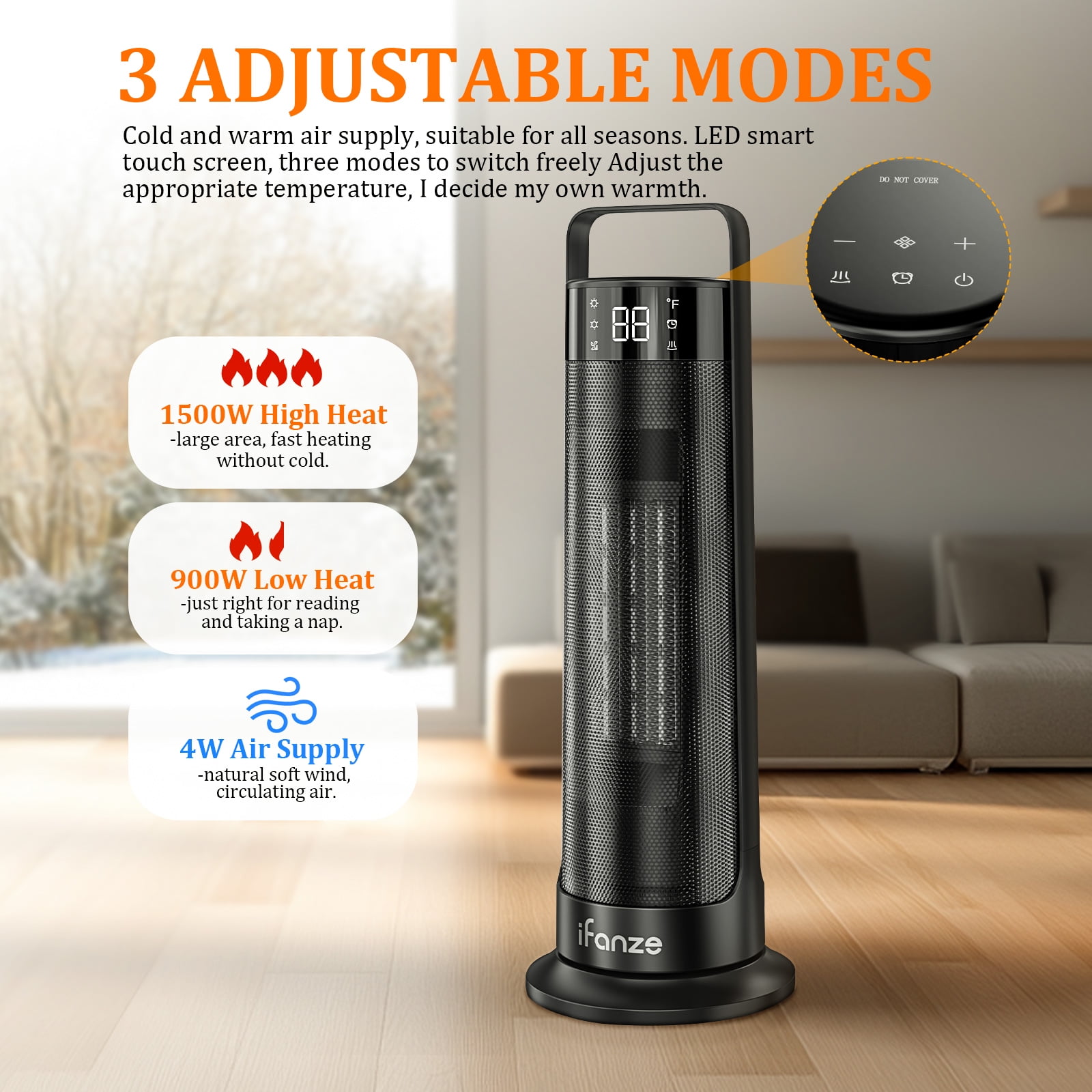 Rapid And Potent Warmth Prepare for the cold months with your perfect ally — Our-warming room heater for maintaining cozy temperatures. An indoor space heater, enhanced with a robust DC motor and 1500W PTC heating innovation, warms rooms in 3 seconds, beats winter blues. The quiet ceramic heater operates at a sound level below <40db, ensuring peaceful sleep. Always At The Perfect Temperature This electric heater with Thermostat allows you to set your desired heat level within a wide range of 50-95℉ with ±1℉ increments, ensuring precise and efficient heating. This feature not only keeps you comfortable but also helps save energy. 1-12h timer automatically stops the heater, saving more energy. Just set it and focus on your own matters without worries. Total Control At Your Fingertips Take charge of your comfort with the user-friendly operation of our 21" space heater. Whether you prefer the ease of the backlit display or the convenience of the included remote control, you have the power to customize your heating experience. The clearly labeled buttons allow you to easily set the desired temperature, activate the 1-12h timer, choose the 3 modes, engage the oscillation, or power the space heater on and off. With intuitive controls, you can personalize your heating settings with ease. Enjoy Cozy Comfort In Every Corner With its 50-degree oscillation feature, this heater ensures wide coverage throughout the room, spreading warmth to every corner. Experience cozy comfort no matter where you are, as the oscillation helps distribute heat evenly and efficiently. Stay warm and snug without any cold spots, thanks to the wide-reaching warmth of this versatile heater. 3 Modes And Convenient Carry Handle Cold( fan mode) and warm(low heat and high heat) air supply, suitable for all seasons. LED smart touch screen, three modes to switch freely, adjust the appropriate temperature, decide yourself warmth. The convenient carrying handle brings much comfort for you to carry this 21" lightweight heater from one room to another. Great for quickly heating small to large rooms including office, bedroom, living room, baby room, basement, and garage on cold days. Warm Tips: There is 15 seconds countdown delay after it is turned off because the fan keep working for a while to dissipate heat, for extending life of your heater. What‘s In The Box 1x User Manual 1x PTC Ceramic Space Heater 1x Remote Control ( 2 AAA Batteries not included )