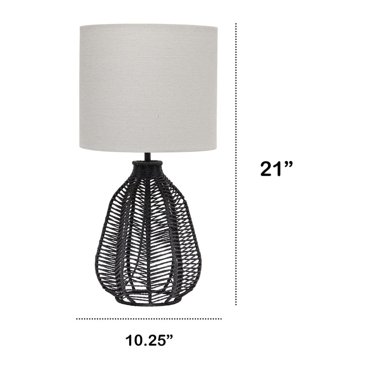 21″ Vintage Rattan Wicker Style Paper Rope Bedside Table Lamp With Light Gray Fabric Shade, Black Description: Layers of horizontal linear patterns made primarily of paper rope and metal create the impression and style of this vintage inspired table lamp. Paired with a light gray linen shade, this combination is bound to compliment the existing fashion upheld in your home. This is the perfect piece to accent your home decor, whether in your living room, on your nightstand in your bedroom, or office! Light gray linen shade. Black base of paper rope. Features a rotary switch on socket for convenience. Shade measures D: 10.25″ x H: 9″. Features a 60″ black plug in cord. Alternate base color available. Base Type: E26 Medium Base. Base Dimensions: L: 8 x W: 8 x H: 10.75. Height from Base to Shade: 11.625. Height from Base to Socket + Socket: 11.75 + 2.875. Bulb Included: No. Weighted Base: No. Does the item contain wood: No. Replacement Parts Available: Yes. Features: Product Dimensions: 10.25″L x 10.25″W x 21″H. Product Weight: 1.63 lbs. Finish/Color: Black. Primary Material: Linen fabric Certification: UL. Case Pack: 4. Cuft: 4.86823590625. Bulb Type: Incandescent (A19). Switch Type: Rotary. Switch Location: Socket Shade Diameter: 10.25. Shade Top Opening: 10.25. Shade Bottom Opening: 10.25. Shade Height/ Slant: 9. Shade Security: Socket nut Shade Shape: Drum. Number of Lights: 1. Maximum Wattage: 40. Shade Material: Linen. Cord Color: Black. Cord Length: 60 Material Breakdown: 48% linen fabric 25% metal 25% paper rope 2% plastic. Style: Coastal Alternate: Traditional. Assembly Required: None. Adjustable: No. Hardware Included: No Brand Name: Lalia Home Model No: 1270-LHT-4017-BK