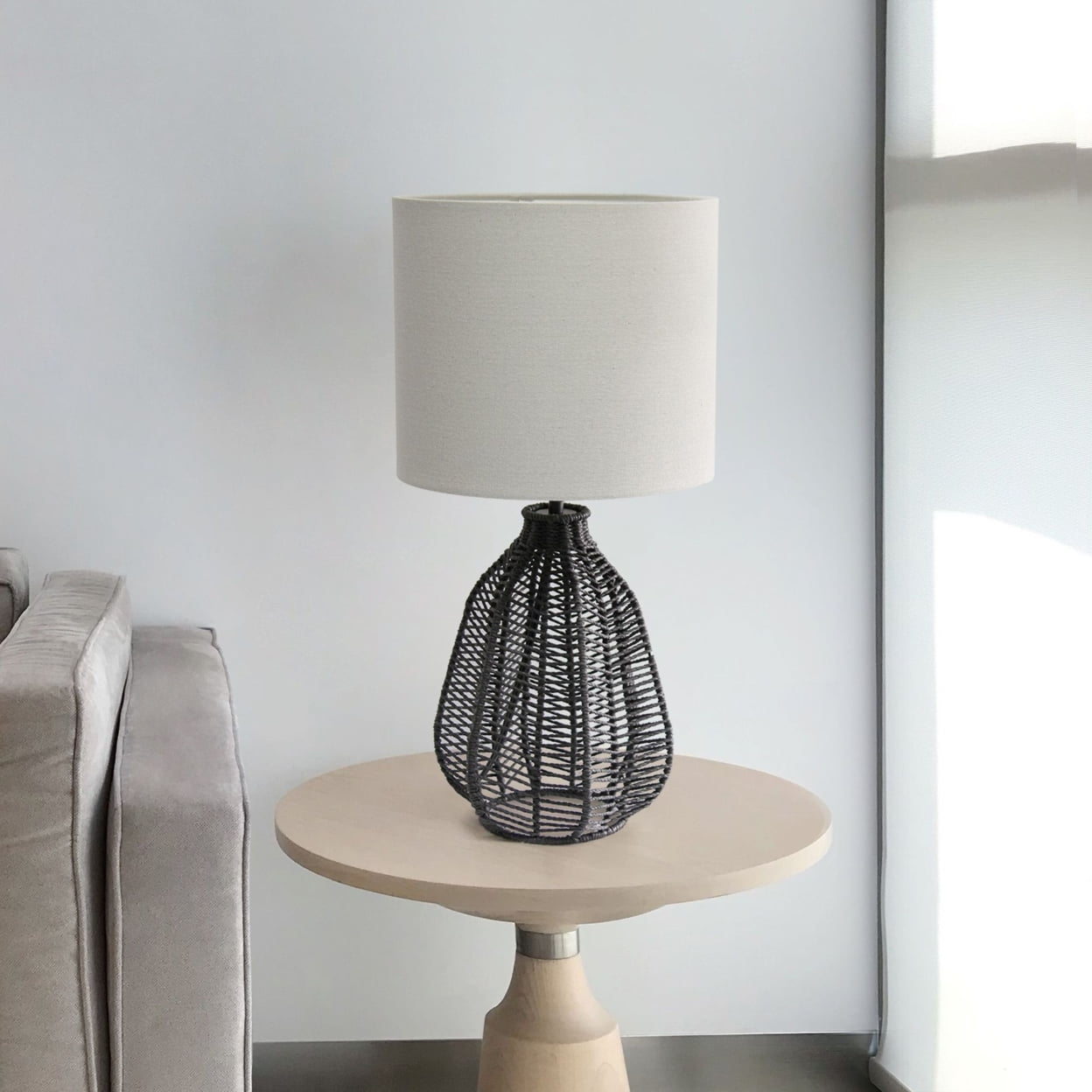 Light gray linen shade Black base of paper rope Features a rotary switch on socket for convenience