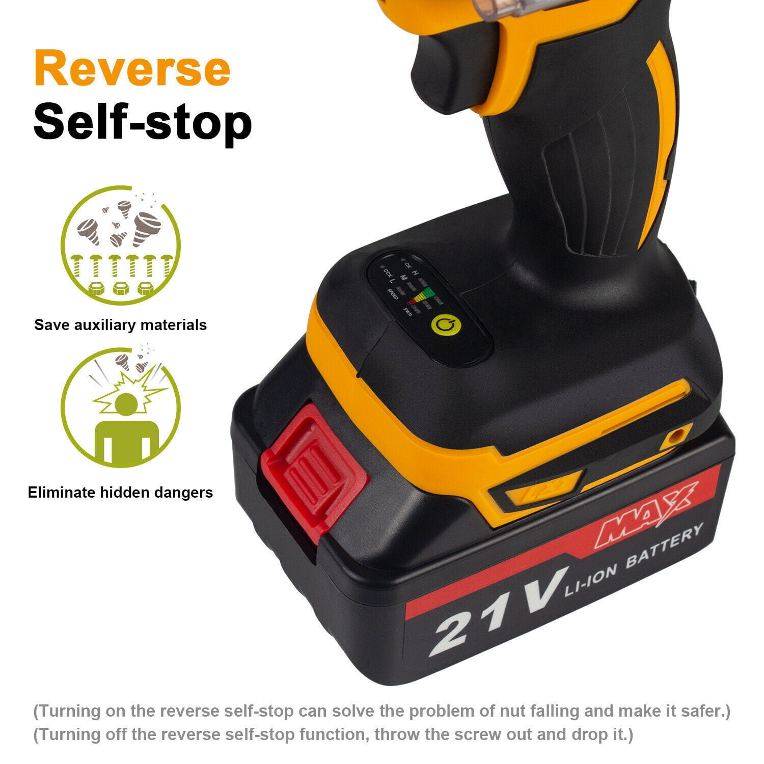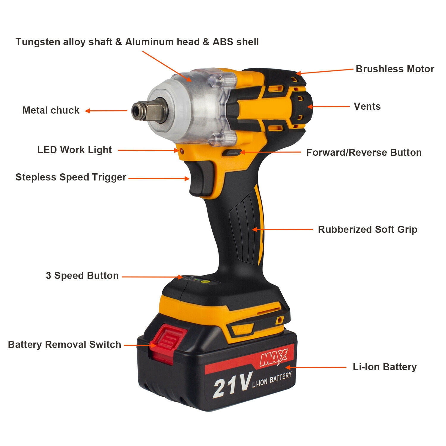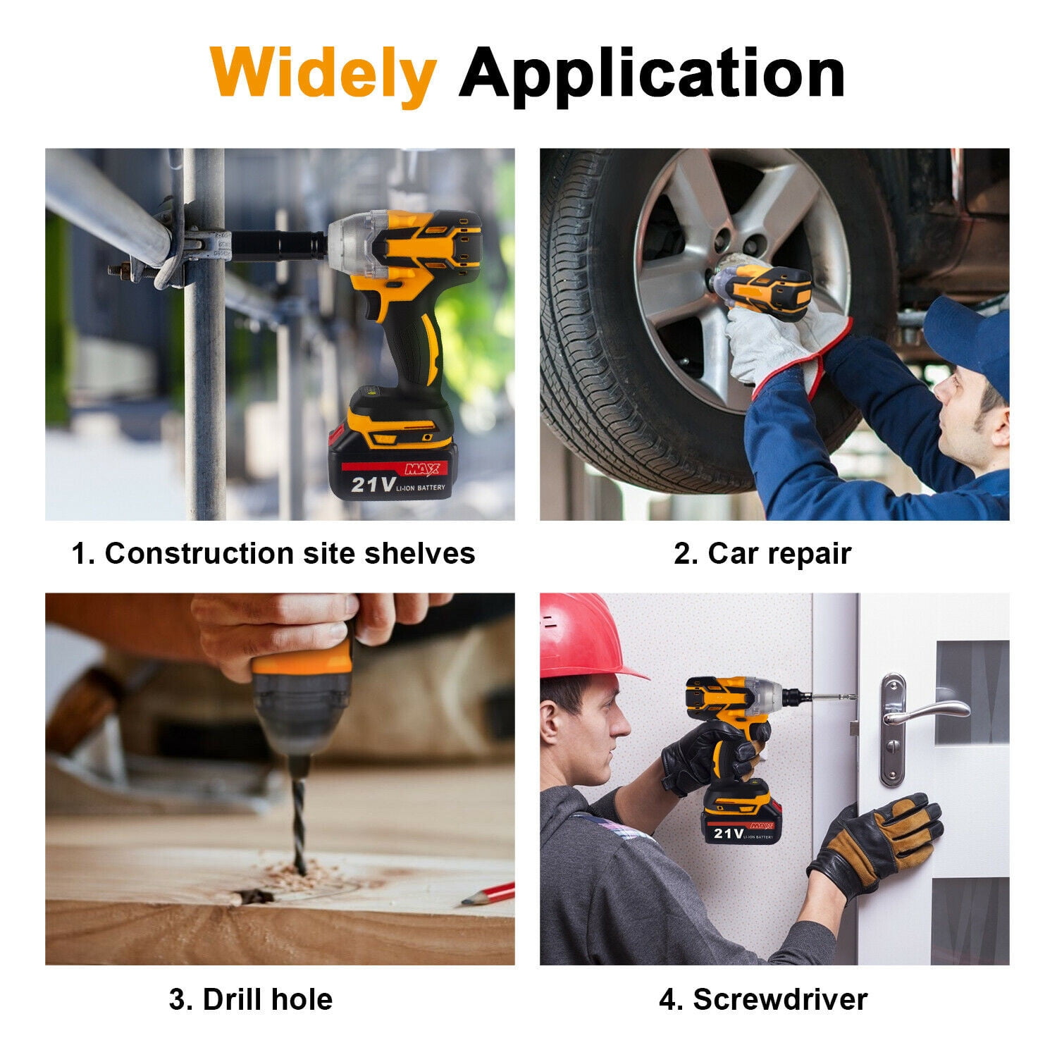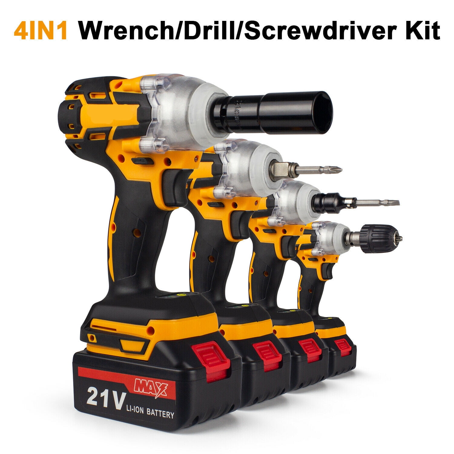 · Powerful Cordless Power Impact Wrench: This Impact Wrench has a powerful brushless motor, delivers a maximum torque of 800 N.M for fastening various applications. No load maximum speed of 2500r/min(frequency 1500r/min) for driving large fasteners quickly and easily. · Brushless Motor: Brushless motor for higher performance and durability with increased efficiency and runtime, less noise and sparkles compared to brushed motor. · 4 IN 1 Multi-Functional Cordless Impact Wrench, which can directly transform to Cordless Drill & Screwdriver,multiple conversion modes,meet your work needs anytime, anywhere.It is equivalent to buying three tools at one price. · Configuration: Come with 3Ah Li-Ion Battery,which can last for 1.5-2H hours.The impact wrench have 3-speed & stepless speed, you can adjust the speed at any time. Equipped with LED light, there is no hindrance to work in a dark environment. · Forward / Reverse Button: enables easily change rotating direction,can be used for tightening or loosening nuts and bolts. Robust design combines with aluminum alloy housing which prevents damage to the tool.