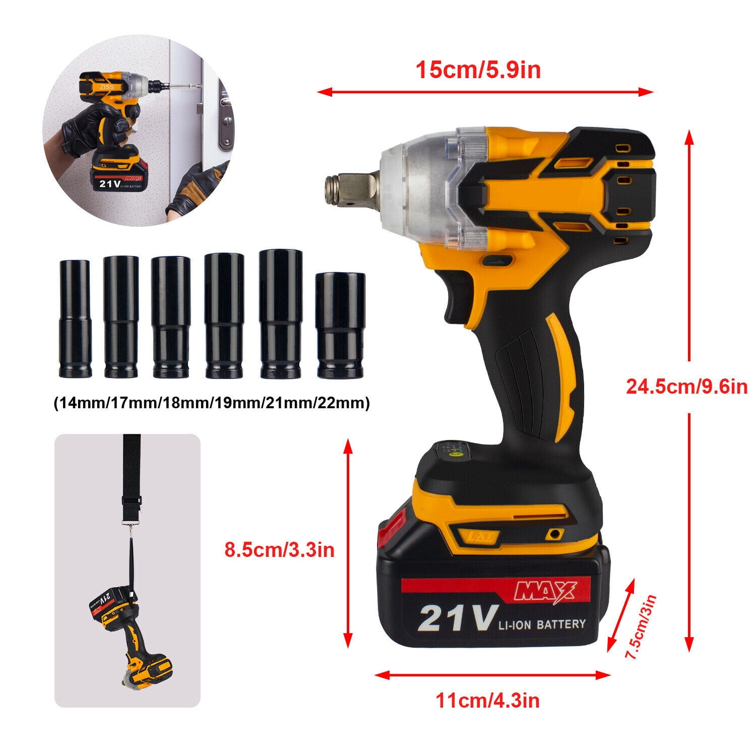 Item Description: Impact wrench:This cordless 20 volt lithium ion 1/2 inch square anvil automatic impact wrench allows you to tighten or loosen various nuts and bolts for home construction and construction tripods, and is widely used in daily indoor or outdoor. Brushless Motor:The built-in brushless motor enables the tool to run cooler and more efficiently, optimizes the use of battery energy, and extends the running time per charge by up to 50%. High torque and multiple speeds:800N.M high torque, 2-speed control and continuously variable switch. Forward/backward mode:Turn the diamond button to the left/right to enter the forward/backward mode, which can help you tighten or loosen the screws easily. Sturdy:All-aluminum head, sturdy and durable, good sealing effect; tungsten steel rotating shaft, impact resistance. With accessories:The kit is equipped with (14mm / 17mm / 22mm) wrench socket, which can meet the different needs of users. LED work light:The front LED work light can increase visibility, so there is no need to worry about working in a dark environment. 4000mAh large capacity battery:It is equipped with 4.0Ah batteries, provide longer working time. The upgraded lithium-ion battery has good conductivity, less loss, longer battery breakthrough time and longer service life. Specifications Condition:NEW Voltage:20V Max Battery Capacity:4000mAh Chuck:1 /2 inch Length:normal No-Load Speed:0-2800rpm Color:black & red Shipping:free shipping Warehouse:US warehouse Payment:paypal or bank transfer Max Torque:800N.m(370ft-lbs) Nromal Operating Torque:420N.m(310ft-lbs) Fast Charge:130min Advantages:LED indicator Package Included: 1 x 20V Impact Wrench, 1 x 4Ah Li-ion Battery, 1 x Charger, 1 x 14mm Socket, 1 x 17mm Socket, 1 x 22mm Socket, 1 x Shoulder/Hand Belt, 1 x Portable Storage Case .