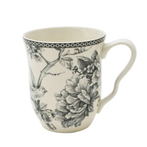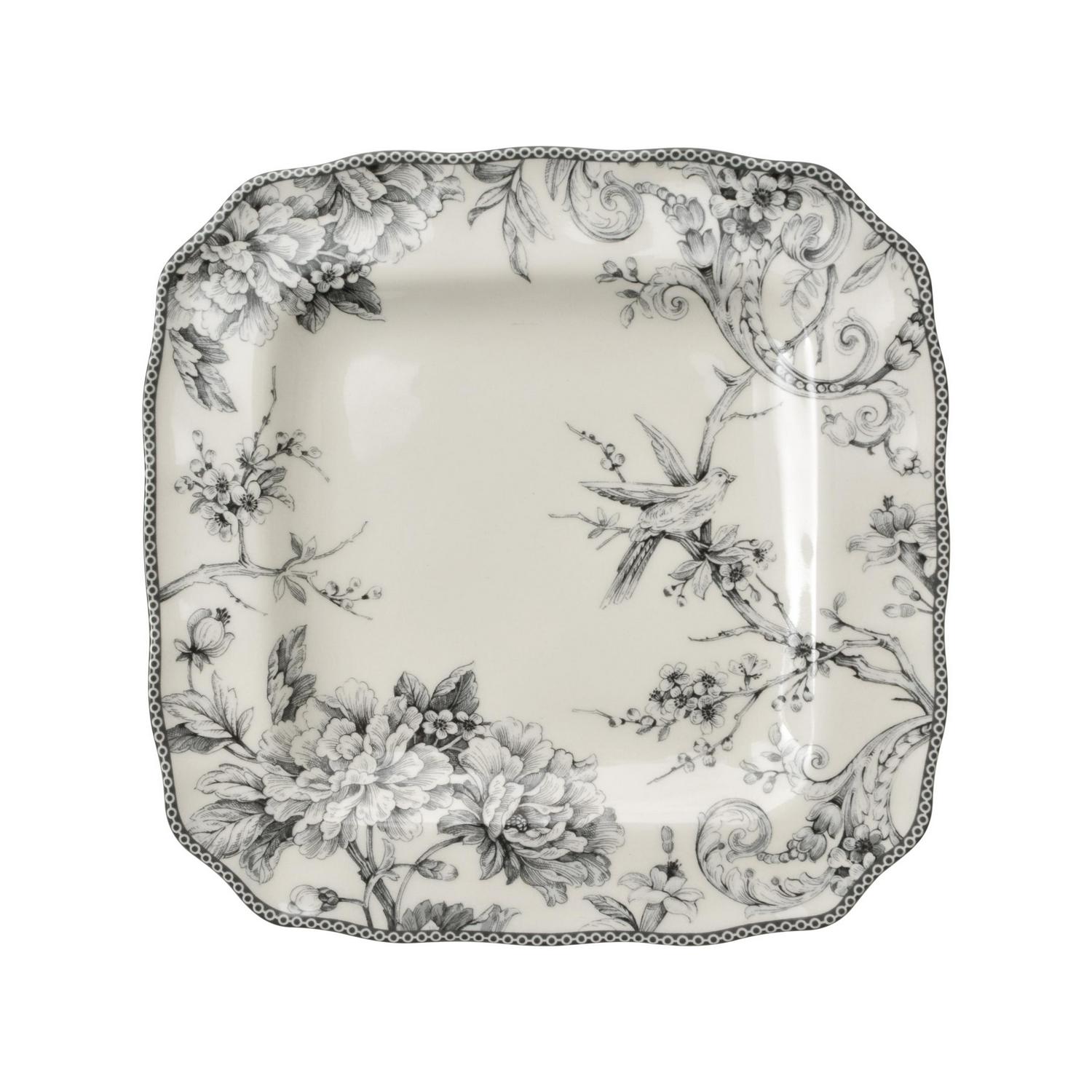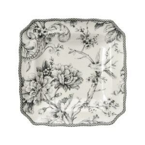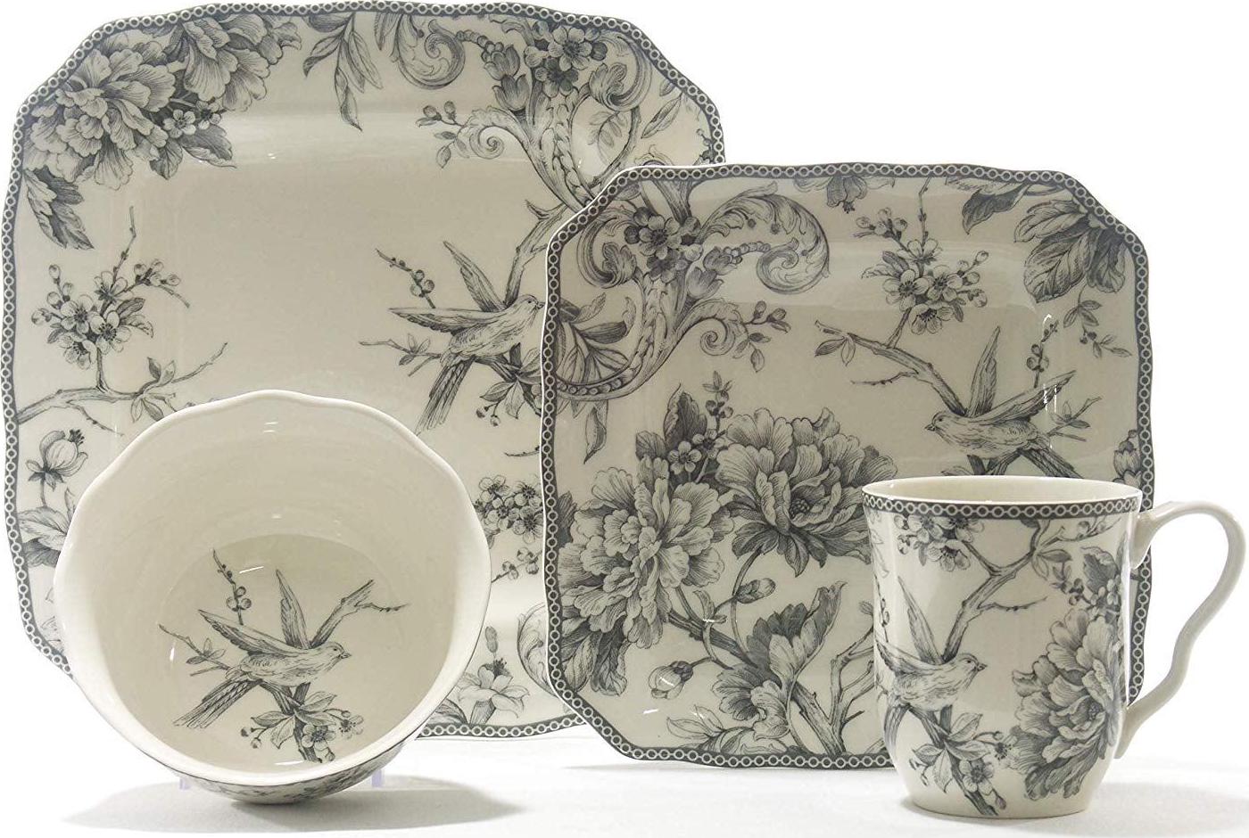 The Adelaide Dinnerware Collection in grey is a stunning and versatile porcelain dinnerware set that combines timeless elegance with practicality. Inspired by a 1770 Toile pattern, this collection features a hand-applied decal in an elegant grey hue, creating a romantic spring scene of birds and flowering branches on a creamy ivory backdrop. The hand-applied decal in grey showcases an intricate woodland tableau with birds and flowering branches, reminiscent of the classic Toile pattern. This design adds a touch of vintage charm and elegance to your table setting. The timeless elegance of the Toile pattern gives this collection a refined and sophisticated appeal that transcends trends and will remain stylish for years to come. Made of chip-resistant porcelain, the Adelaide dinnerware is designed to withstand the rigors of everyday use, ensuring its longevity and durability. The dinnerware set is safe for both the microwave and dishwasher, providing convenience and ease of use for both heating and cleaning. While the pattern and style are truly delightful, the set is also designed with practicality in mind. It’s suitable for everyday use and special occasions, making it a versatile addition to your dining collection. The 16-piece set includes service for four people, making it ideal for family meals, gatherings, and entertaining. The set comprises four square dinner plates, four square salad plates, four cereal bowls, and four matching mugs.