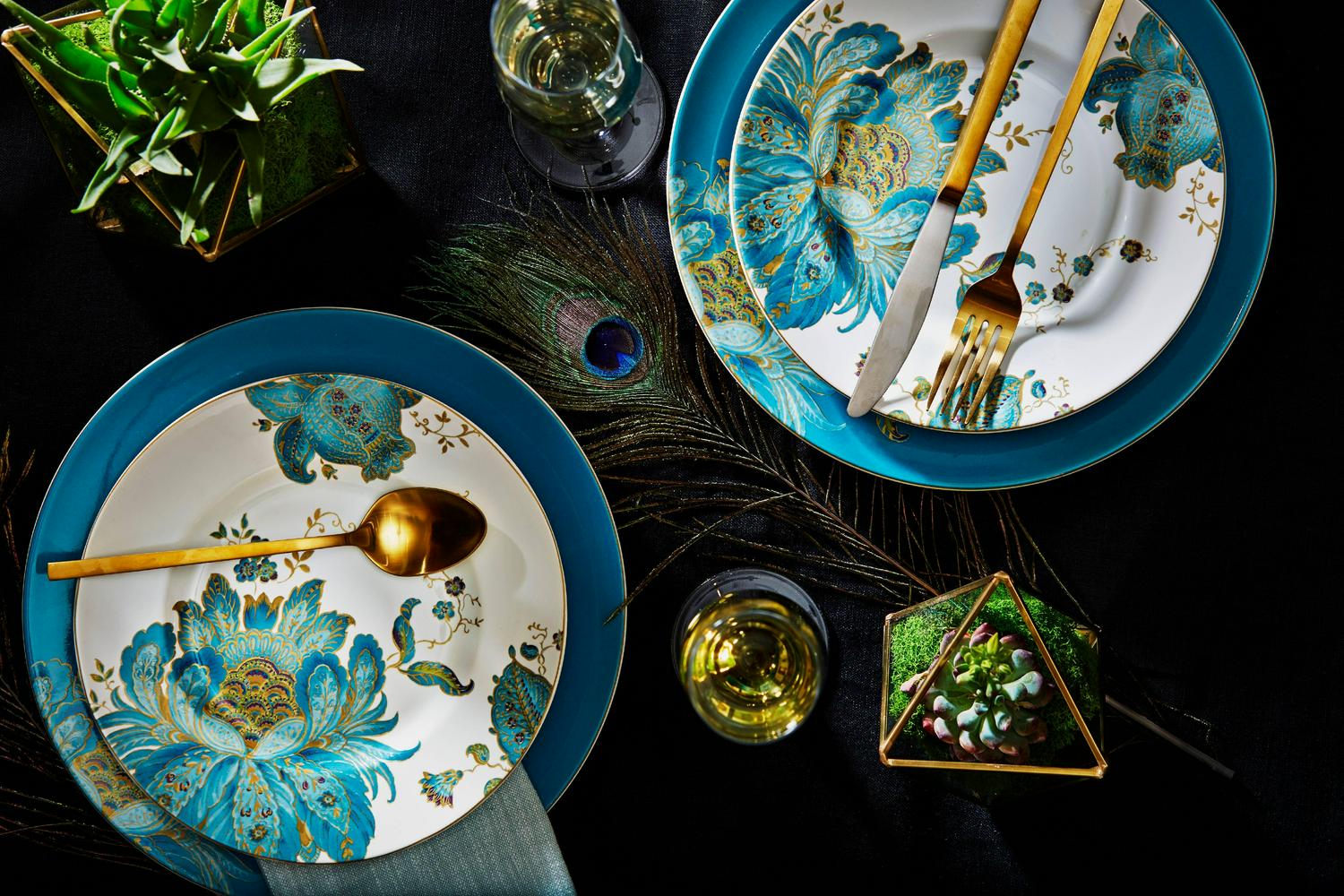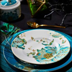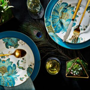 Immerse yourself in the enchanting allure of 222 Fifth’s Eliza Dinnerware Collection, where an iridescent floral motif in resplendent jewel-toned teal and radiant gold hues transforms your dining table into a canvas of opulent beauty. With a captivating charisma and a vibrant panache, this collection exudes an air of refined elegance that will captivate your guests and elevate your dining experience. Inspired by the resplendent colors of the peacock, a magnificent bird that graces the landscapes of Indonesia alongside our ceramics factory, the Eliza Dinnerware Collection pays homage to the natural beauty that surrounds us. The intricate iridescent floral pattern mirrors the majestic plumage of the peacock, infusing your table setting with a sense of regal grandeur. The oversize florals, adorned with delicate peacock feather details, seamlessly merge elegance and effortlessness, adding a touch of opulence to every dish you serve. Each piece in this sixteen-piece set is a masterpiece in its own right, meticulously designed to create a harmonious symphony of colors and motifs. The bold-rimmed dinner plate commands attention with its striking presence, setting the stage for a feast fit for royalty.