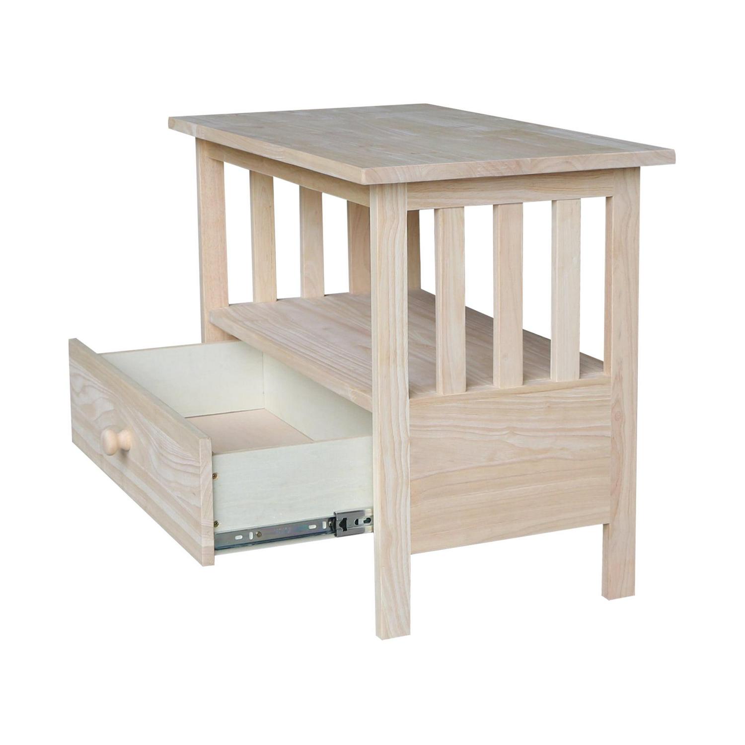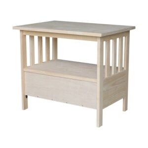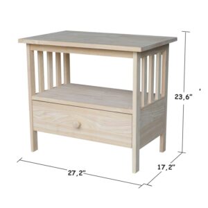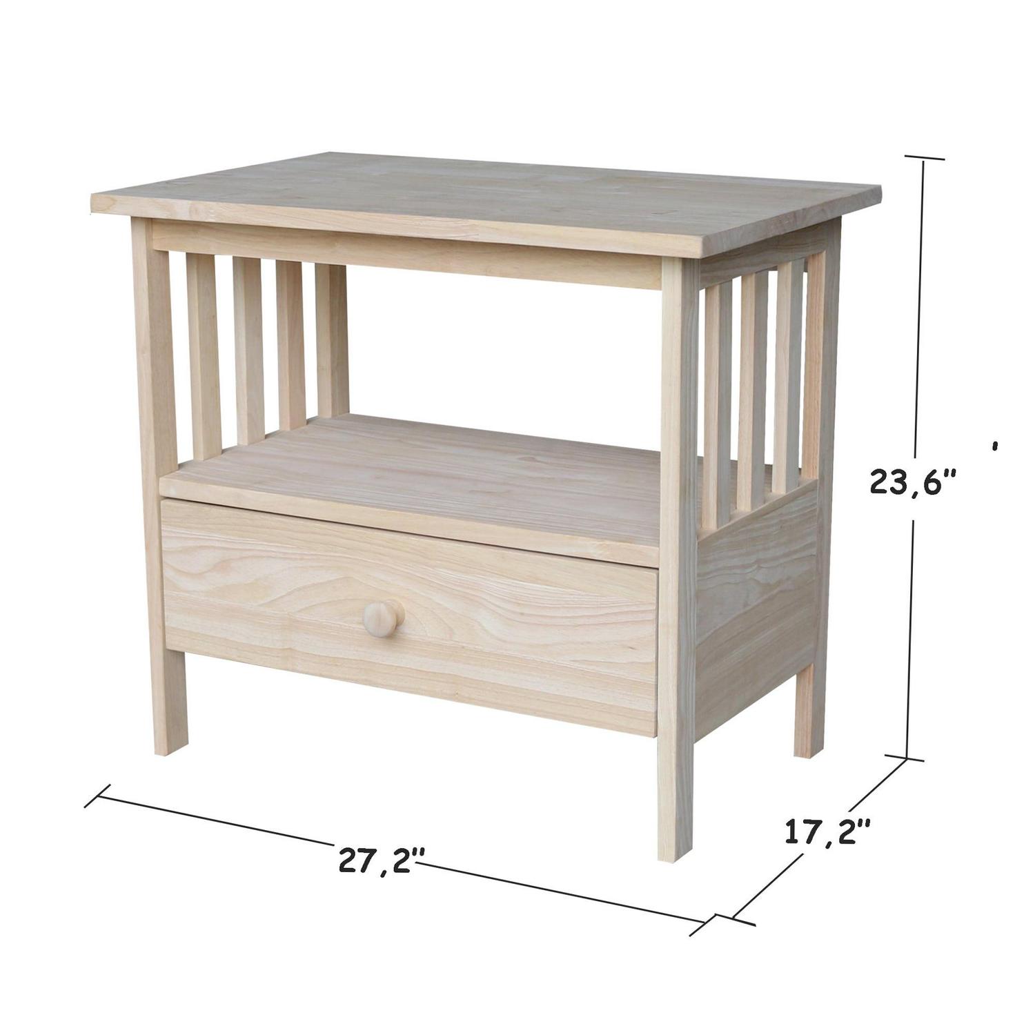 Open shelf. Bottom drawer. Made from Para Wood. Unfinished stand. Minimal assembly required. 18 in. D x 28 in. W x 23.75 in. H. Stylish and functional, this Mission style wood TV stand is perfect for den, guest room, game room, or anywhere! It features traditional slatted sides, shelf, and the storage drawer has a wood knob. It comes unfinished and ready for you to stain or paint.