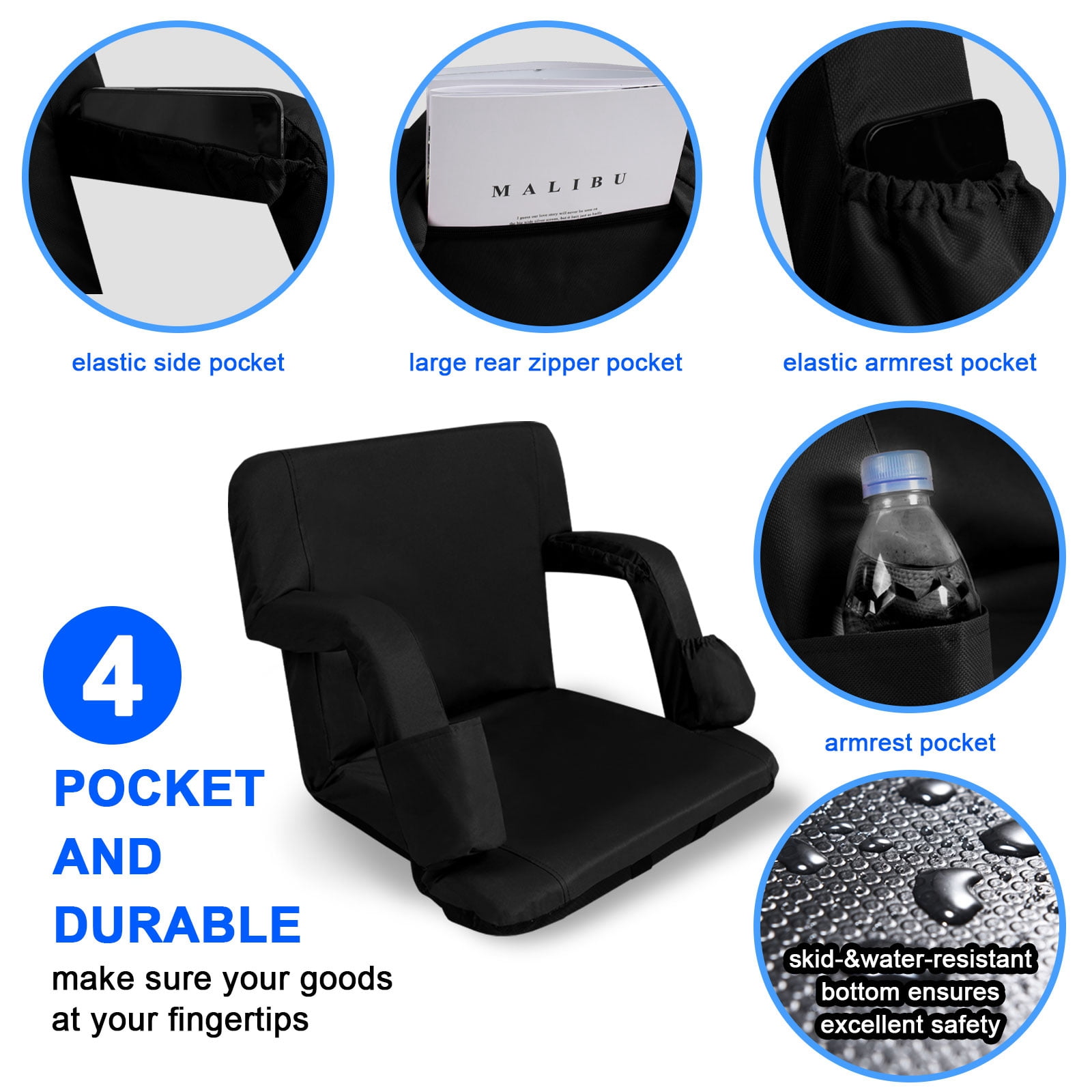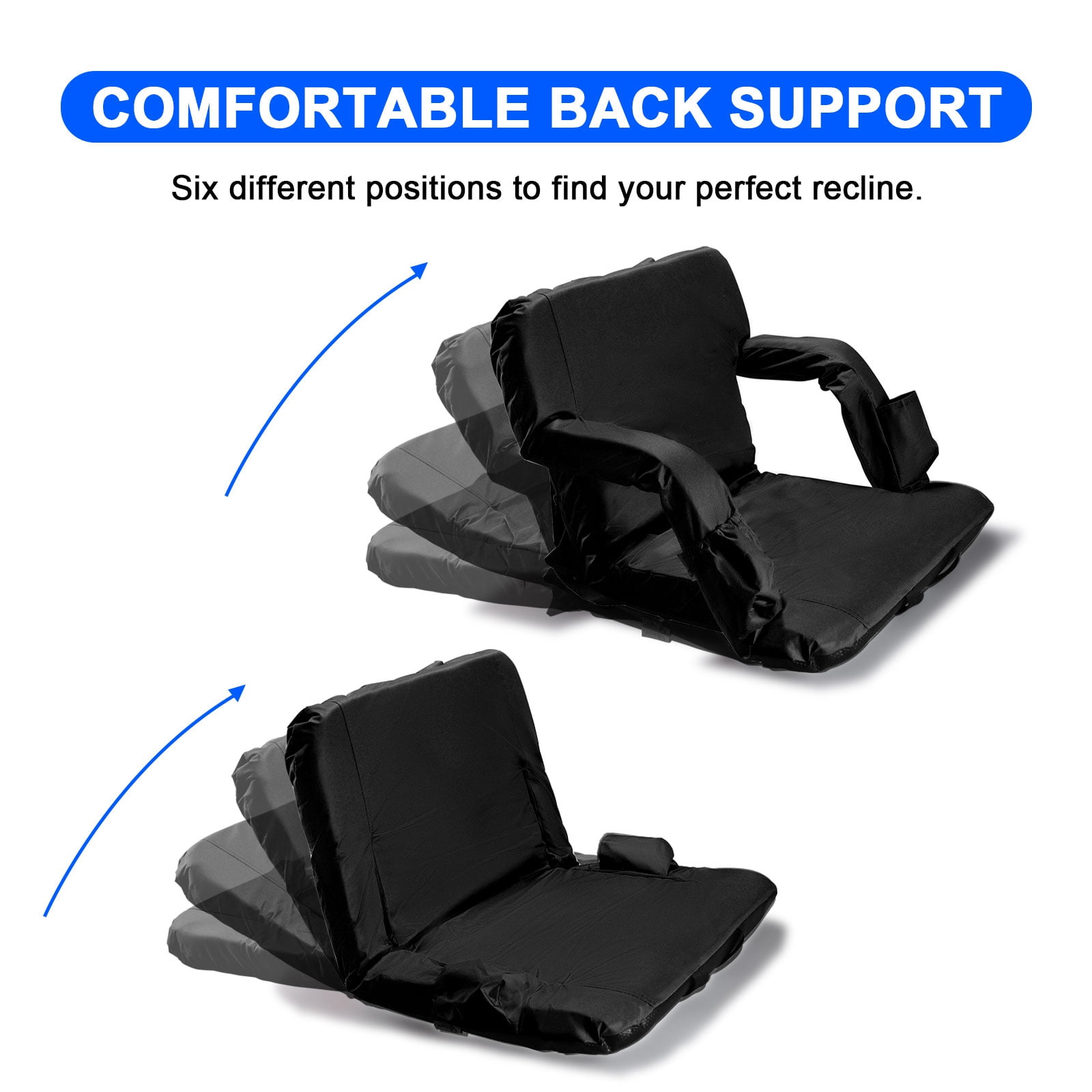 Exceptional Comfort — stadium seat has 3 thick layers of foam inside and six different positions,so that you can find your perfect recline Extra-Wide Size — bleacher chair provides 2 width choices-a comfortable 19.4″ with armrests up, or a generous 24.4″ with armrests down Multiple Pockets — From the large zippered one to the small&handy armrest ones,make sure your goods at your fingertips Water-resistant — 600D water-resistant cover and the water-resistant underside keeps your stadium seat dry and easy to clean,allows it to be used in all types of weather conditions for a variety of events Anti-Slip — non-skid bottom keeps the bleacher chair from toppling backward, no matter which of the six reclining positions you choose. Easy to take — The stadium seat is lightweight(8.8lbs),Whether heading into a stadium, to the beach, out camping or to outdoor events,when it’s time to pack up and go, fold the seat in half to easily tote as a backpack.