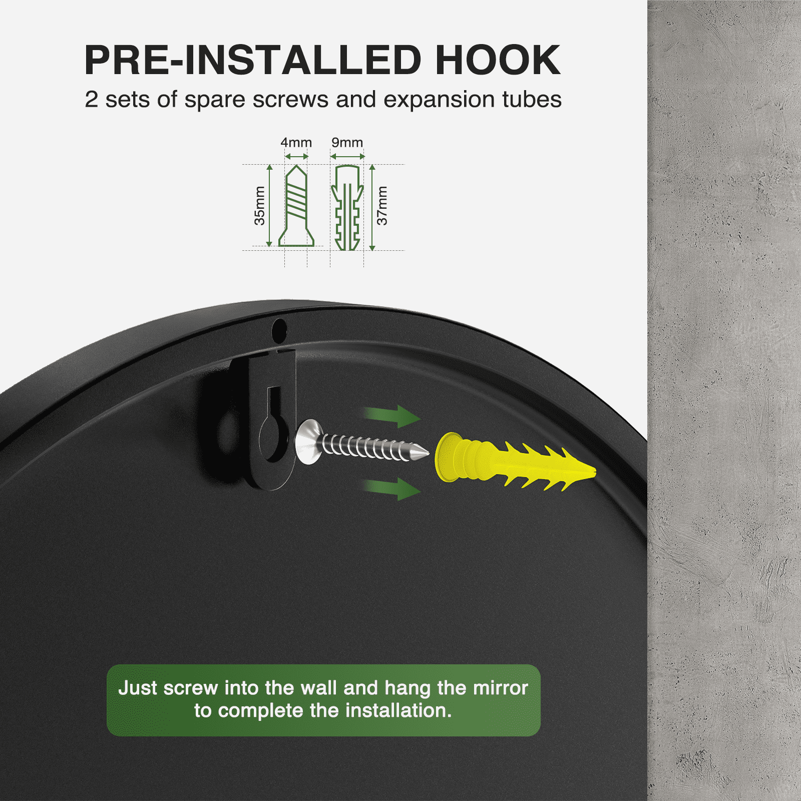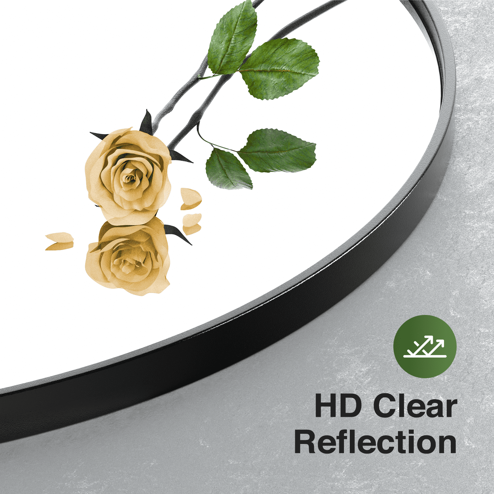 Large Black Circle Mirror 24×24 inch, oversized black wall-mounted circle mirror with clear and distortion-free reflections. High-quality materials Featuring an iron type frame, unlike aluminium, our iron type material is heavier, better textured. Back in MDF With a 2.0 MDF backing, there is no need to worry about the mirror breaking as it is highly explosion-proof. Widely used Our round wall mirror can be used in bedroom, bathroom, vanity room, entryway, hallway, etc. What’s in the box 1 x 24” Black Round Mirror 1 x Screws 1 x Manual