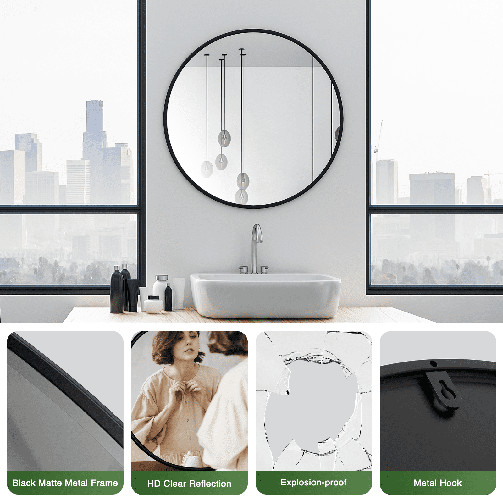 24 inch Black Circle Mirror for Wall, Metal Frame Vanity Round Mirrors, Wall Mounted Matte Home Decor Mirror for Bathroom Living Room Entryway Hallway