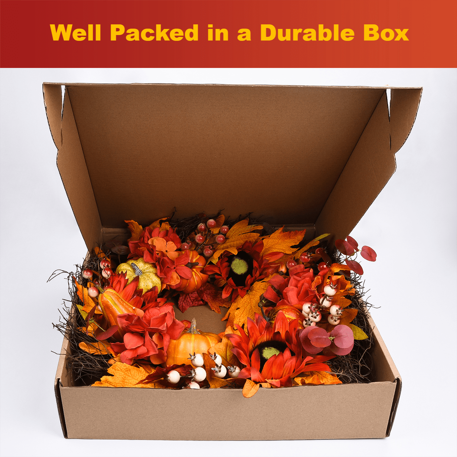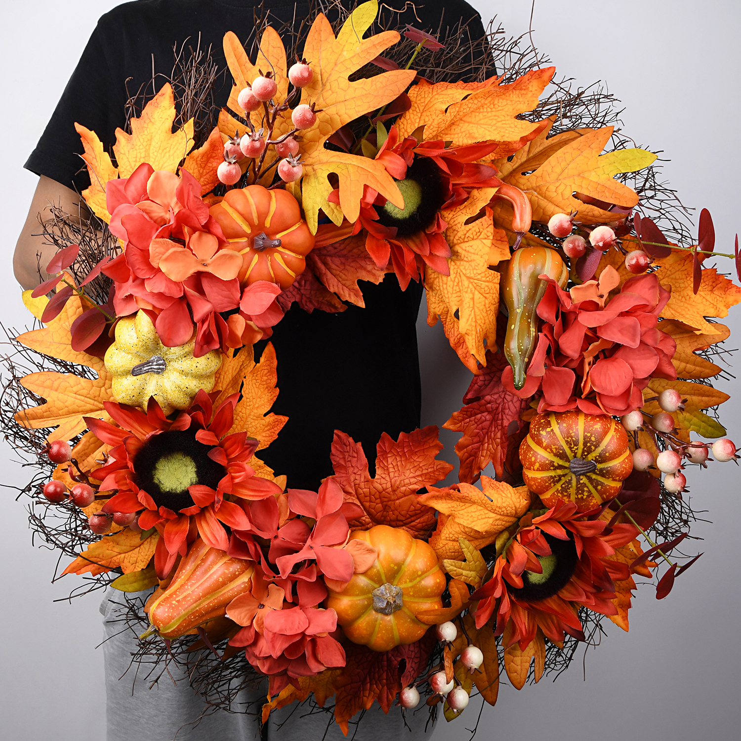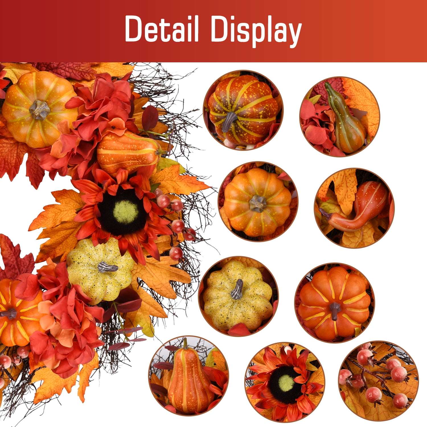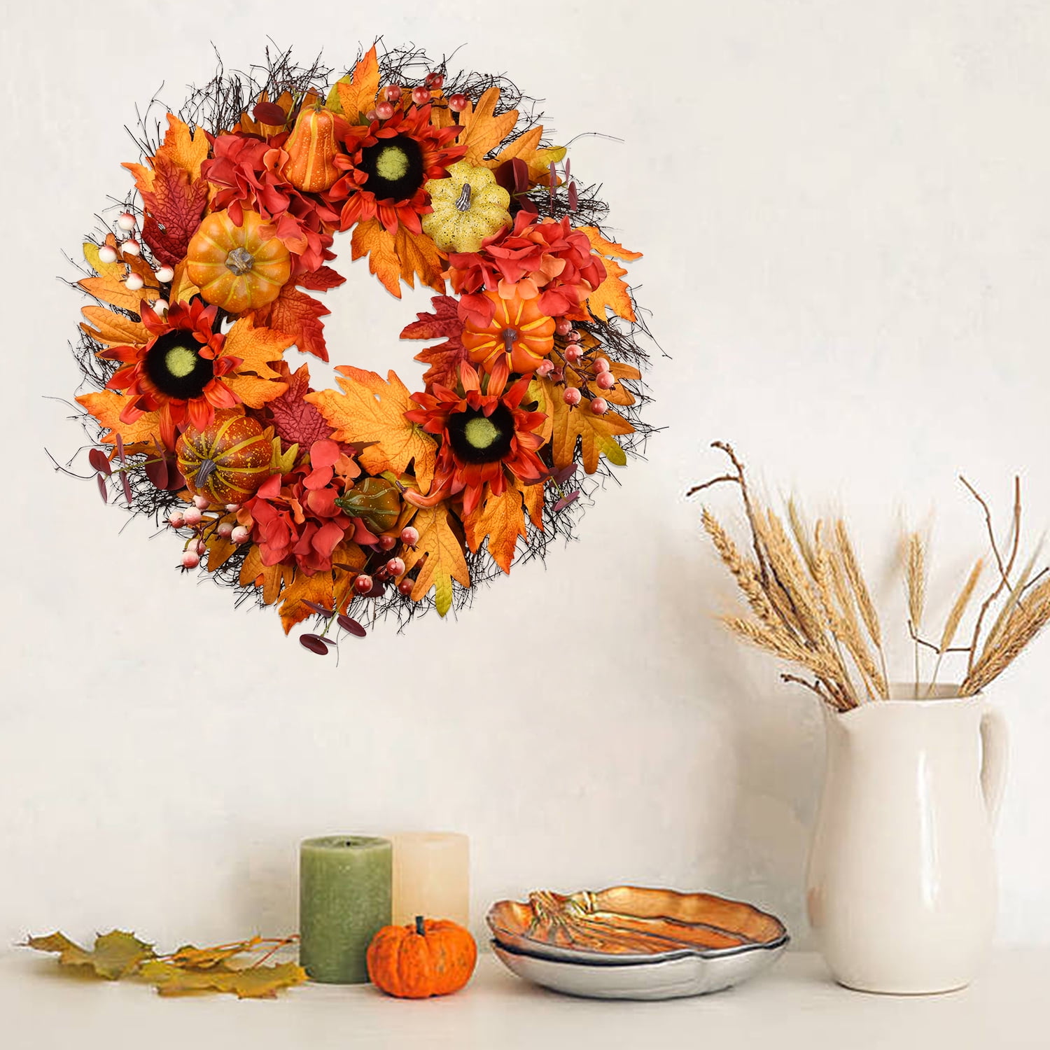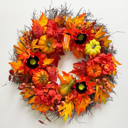 Harvest Wreath. Our 24inch handcraft wreath is made of sunflowers, berries,pumpkins, and colorful maple leaves which are on a natural grapevine wreath base. Our 24inch autumn sunflower wreath is perfect size for the front door, indoor, outdoor, wall, window, fireplace, or above the mantle in your home as a warm inviting welcome sign to your family and friends, also as an excellent gift choice Our Halloween pumpkin wreath is well packed in a durable box. A great gift to all friends and family.A must-have front door wreath for the fall season outdoor. A perfect wreath for all festivel. Our havest wreath is a great choice for Thanksgiving Halloween All the items you bought from our store will get a quick response within 24 Working days, and 3 monthly warranty for the day you receive them.1 year of maintenance service.