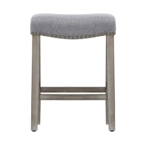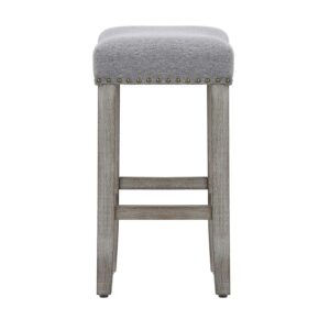 Ideal for your kitchen and home bar, this 24 Inch stool will bring you style and comfort with its well-cushioned saddle upholstered seat. Crafted from high quality solid rubberwod, this bar stool boasts an undestated craftsmanship that makes it perfect for your kitchen, dining room, or bar area. Designed with comfort in mind, indulge yourself in the bar stool’s high denisty foam cushioning. Featuring a linen seat, polished bronzechrome nail head trim, and antique gray stained wood legs with perfectly placed footrest.