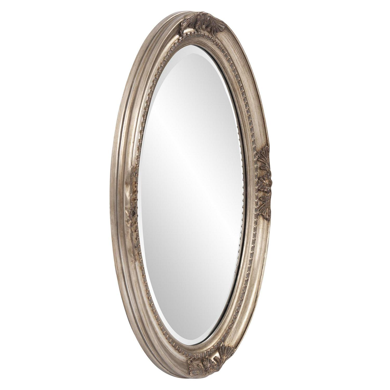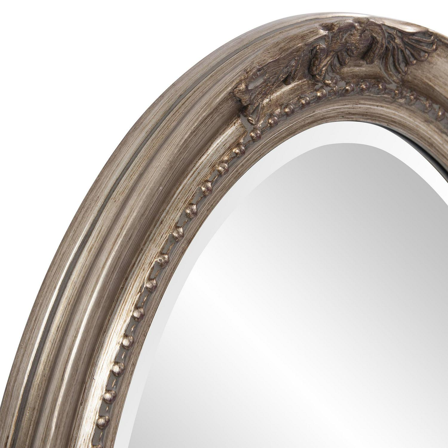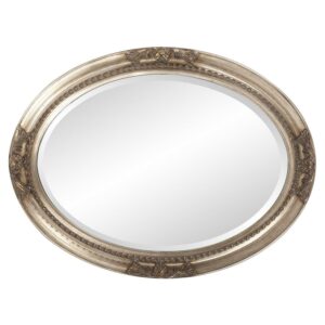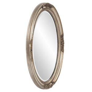 The Queen Ann Mirror features an antique silver leaf finish. The oval frame is made from wood and is accented with a beaded textured inset and decorative adornments on each side of the frame. For more added detail the mirror features a one inch bevel. Its Traditional style makes this mirror a favorite for bringing some flair to your decor. This simple yet stunning piece would be a great addition to any room. It is a perfect focal point for an entryway, bathroom, bedroom or any room in your home. D-rings are affixed to the back of the mirror so it is ready to hang right out of the box in either a horizontal or vertical orientation!.