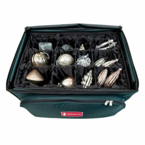 This ornament storage bag is the perfect solution to keep your cherished ornaments safe and organized throughout the year. This spacious bag is designed with convenience and protection in mind ensuring that your holiday decorations remain in pristine condition. Featuring an adjustable tray system this storage bag can accommodate up to 48 ornaments of various sizes allowing you to customize the compartments to fit your specific collection. The adjustable dividers provide a secure and snug fit for each ornament preventing any shifting or damage during storage. Crafted from durable and sturdy materials this storage bag offers reliable protection against dust moisture and accidental bumps. Product Features. Ornament storage bag. Fits a variety of differently shaped ornaments. Holds up to 48 ornaments up to 6″ tall. Acid-free fabric trays prevent discoloration. Tightly woven Poly-Blend fabric keeps contents dry and dust-free. Inner self-standing frame increases support. Includes a front pocket for miscellaneous storage. Reinforced padded handles ease carrying. Fabric hangs from the adjustable divider rods providing a natural â air cushion” protection. For indoor use. Dimensions: 24″H x 19″W x 27″D. Material(s): polyester