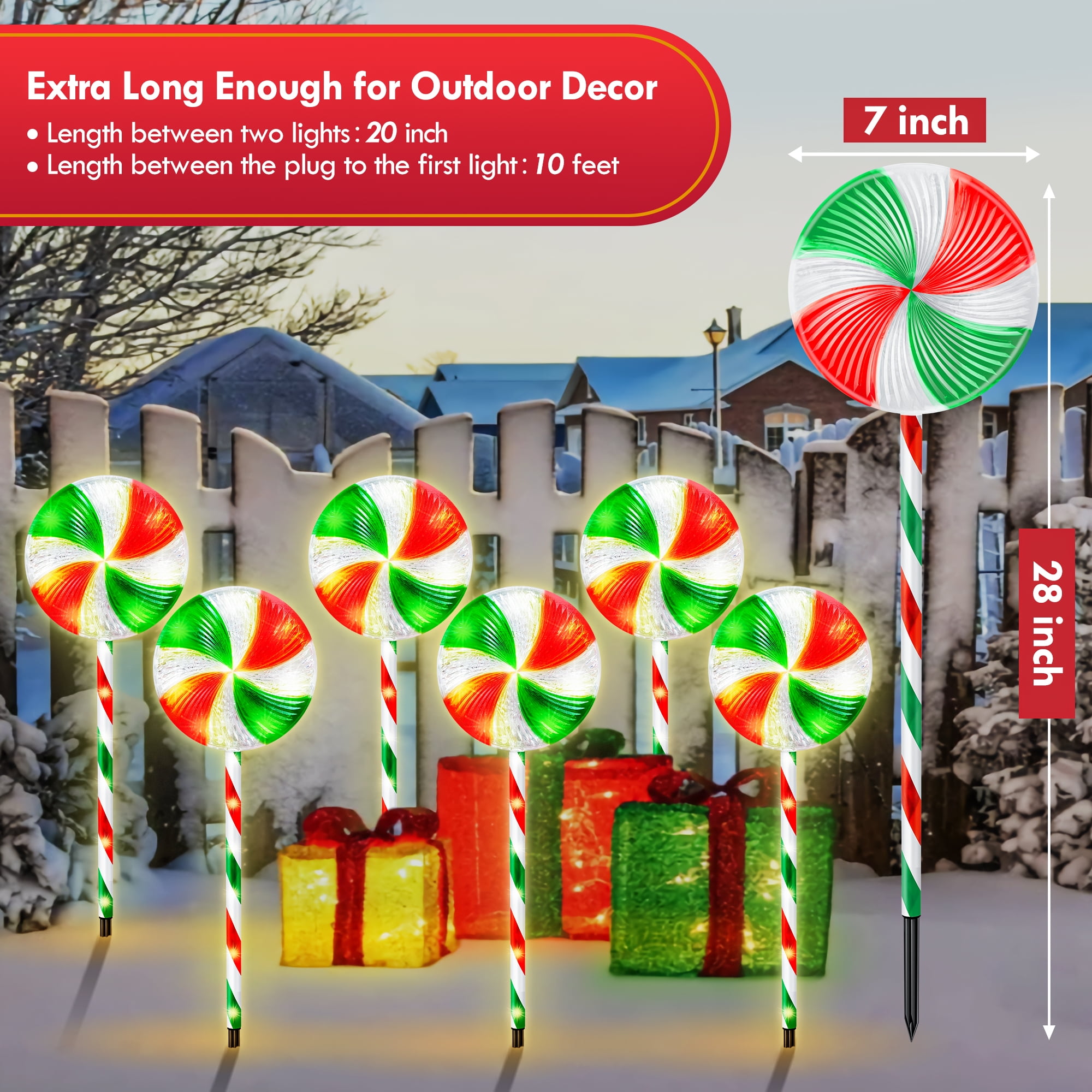 28 Inches Large Size Christmas Pathway Light with Lollipop Featuring with 120 bright warm white LED lights and a special lollipop topper, this Christmas lollipop light string adds a romantic and cozy touch to your holiday display day and night. With a total length of 28 inches including the sticks, these outdoor Christmas lights are larger than other products on the market. 120 Super Bright LED, 8 Lighting Modes, Can Be Steady or Flashing This upgraded lollipop Christmas pathway light offers 8 lighting modes, including steady on, combination, in waves, sequential, slow glow, chasing/flash, slow fade, and twinkle/flash. You can easily change the lighting mode using the plug. The flickering lights will make your holiday display even more attractive. Linkable End to End, Up to 3 Sets Linkable end to end, up to 3 sets can be connected together. If you purchase additional sets. With low voltage and high lumen LEDs, these Christmas candy cane pathway lights are suitable for both indoor and outdoor use. Easy to Set Up, Extra Long Enough for Outdoor Decor Designed for in-ground installation with ground stakes, these lights are perfect for decorating the walkway, lawn, yard, front door, garden, pathway, and more. With 10 feet lead power cable, each interval is 20 inch, this set of 6 lollipop light is long enough to be nicely spaced out. Colorful and Durable for Outdoor Christmas Display Made with premium materials, these outdoor Christmas pathway lights can be reused for years, making them environmentally friendly and cost-effective. The PCB features over-current, overcharge, and overheat circuit protection, ensuring safety and reliability during use. Specifications: Light Color: Bright Warm White Led Quantity: 120 Led Led of Each Candy Cane: 20 Led The Height of Each Candy Cane:23 Inch With Stick:28 Inch The Length Between Two Candy Canes:20 Inch The Length Between The First Candy Cane To The Plug: 10 Feet Q&A: 1. Is it link-able? can I put them together and use one plug? Yes, these candy cane lights is link-able, please find the user manual, follow the guidance to connect up. Don’t worry, it is very easy to assemble, each candy cane light has reserved connectors, just plug and play. 2. Do they blink or stay lighted? It has 8 lighting modes, all included, and you can choose whatever you like, which is suitable for your house display. F.Y.I, the switch is on the plug, and 1 button corresponds to 8 modes. 3. Are they led lights? Or just normal bulbs? They are LED light strings, brighter and safer than normal bulbs. Package Include: Set of 6 Christmas Lollipop Lights