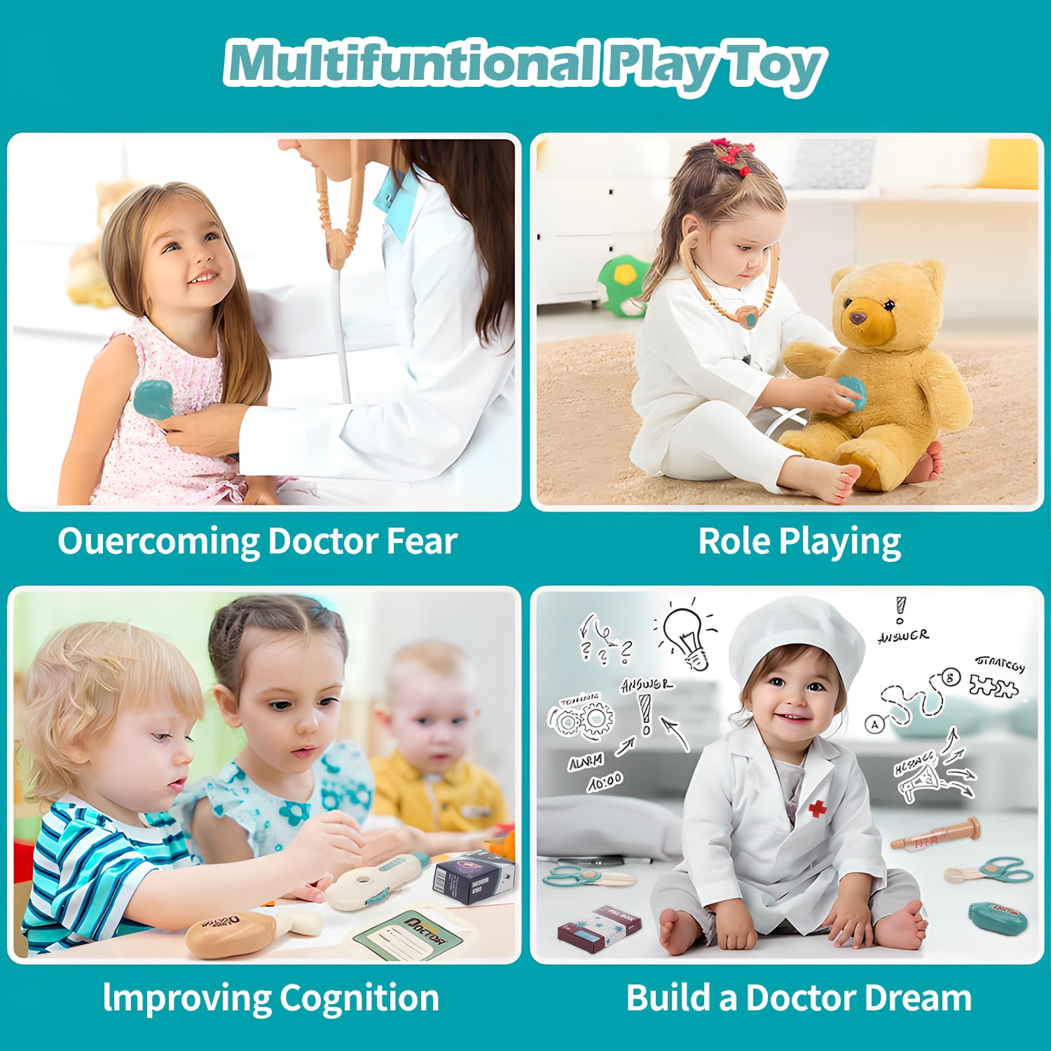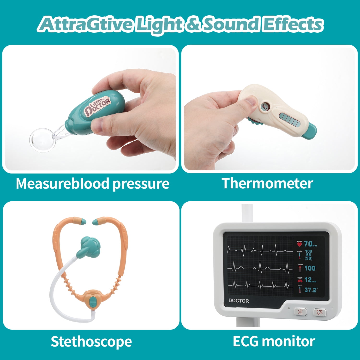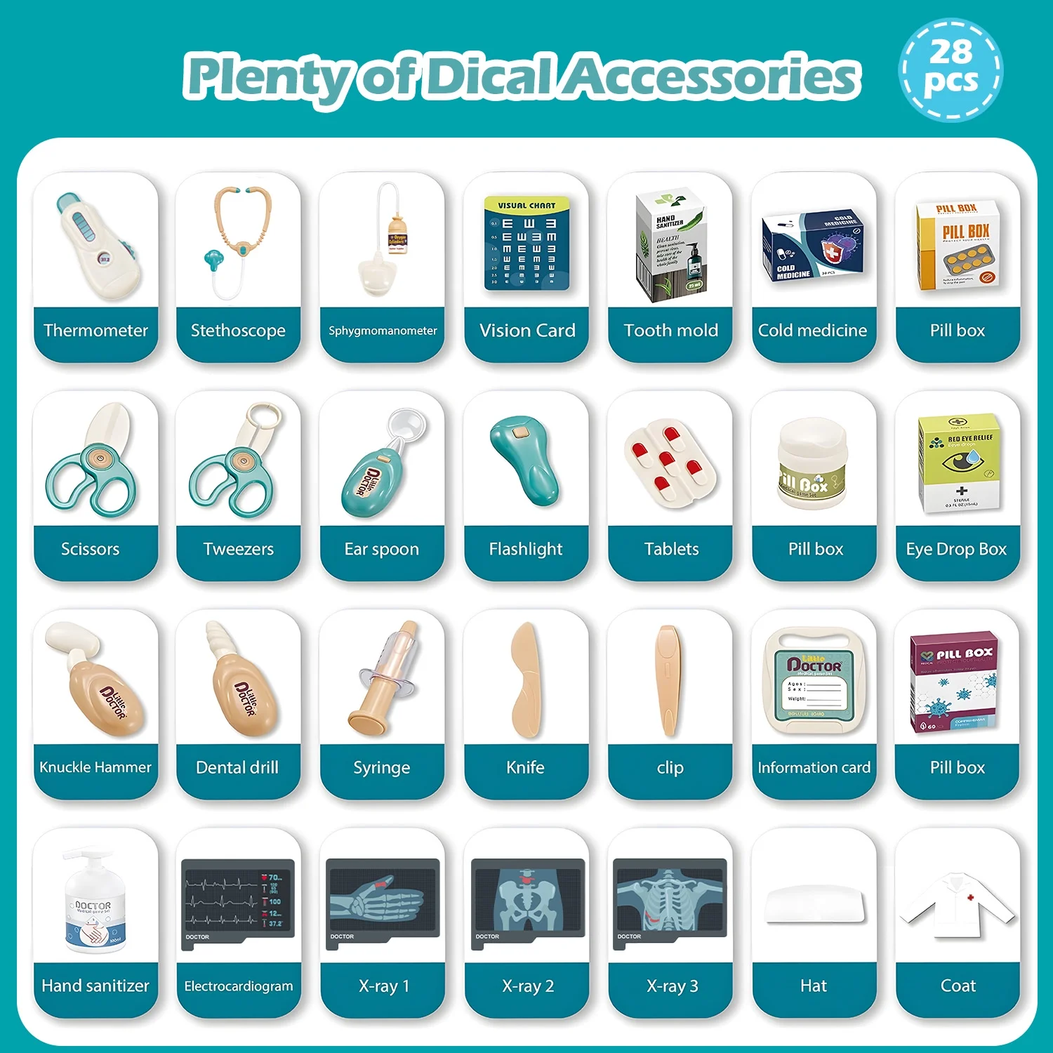 Use the this Pretend Medical Station Toy Set to let your child unleash their imagination and creativity. They can experience the fun of being a doctor and enjoy hours of engaging playtime. With 28pcs accessories included, your little one can role-play a variety of medical procedures and scenarios. Donning the doctor coat, children can step into the roles of a doctor or nurse. Our kids doctor pretend play set design with smooth and rounded edges, no sharp points or corners which is safe for kids during play. This medical toys are made of environmentally friendly and child-safe plastic, BPA free. Perfect for party, pretend play, role play, school classroom, holiday toy gifts, Christmas gifts and more. This kids doctor kit is recommended for kids 3-8 years old.