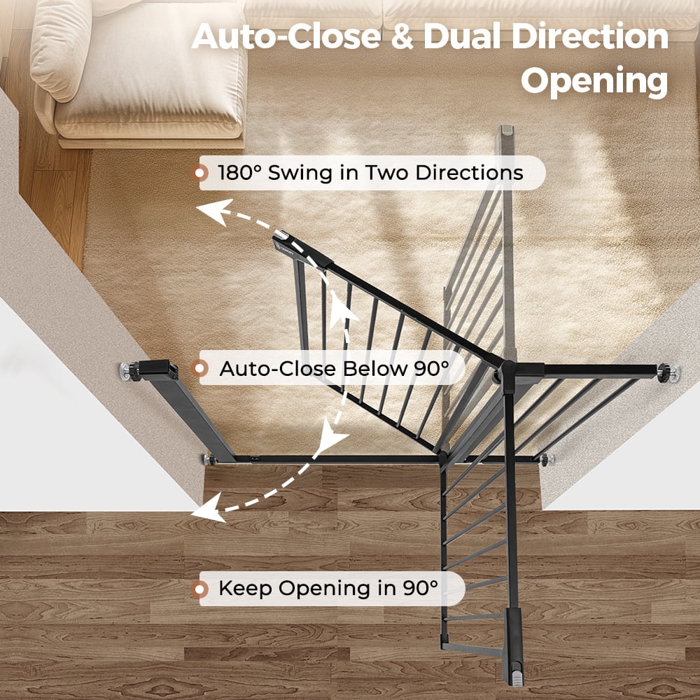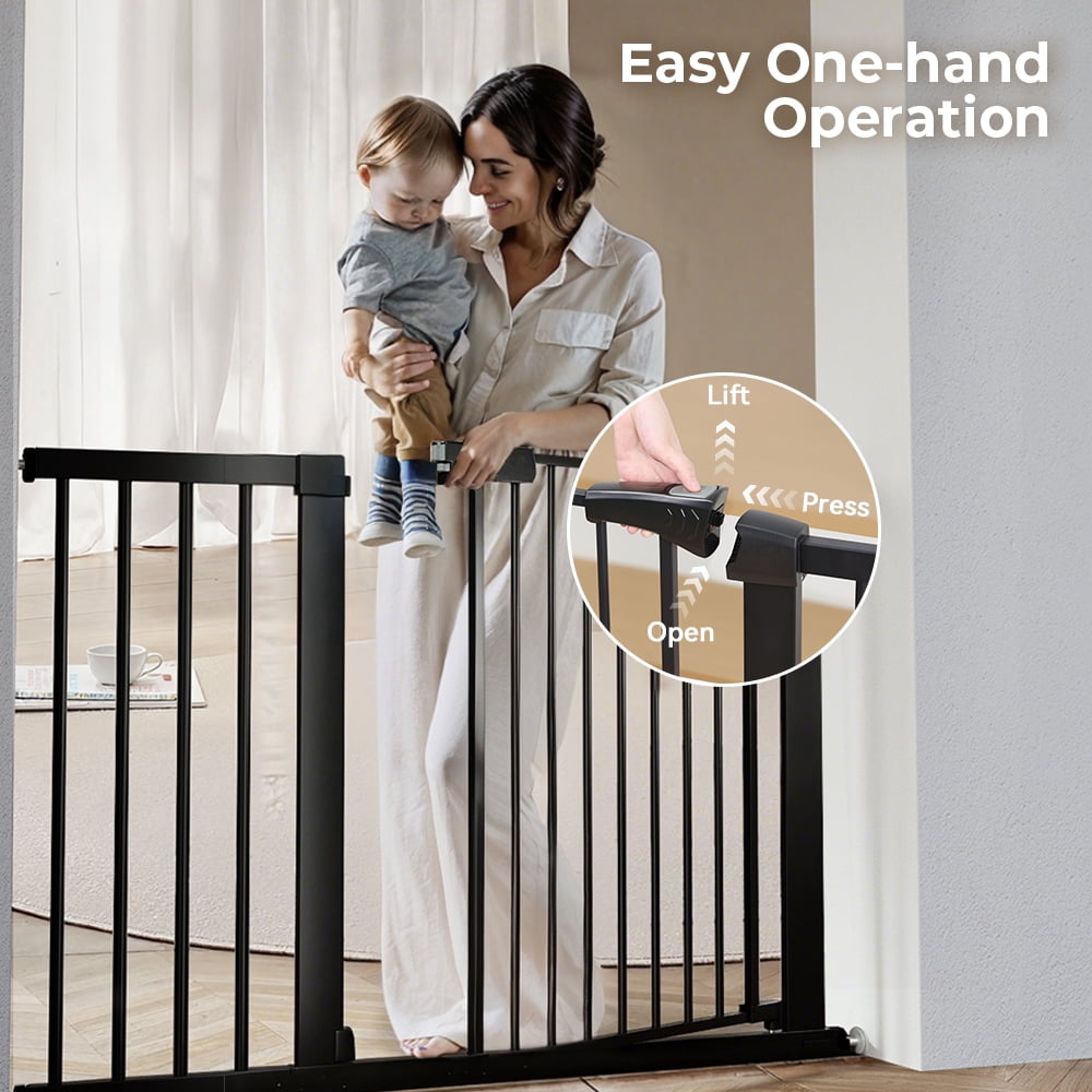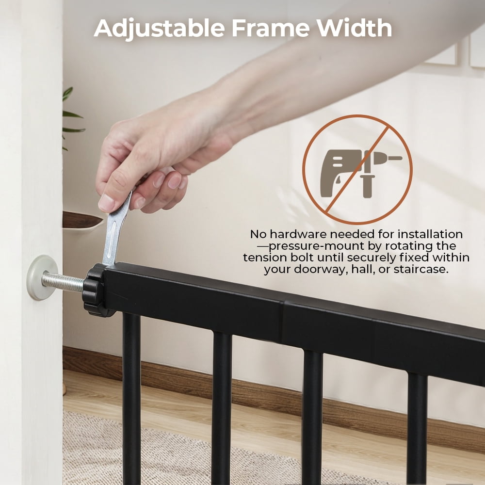 Fits openings 29.5-43.3 inches Wide. Stand 30 inches tall. Perfect for doorways, hallways, the bottom of stairs, kitchens, laundry rooms, bedrooms, and playrooms. Notice: Must measure your openings before purchasing this extra wide gate. Upgraded Double-lock system, press two buttons to open the dog gate. No lift, no effort. No worries about forgetting to lock the dog fence, it will close automatically, easy one-hand operation. The large 23.6 in walk-thru gate makes it easier to walk. Heavy duty steel frame pet gate can defend against up to 100-pound impacts by your pets. Never worry your pets jump over the gate. Simple pressure-mounted installation requires no tools drilling. Friendly Warning: If using the baby gate at top of the stairs, hardware-mounted installation is mandatory. 1 x Main Gate with Door 3 x Extension Panels (2×2.75″ & 1×5.5″) 4 x Tension Bolts 4 x Wall Cups 1 x Wrench 4 x Screw Large & Extra Wide Extra Safety Auto Close Gate Durable Construction Easy to Install Color: White/Black Material: Steel, PP Fits Openings: 29.5″-43.3″ Wide Height: 30″ Walk-through Width: 23.6″ Pressure Mounted Installation: Yes Hardware Mounted Installation: Yes (hardware included) Upgraded Double Lock: Yes Shipping Weight: 14.8lbs