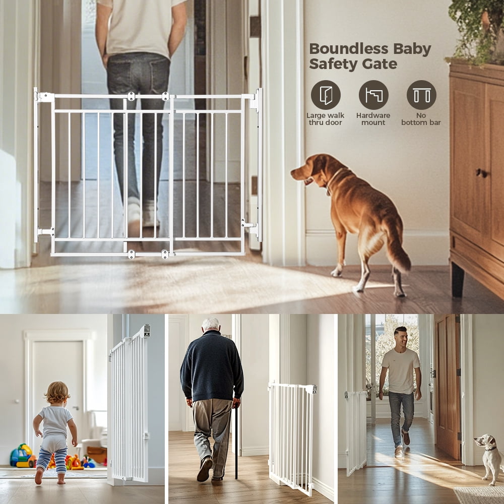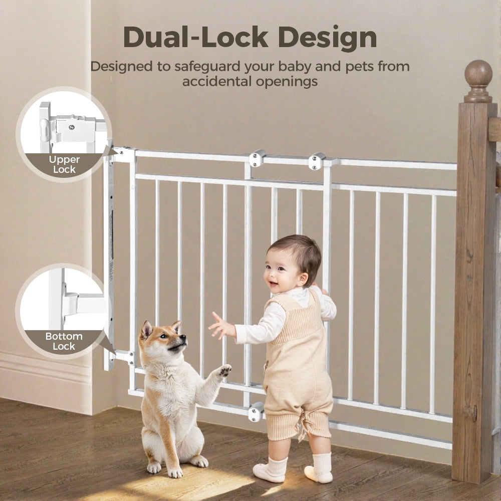 29.5-48.4” Safety Gate Extra Wide Walk Thru Baby Gate for House Stairs Doorways Hallways. Kid-safe Double Locking, Easy One-Hand Operation. More safety with a double-lock, difficult for your baby to open. Press the two buttons on the handle, then lift the gate to open. No need to worry about forgetting to lock the gate, since your gate will close itself up to 90°. (More than 90° will stay open.)The door can swing in both directions, allowing it to fit many more spaces.