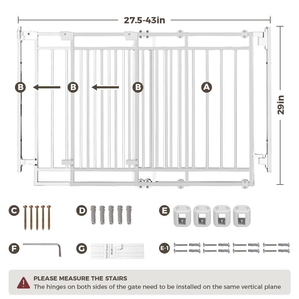 Specifications Brand: SINGE Manufacturer: SINGE Color: Black Material: Metal Type: Top of Stairs, Doorways Fit Openings: 29.5-48.4” Baby Gate Height: 30″ Installation Method: Pressure Mounted OR Hardware Mounted for Extra Safety SelfClose for Both Direction: Yes Pet-Friendly Safety Gate Featuring a lockable pet door measuring 8.9 x 10.6 inches, this gate ensures easy pet access while maintaining family member safety. It’s perfect for managing pet routines and preventing disputes. Versatile Width for Diverse Settings With a width adjustable from 29.5 to 48.4 inches using included extensions, this gate is suitable for doorways, hallways, stairs, and outdoor access points. Ideal for areas with pet supplies or litter boxes. One-Handed Operation A simple buckle mechanism enables easy, one-handed operation. An auto-closing feature is activated when the gate’s opening angle is less than 90°, ensuring secure confinement.